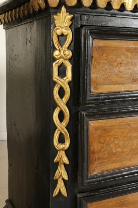 Couple chests in Walnut three drawers with inlaid by fogliacee and floral scrolls in solid Maple insert toppo. Applied with carved and gilded pilasters shaped uprights. Undermount lambrecchino frame gilded. All mouldings are ebonized frames. Feet on the jar. Interior spruce and Poplar.