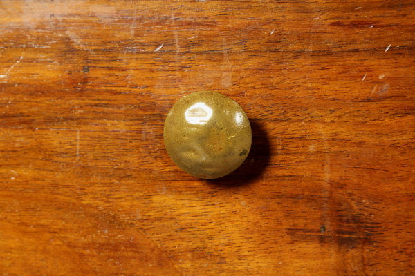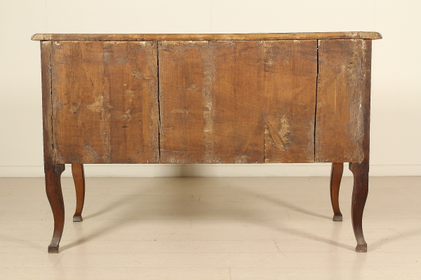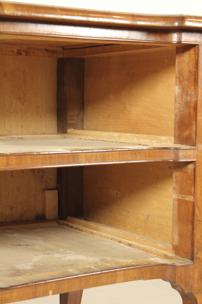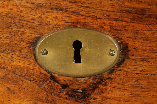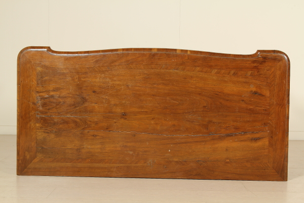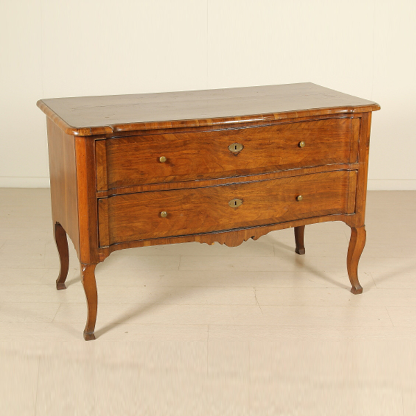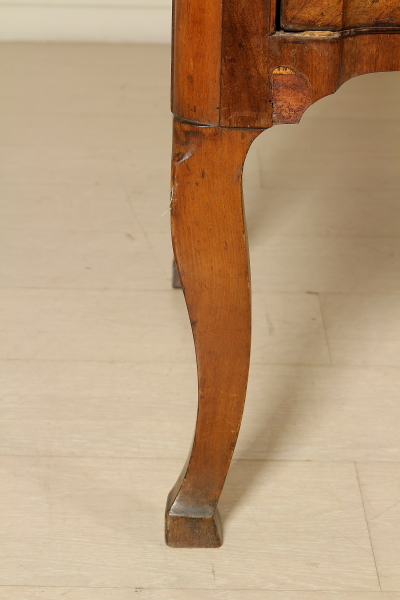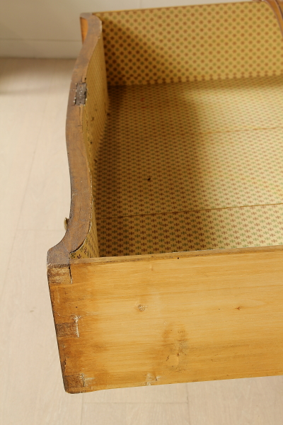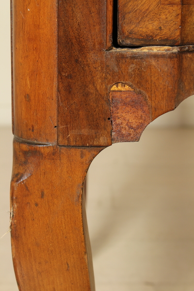 Moved in front has two drawers. Carved legs and apron. Shaped top with wooden frame. Herringbone threads. Underwent renovations.
