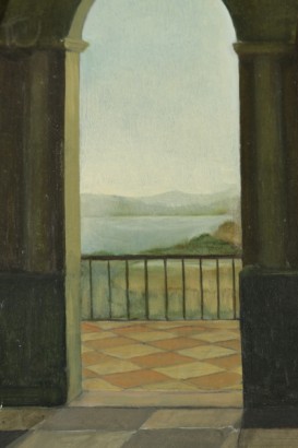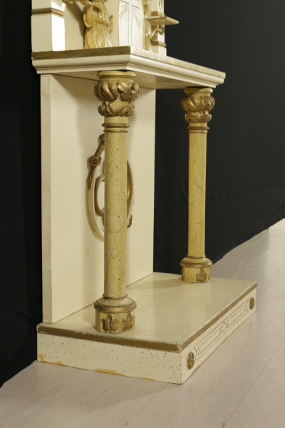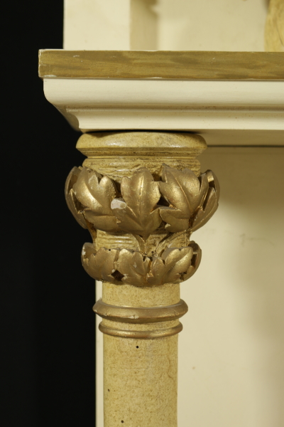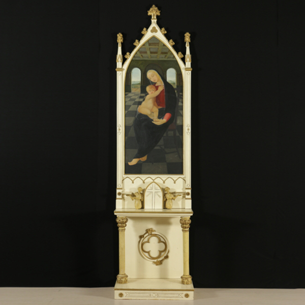 Consola de madera lacada sostenida por columnas. Pintura de arco apuntado que representa a la Virgen con el niño. Talla y dorado.