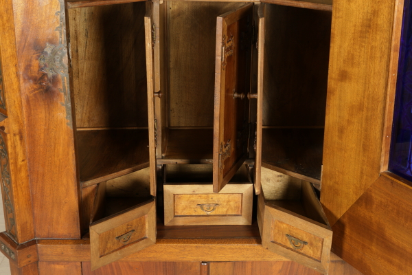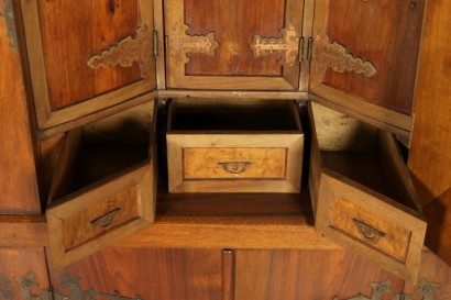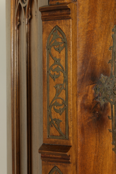 Tiene dos puertas y la hoja superior con vidrio coloreado. Dentro de tres puertas, tres cajones y compartimentos. Señaló decoraciones y esculturas típicas de la época con ventanas geminadas, arcos, Torres. Enriquecido por las decoraciones y hardware bronce.