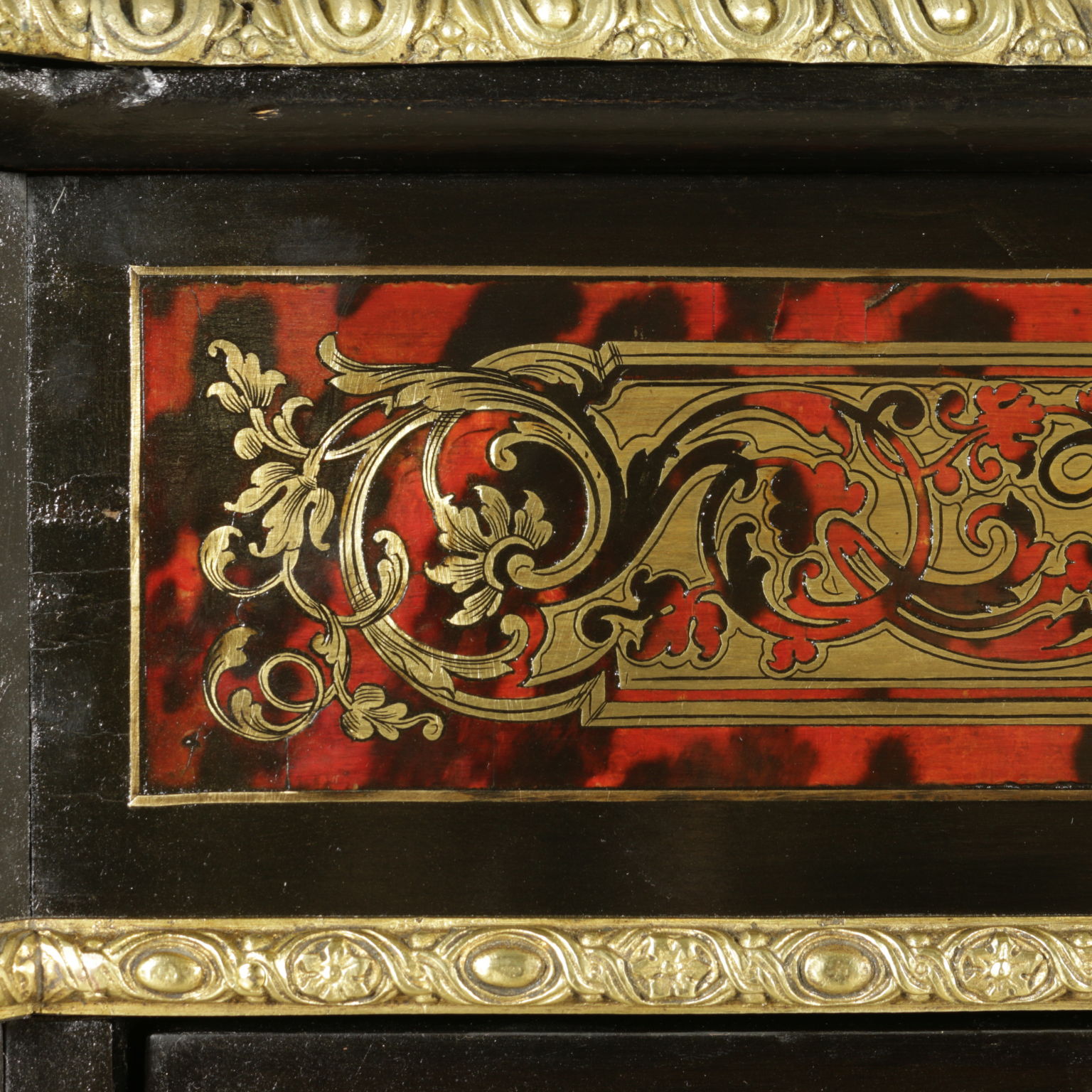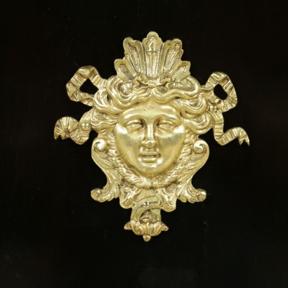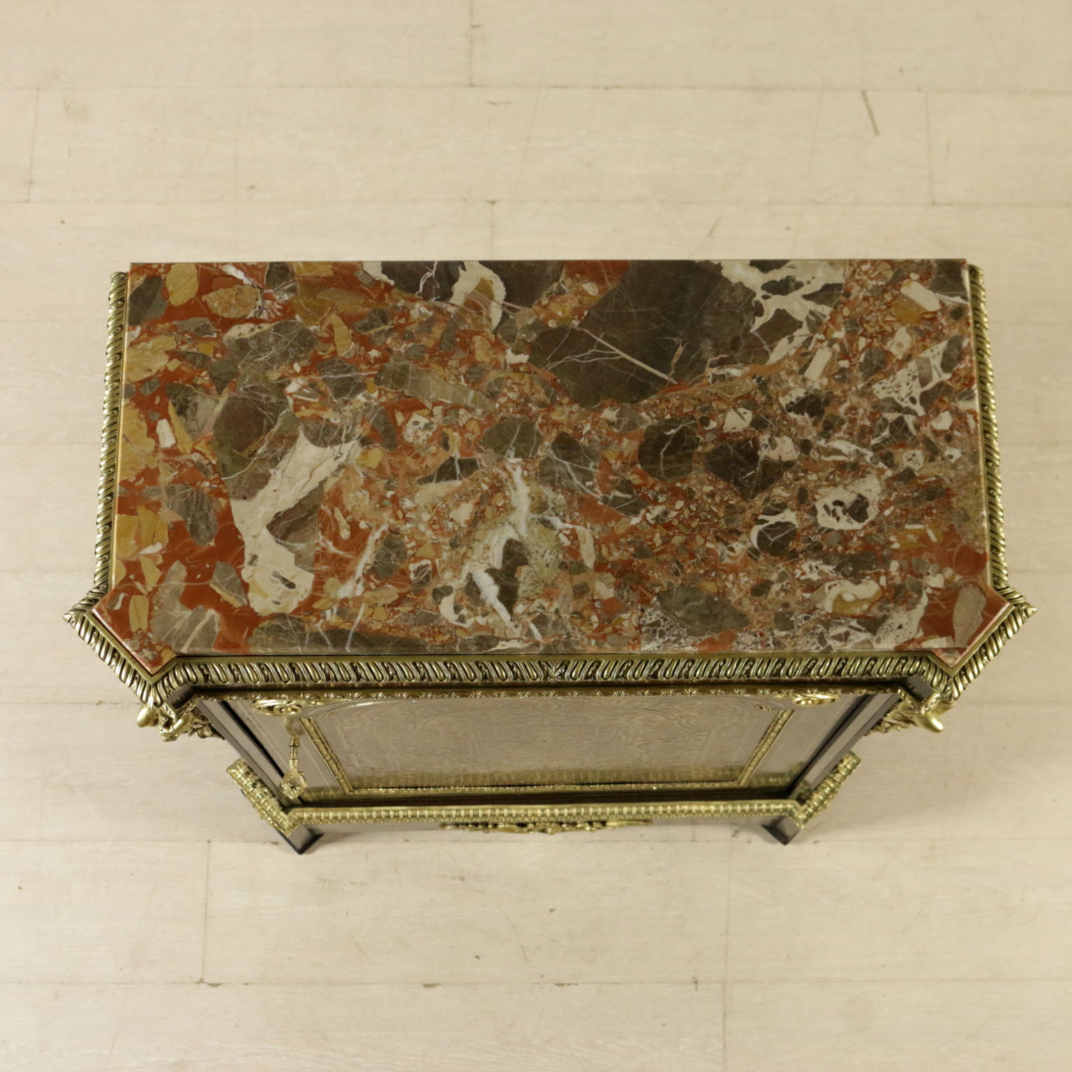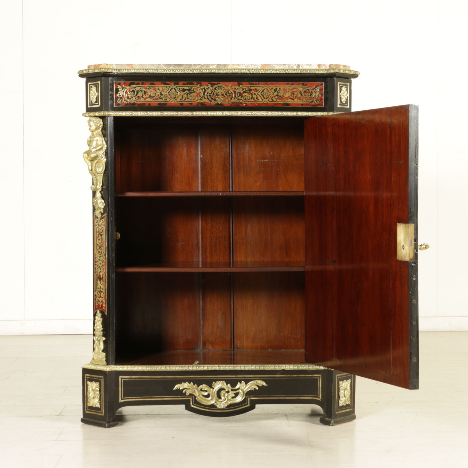 Pequeño armario de estilo de la Botella, tiene una puerta y struts scantonati con putti en bronce dorado. Se reserva, con incrustaciones de carey y latón. Frisos y cornisas en bronce dorado. En forma de tapa de mármol y hundidos.