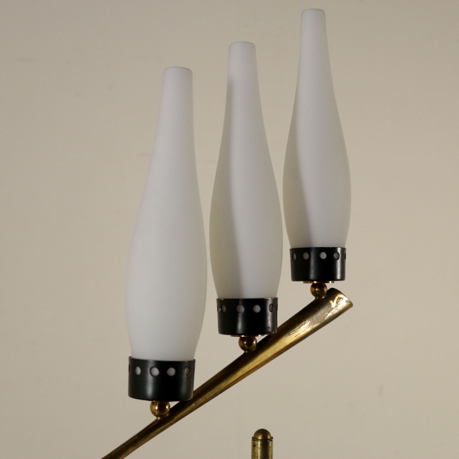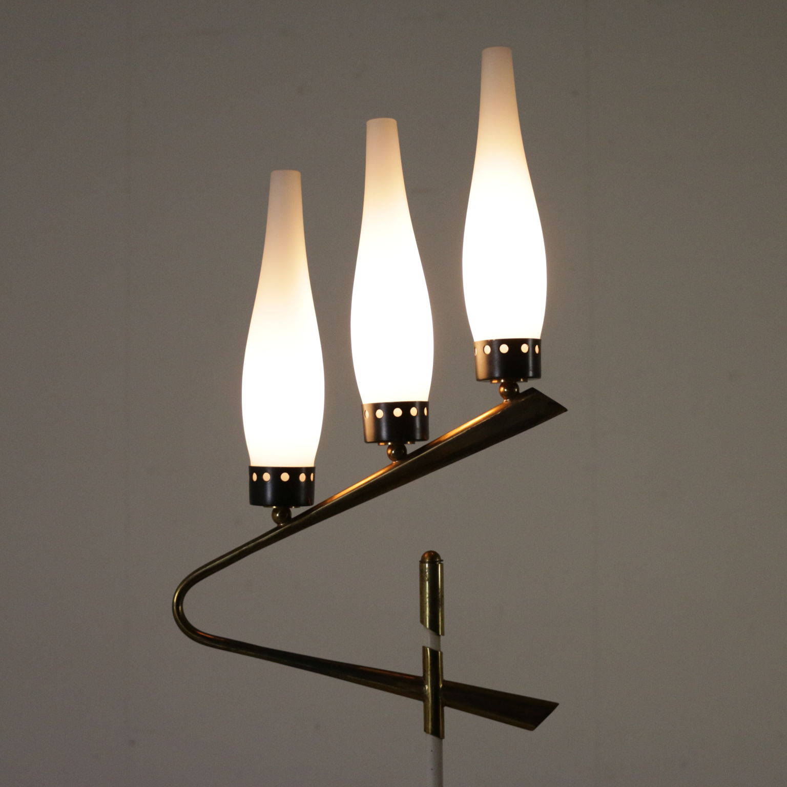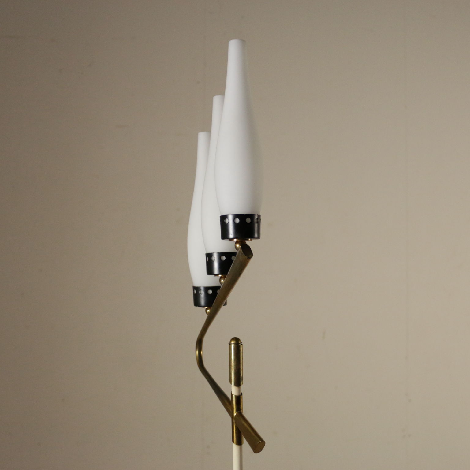 Lámpara de piso; base de mármol, metal, latón, opalina de vidrio.