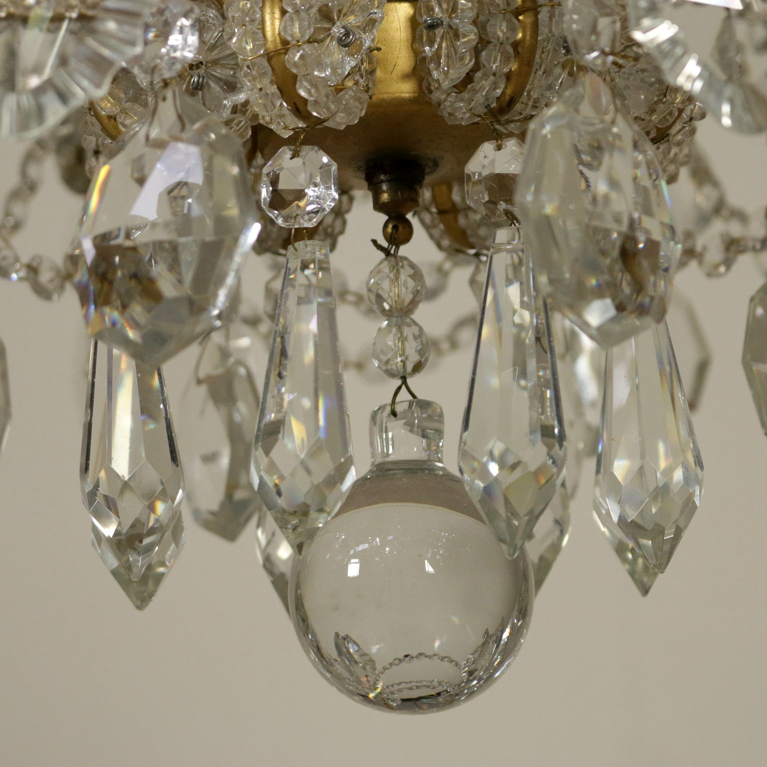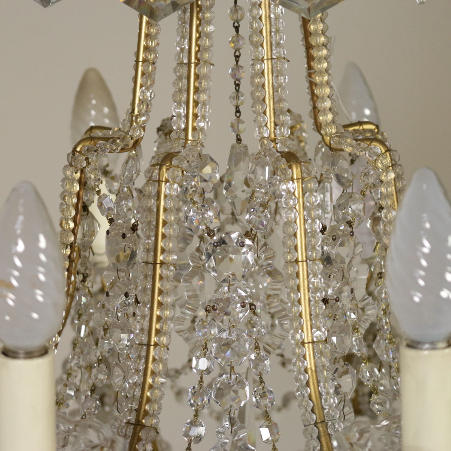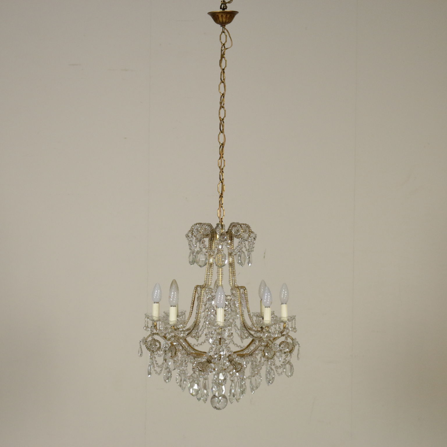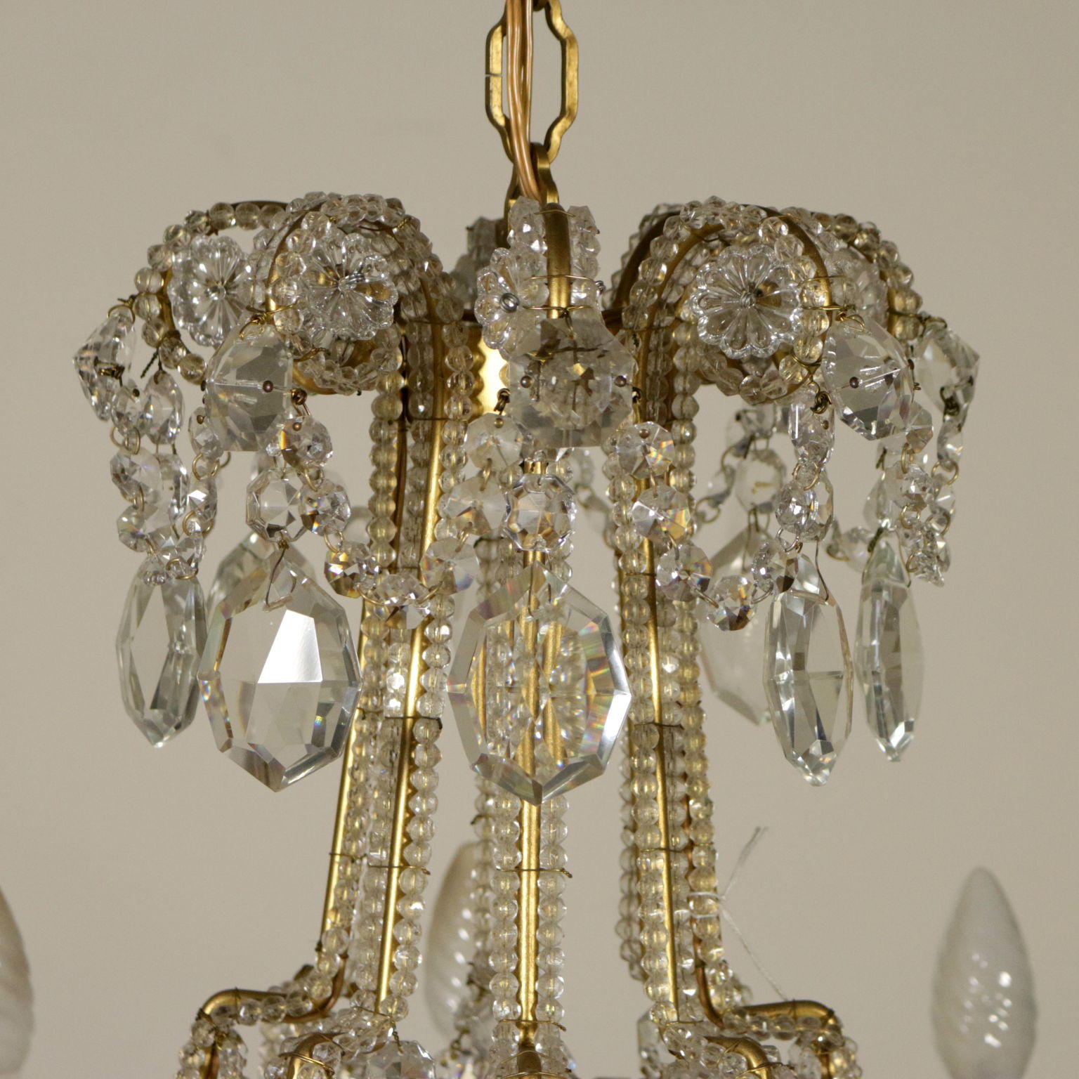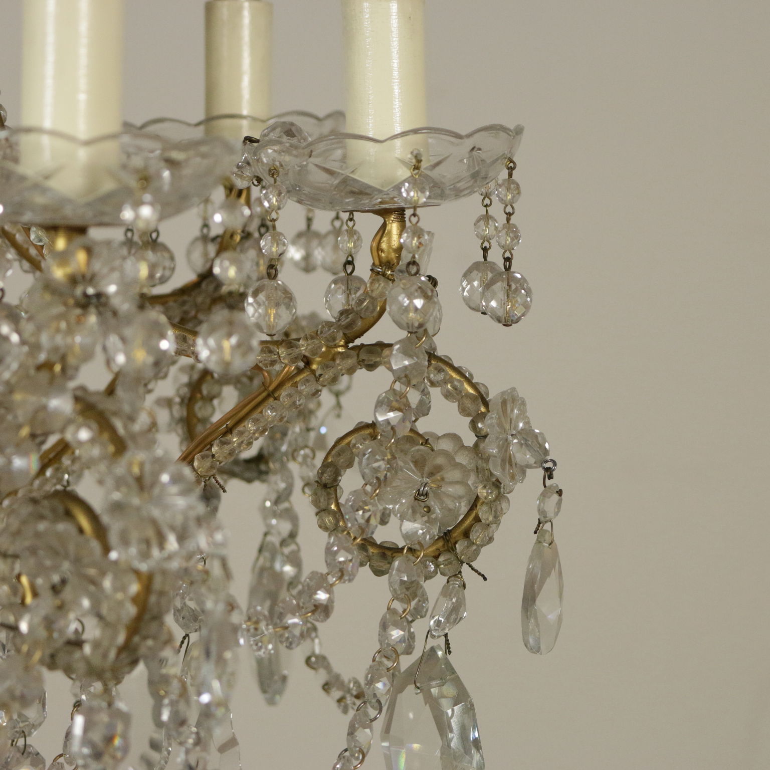 Candelabro de ocho brazos con cristal y decoraciones de cristal colgantes. De hierro dorado. No electrificada. La primera mitad del '900.