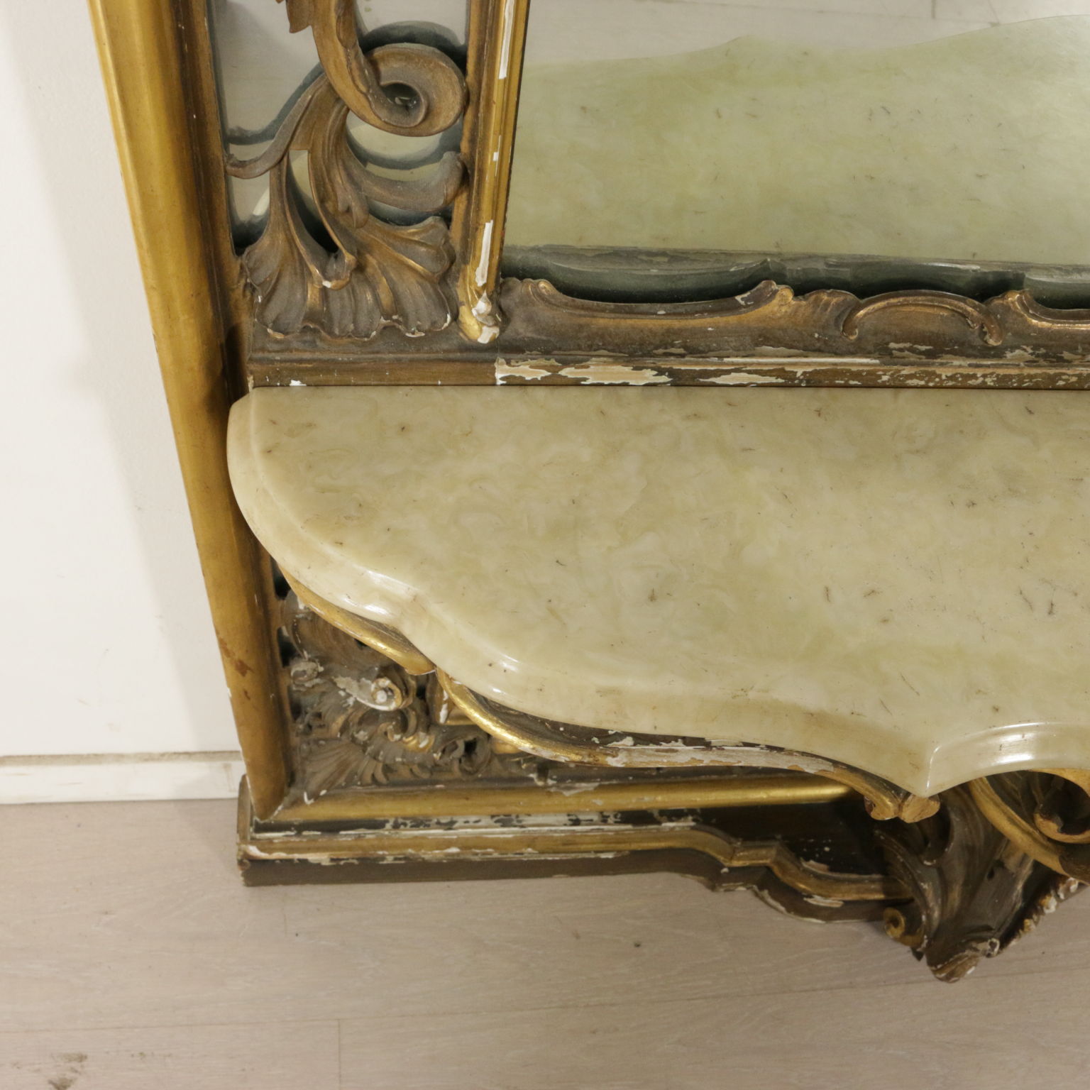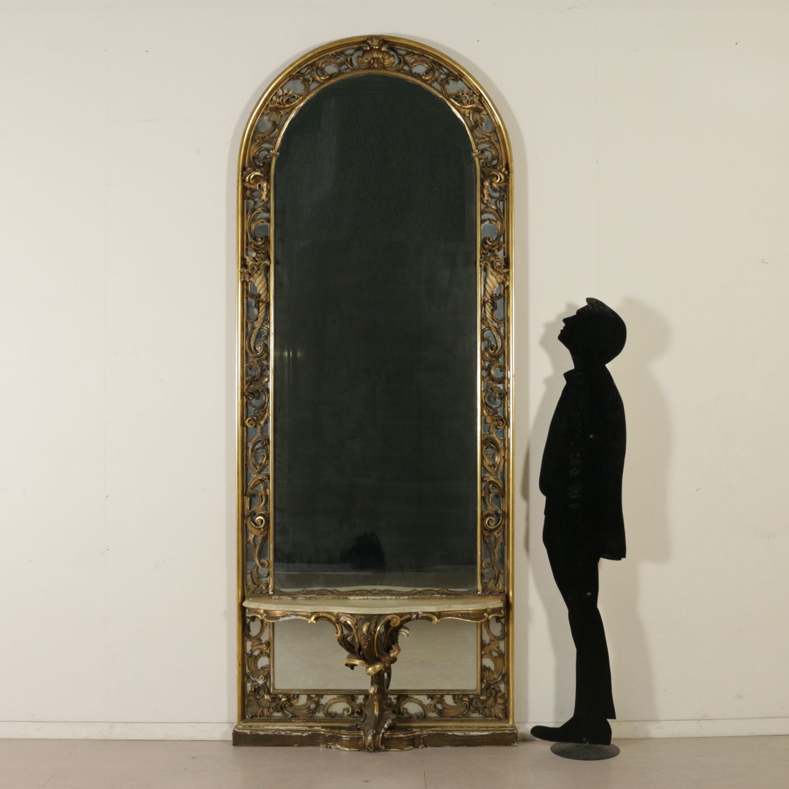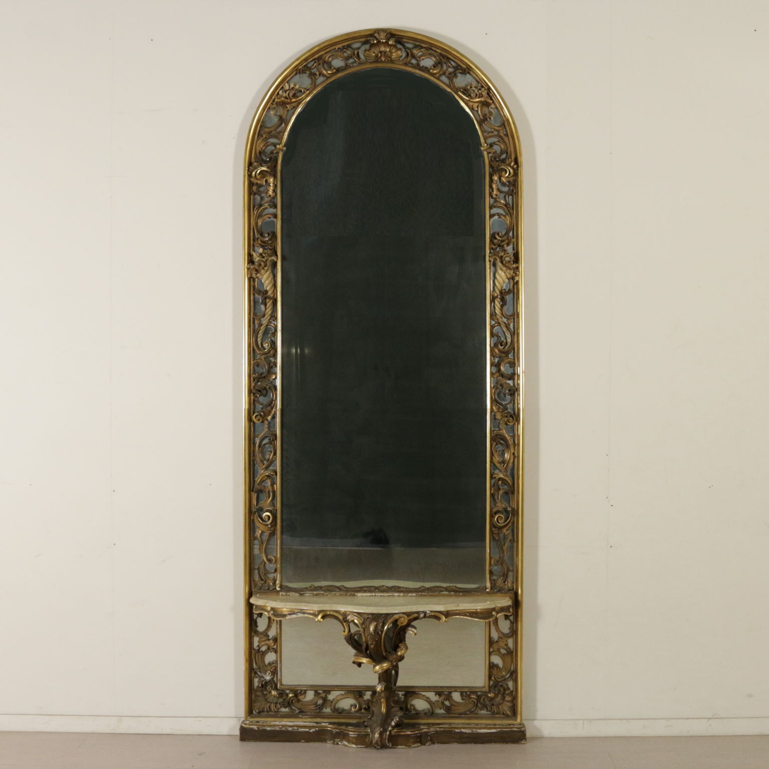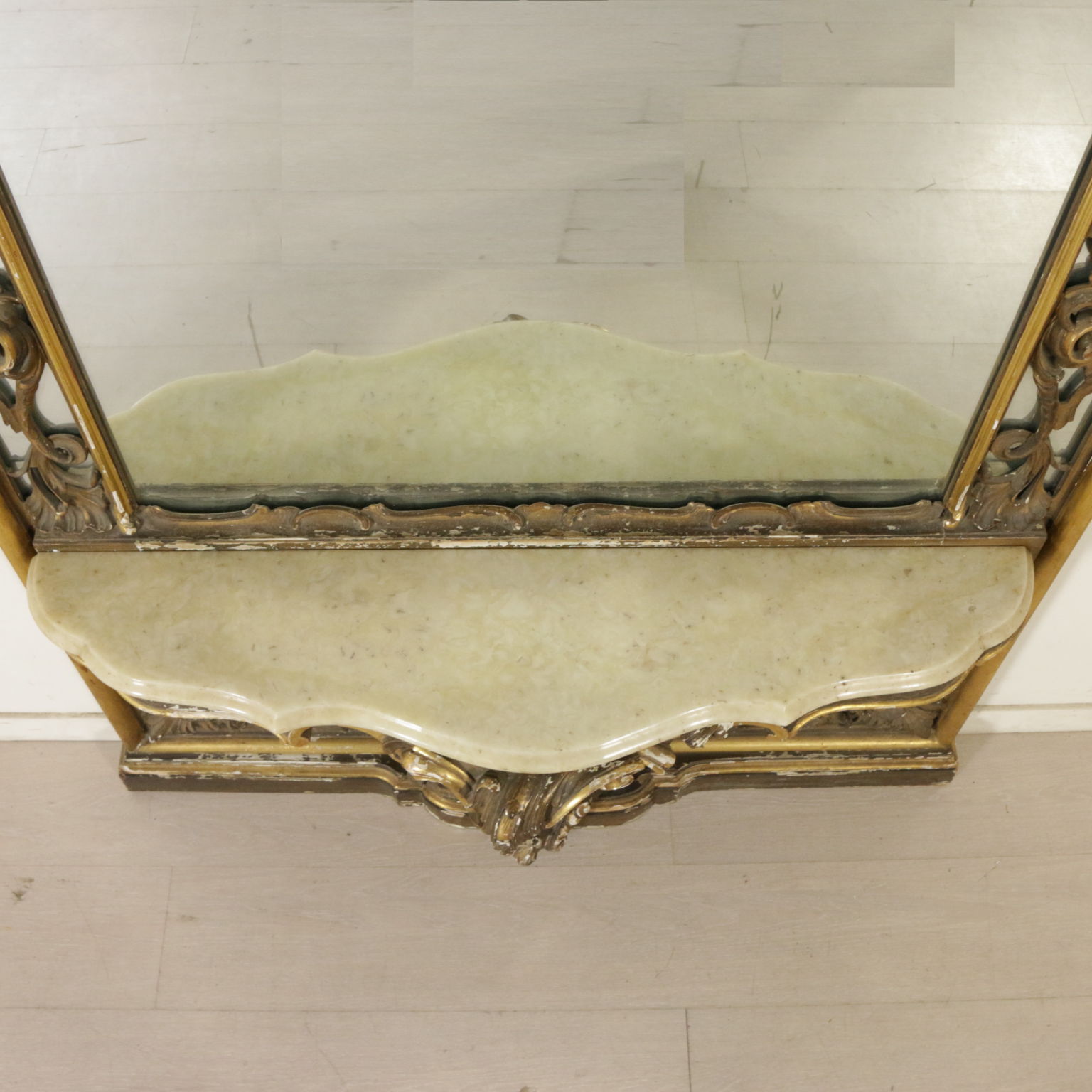 Gran espejo de la raya ricamente tallada con motivos foliáceas y cornucopias y lacado. La pequeña consola de mesa con forma de tapa de mármol corte de pierna recta. Cyma arcos.
