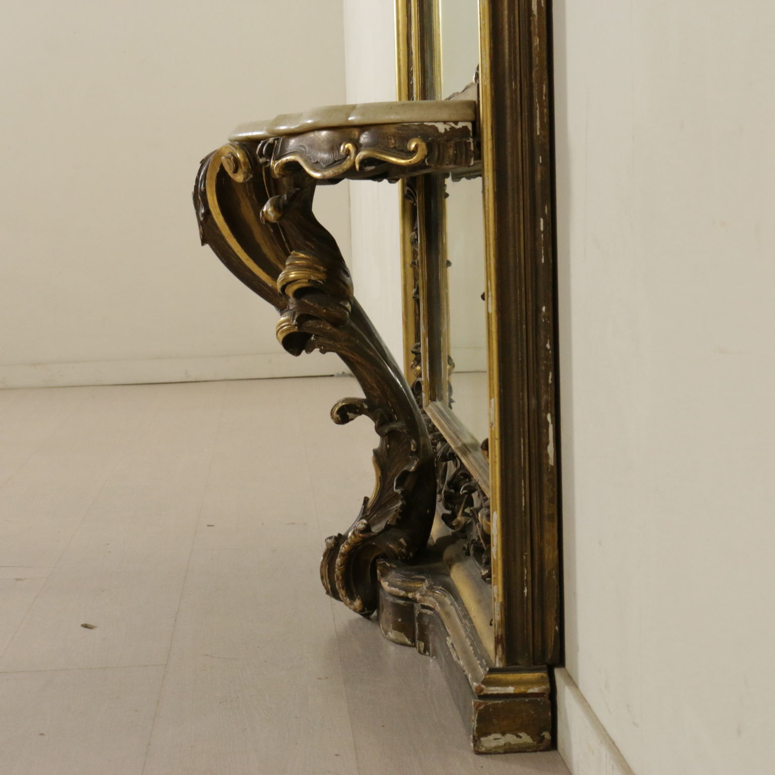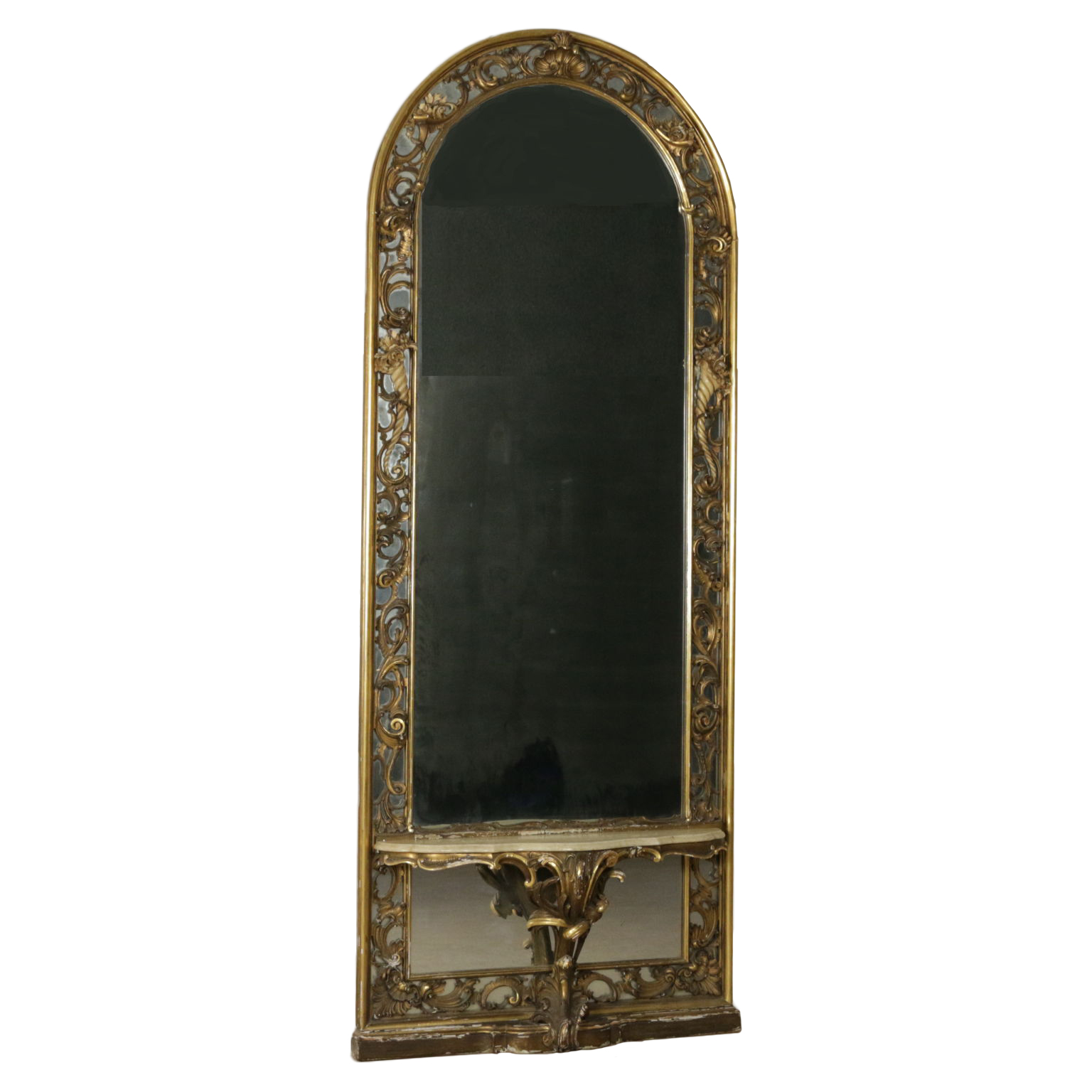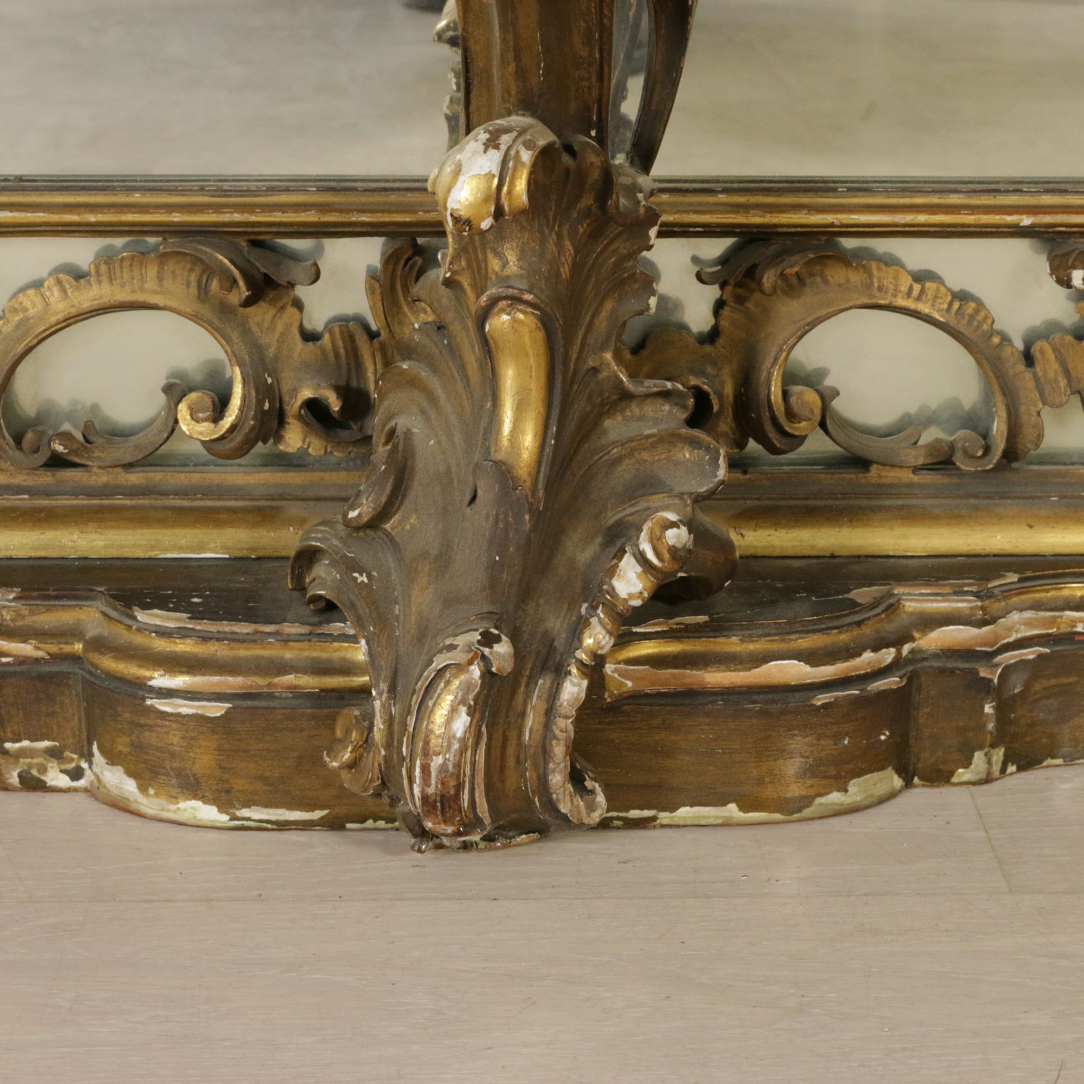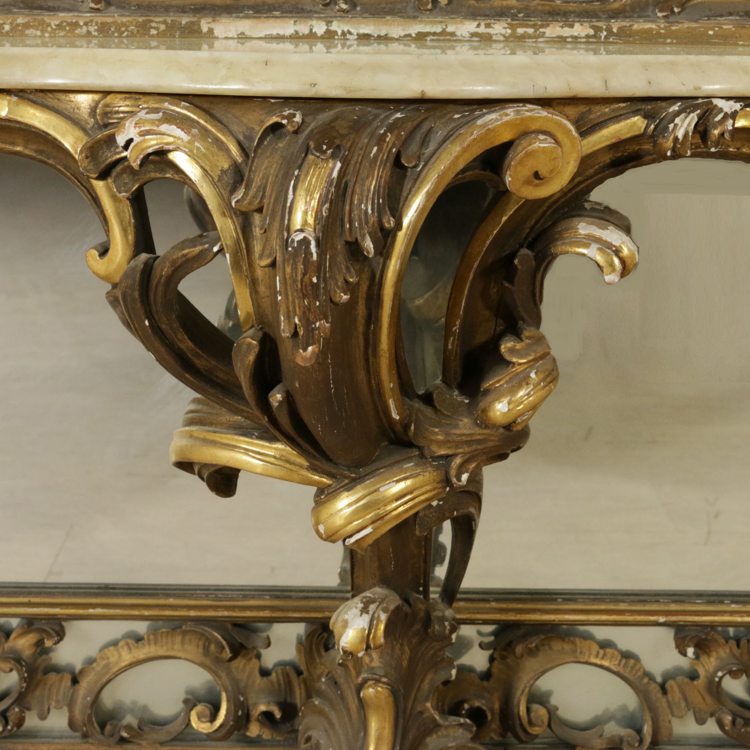 Gran espejo de la raya ricamente tallada con motivos foliáceas y cornucopias y lacado. La pequeña consola de mesa con forma de tapa de mármol corte de pierna recta. Cyma arcos.