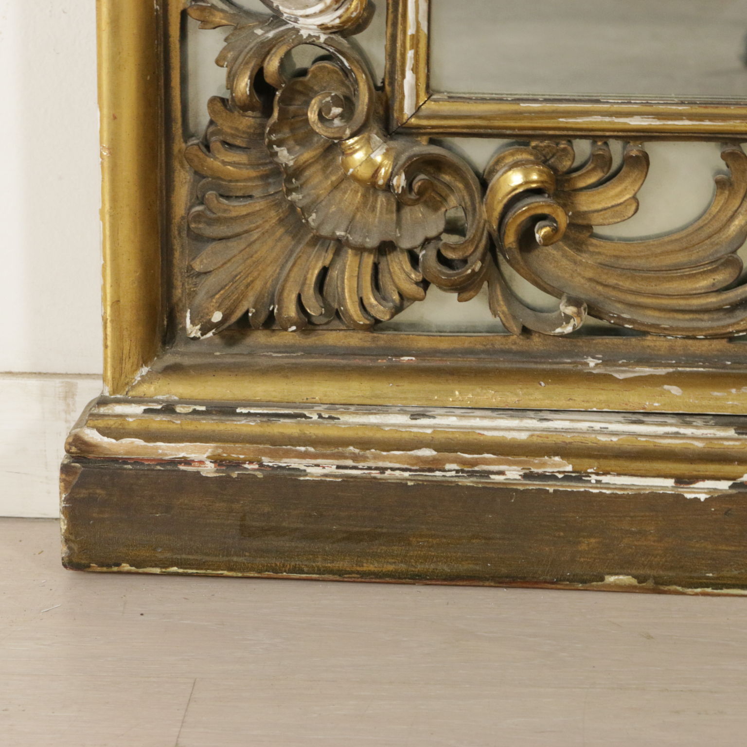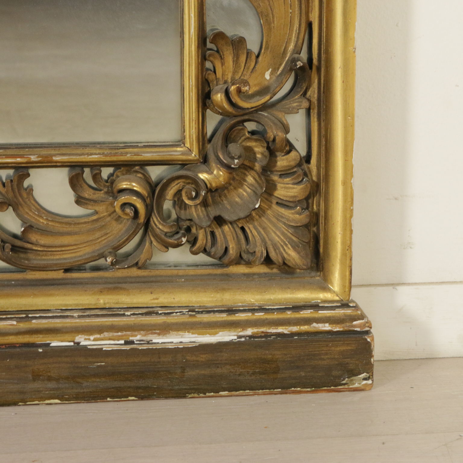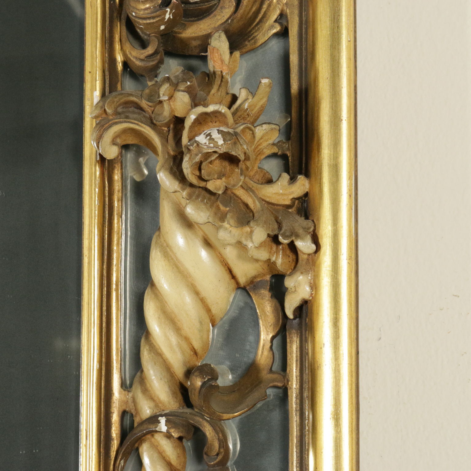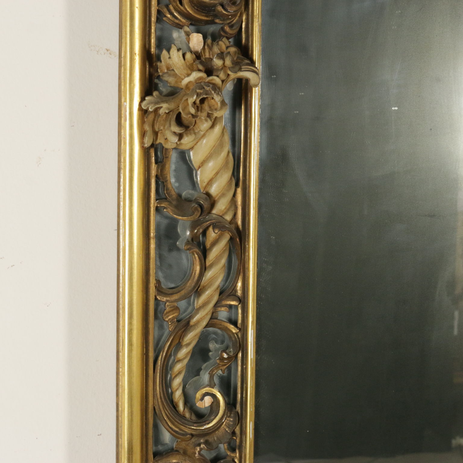 Gran espejo de la raya ricamente tallada con motivos foliáceas y cornucopias y lacado. La pequeña consola de mesa con forma de tapa de mármol corte de pierna recta. Cyma arcos.