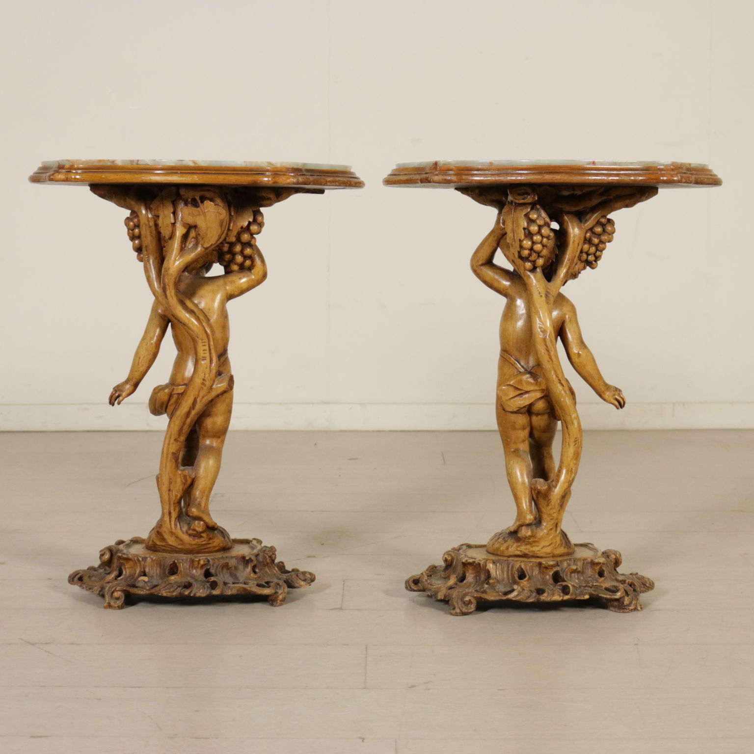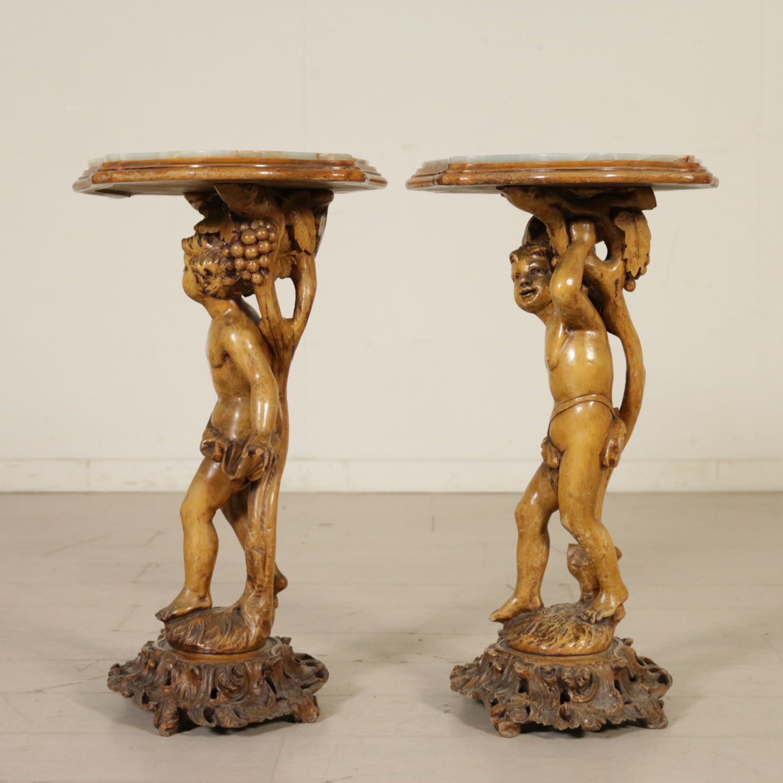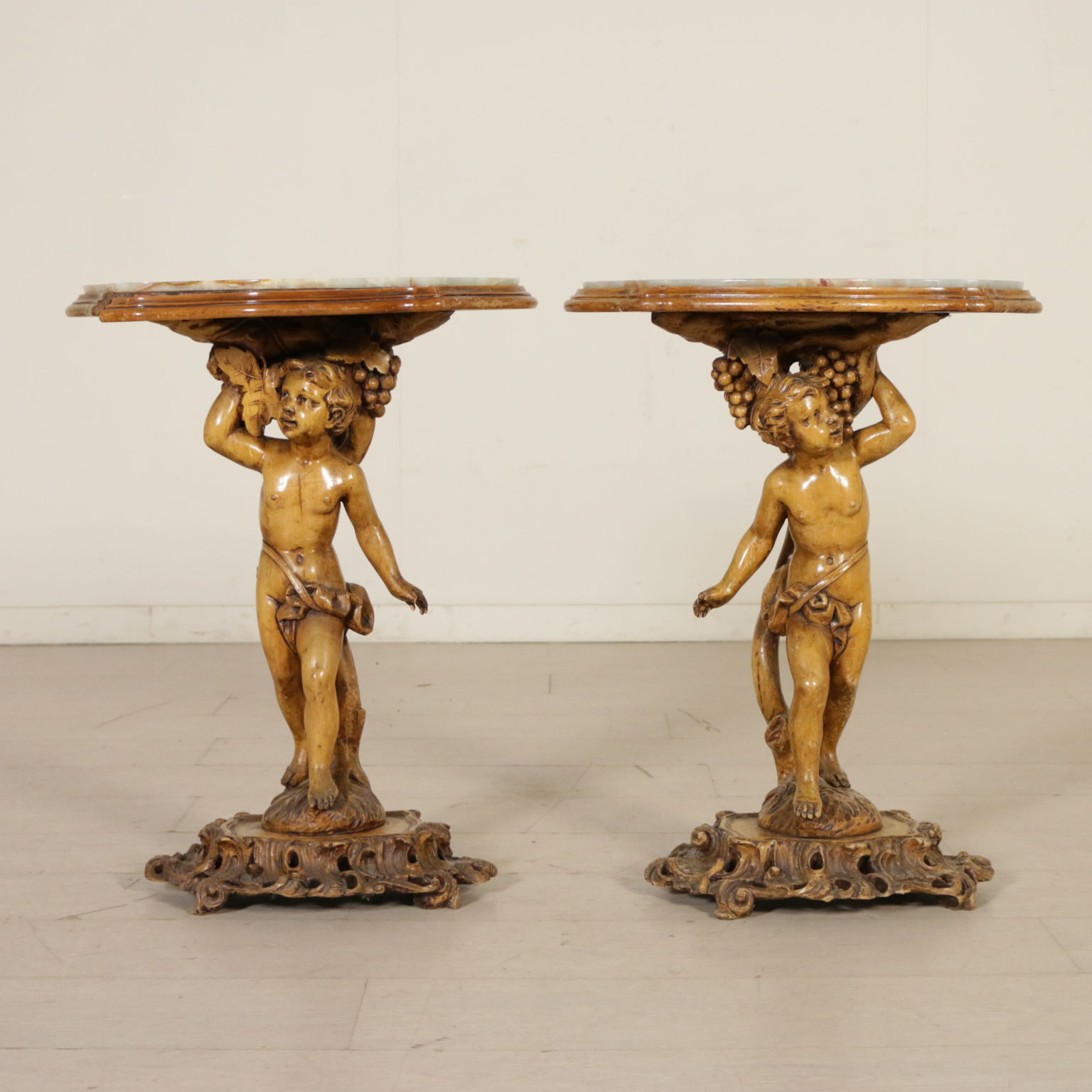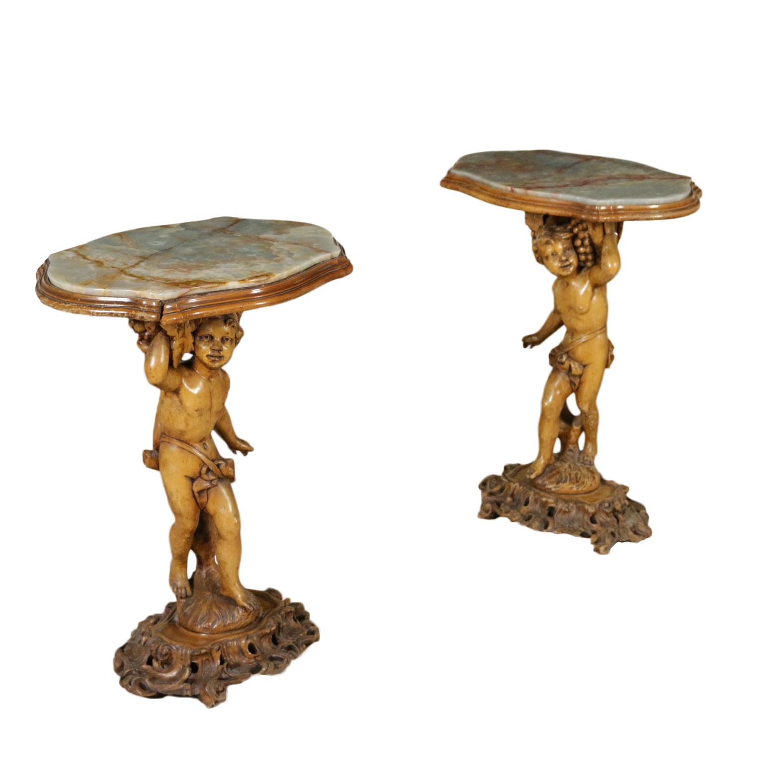 Elegante par de tablas apoyadas por querubines tallados en la ronda con tornillos y base fogliaceo. Forma parte de arriba con onyx cobrado.