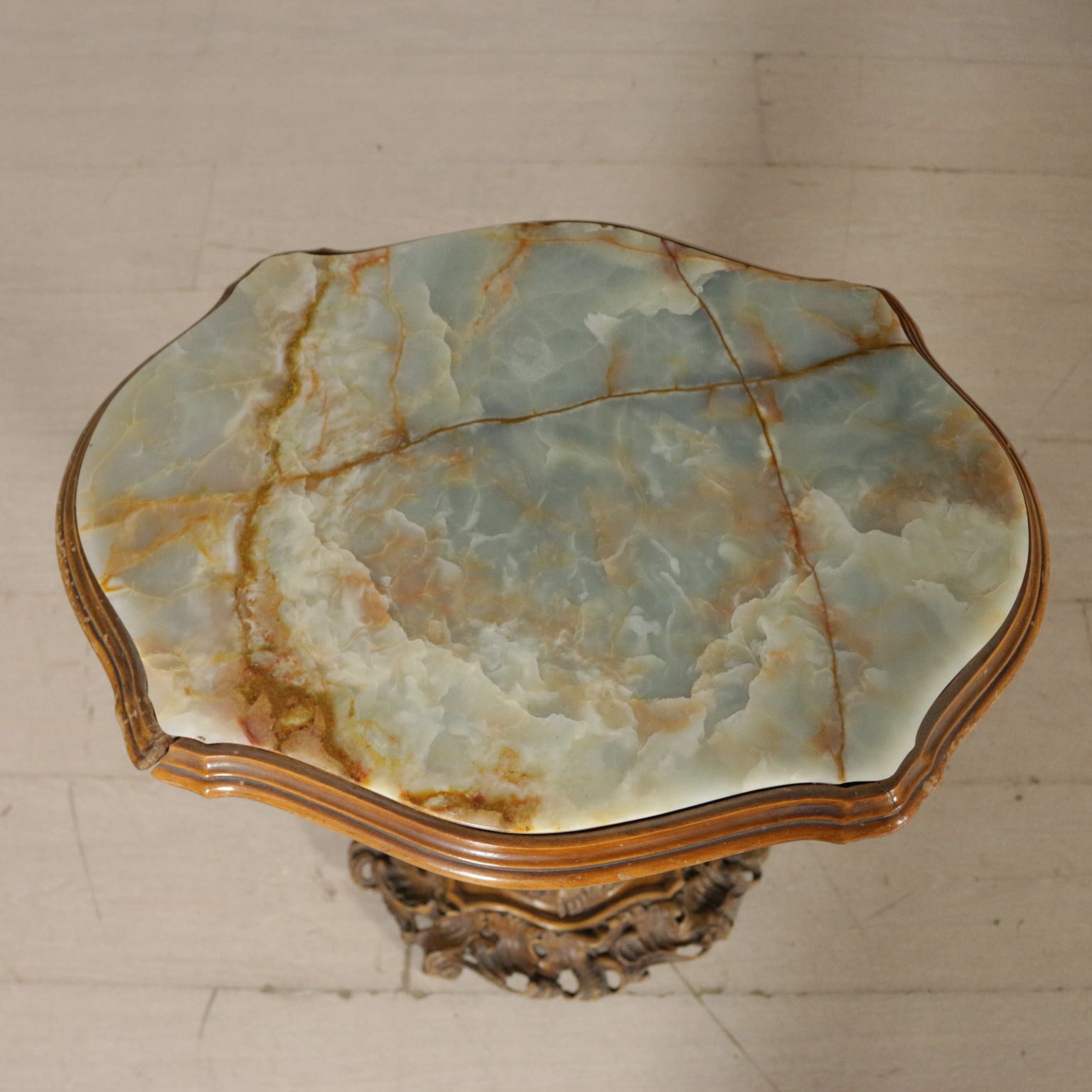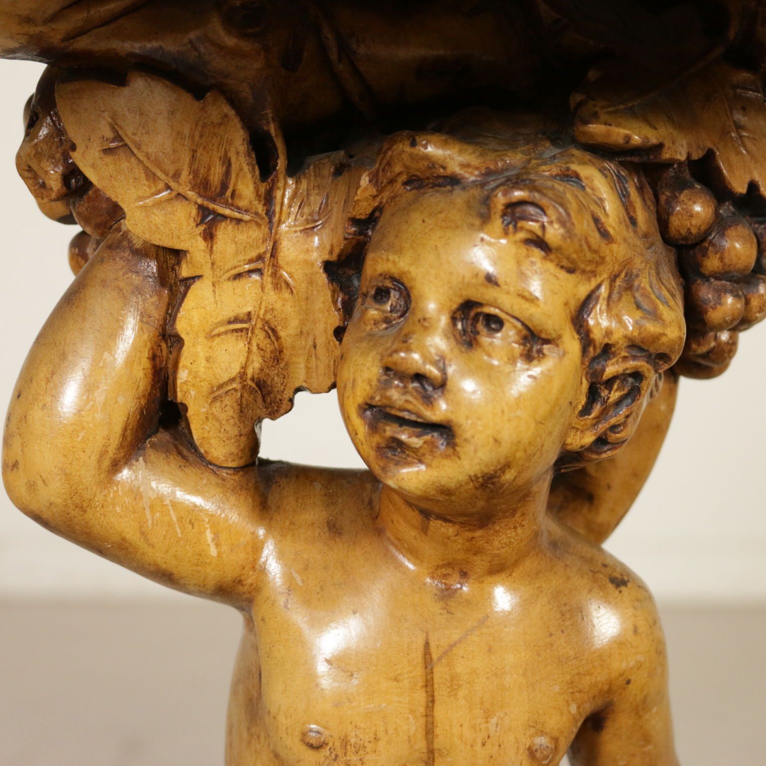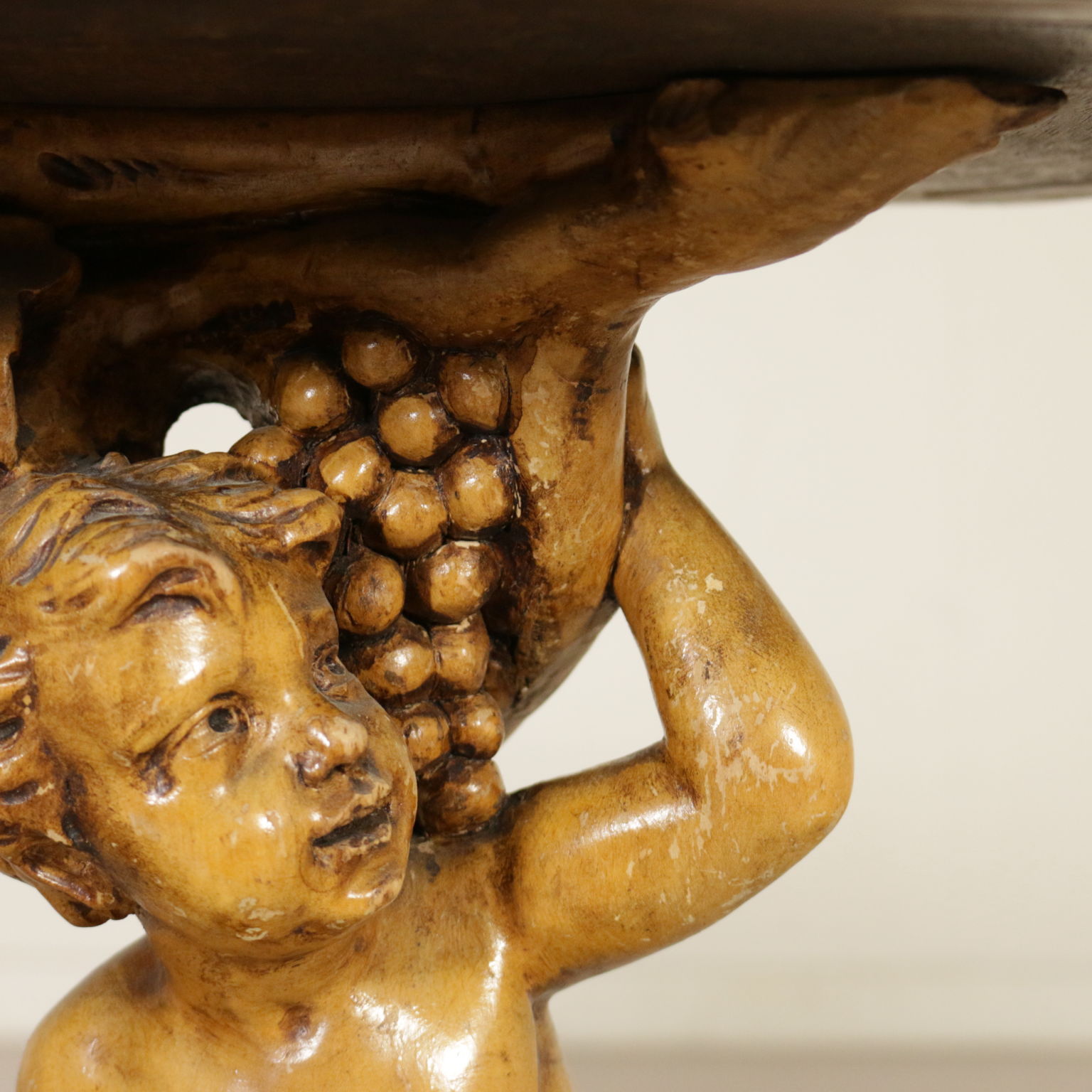 Elegante par de tablas apoyadas por querubines tallados en la ronda con tornillos y base fogliaceo. Forma parte de arriba con onyx cobrado.