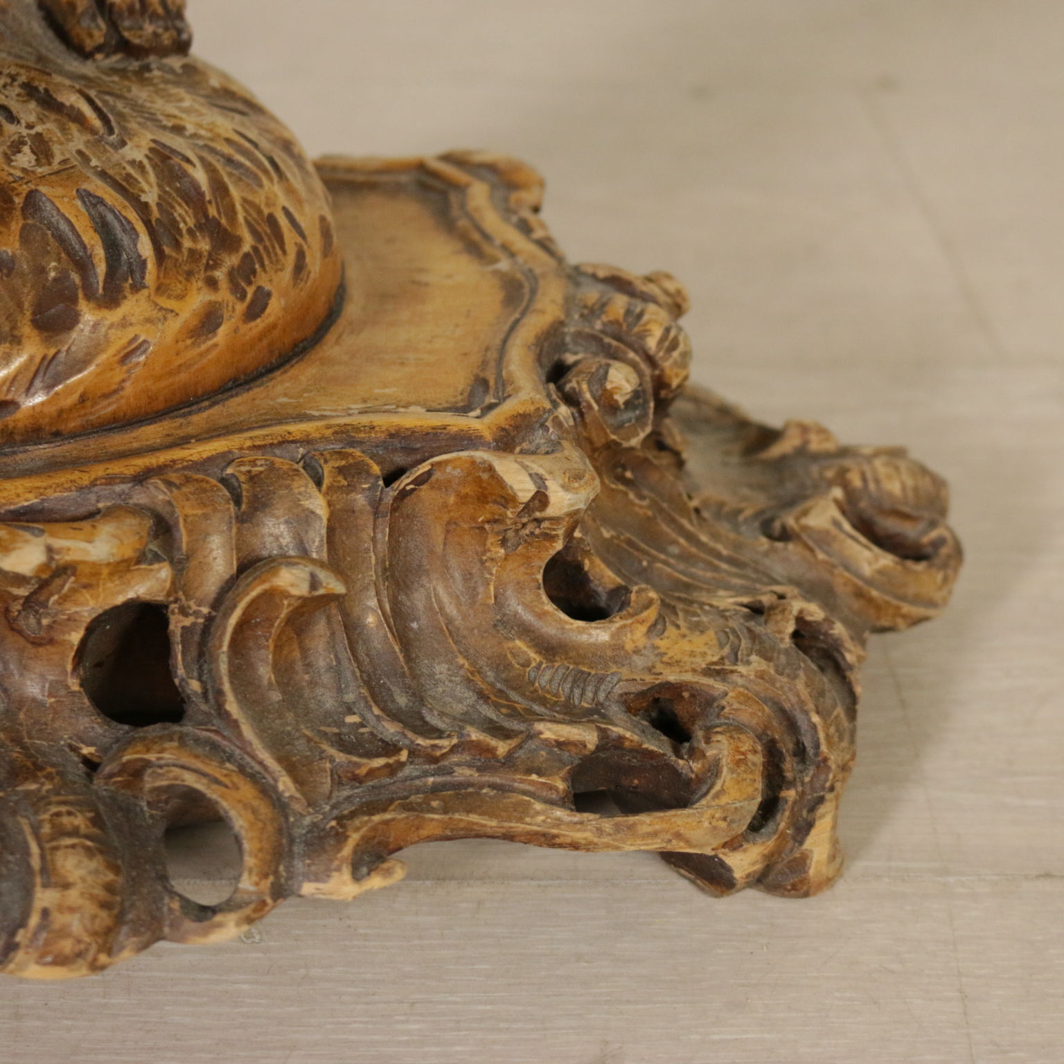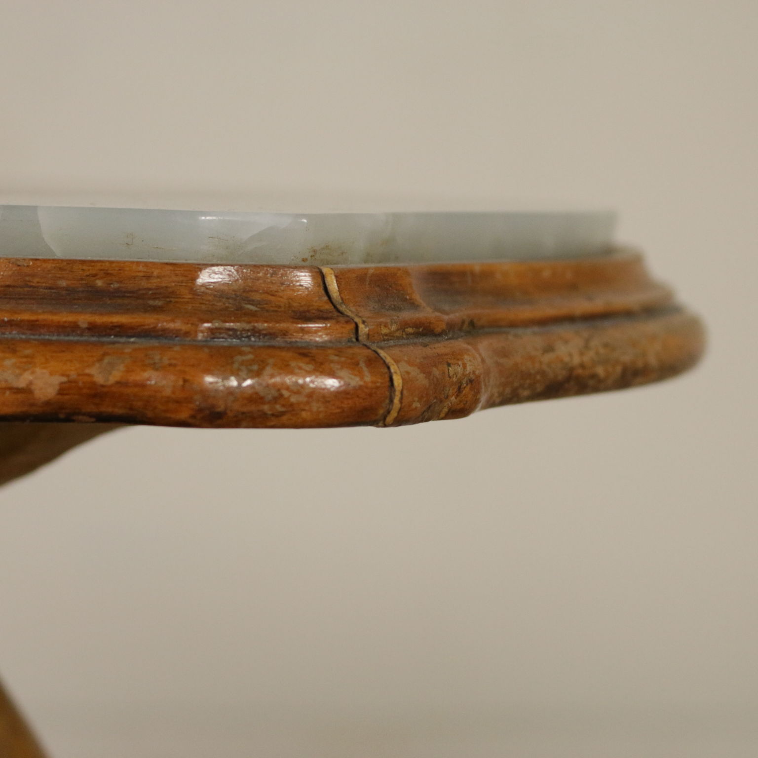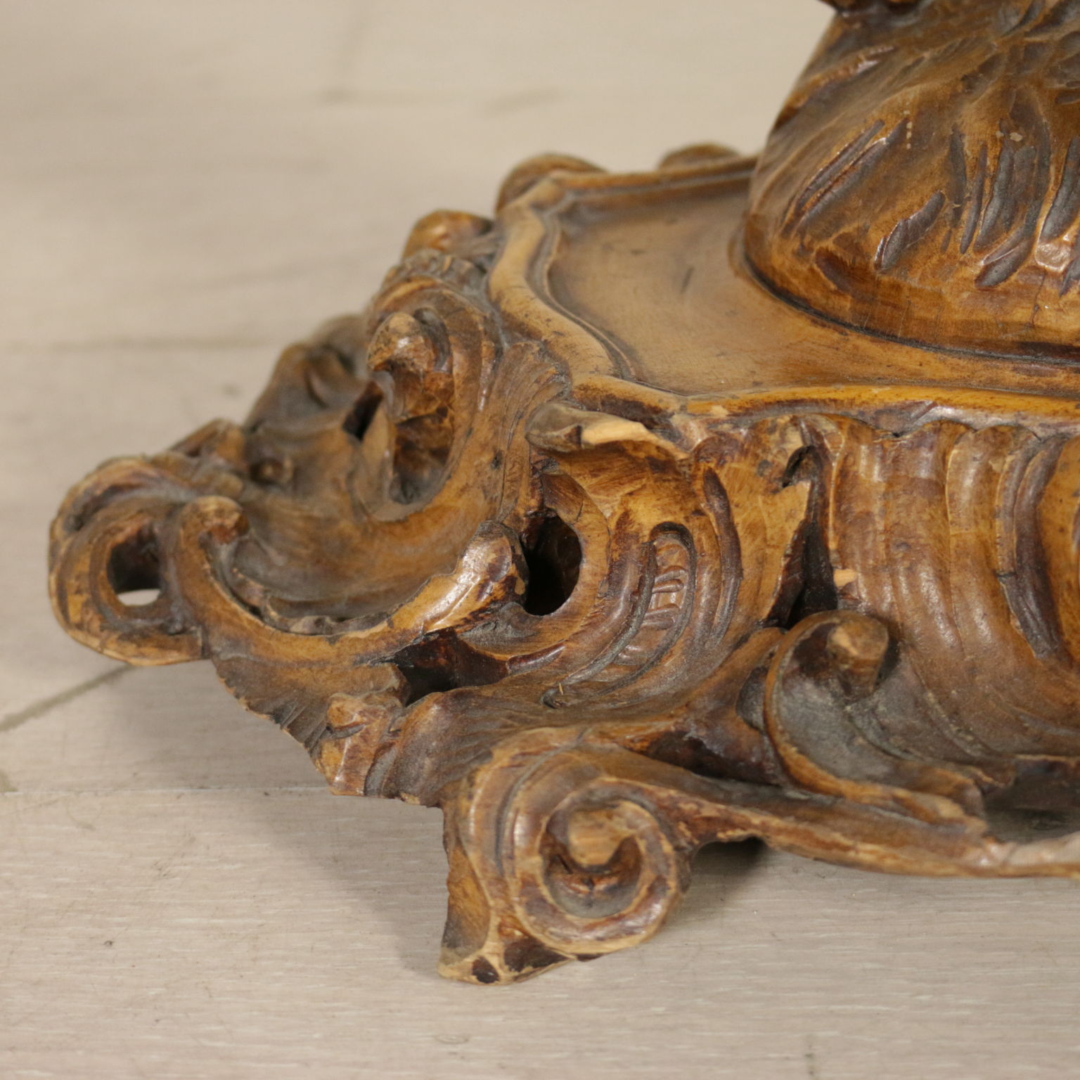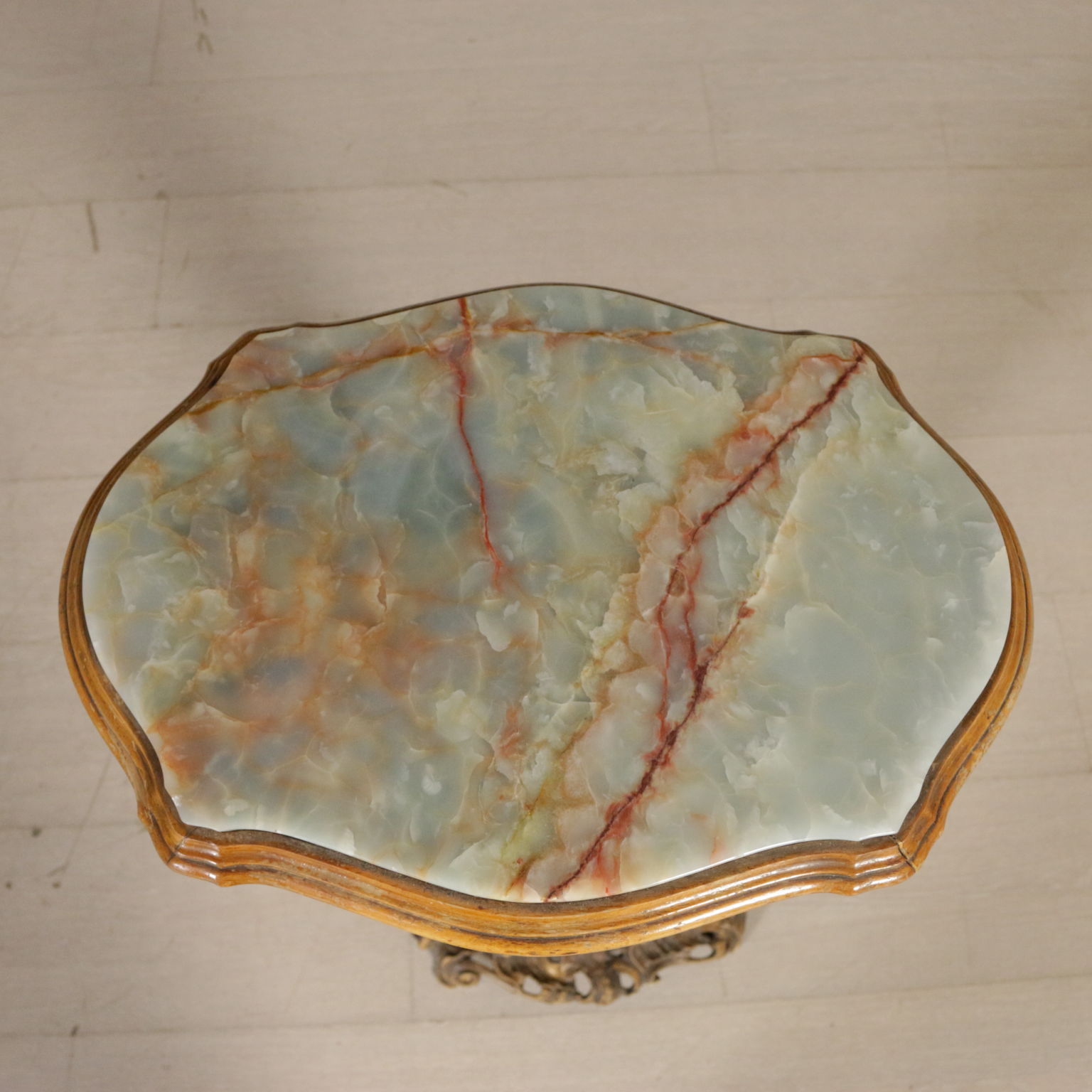 Elegante par de tablas apoyadas por querubines tallados en la ronda con tornillos y base fogliaceo. Forma parte de arriba con onyx cobrado.