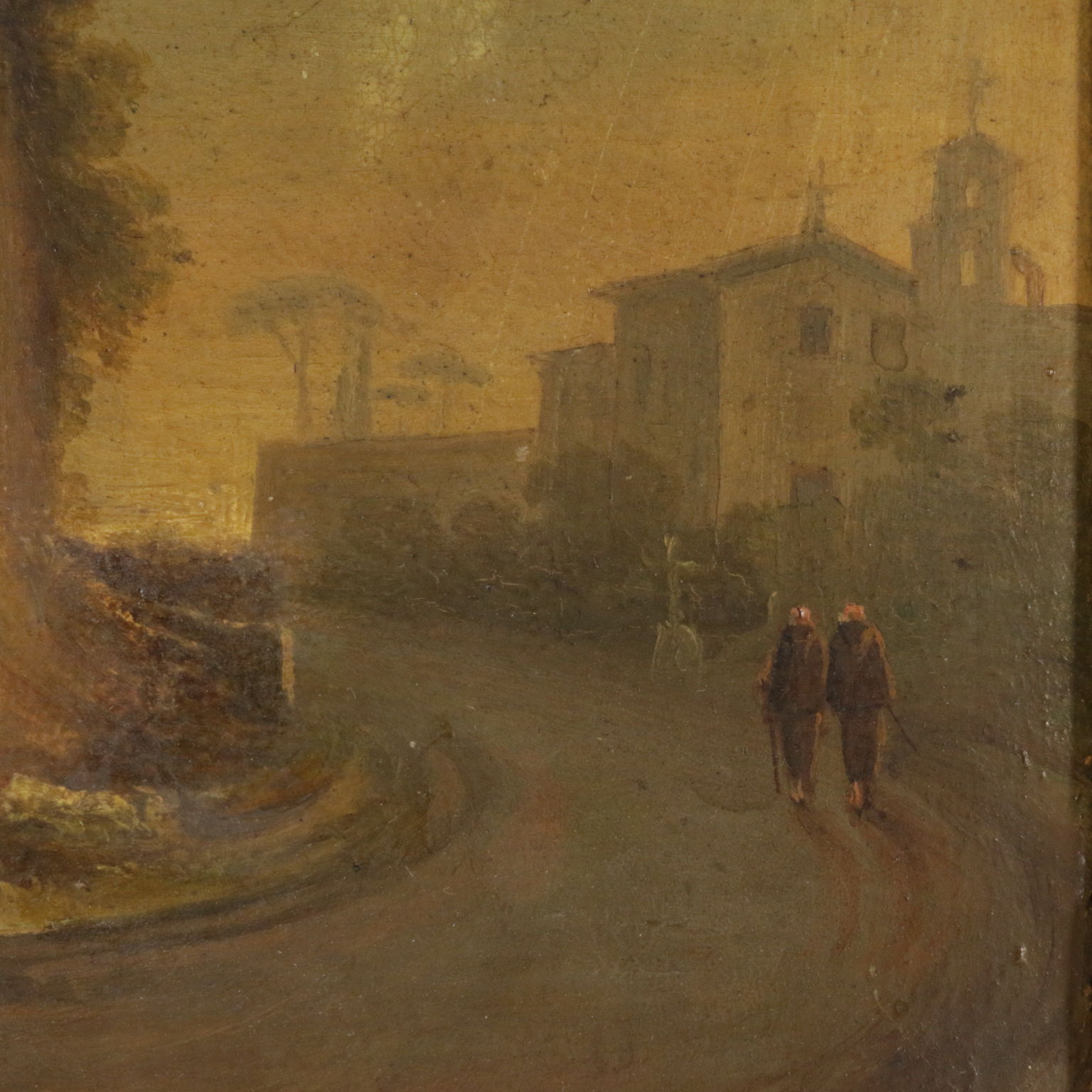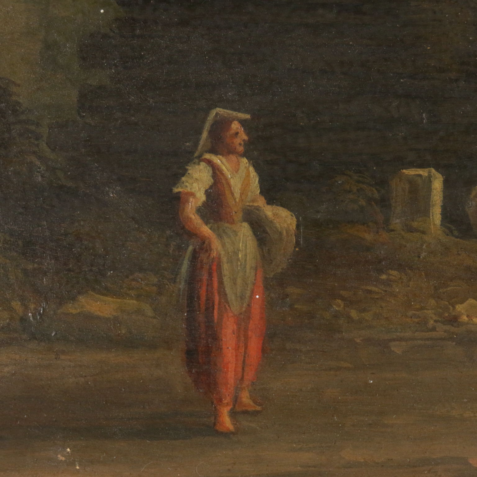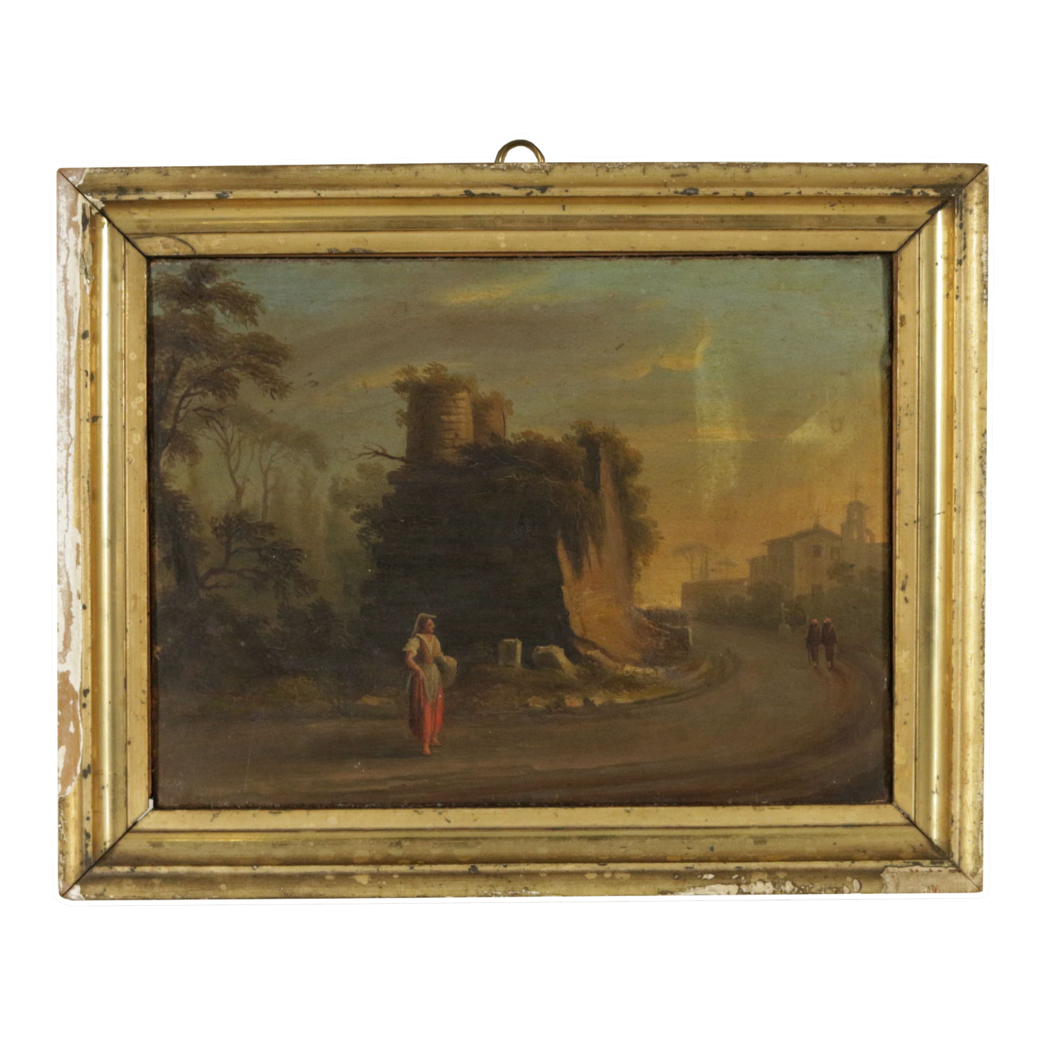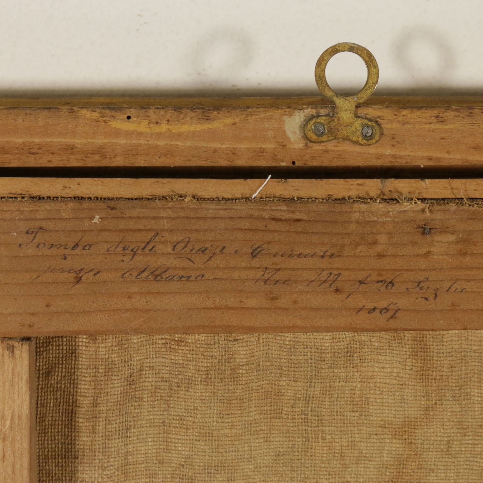 Óleo sobre papel aplica a la tela. Con fecha 26 de julio de 1861, y firmado Nic. M. fecit en el reverso, junto con la localización de la Tumba de los Horacios y Curatii en Albano". Contemporáneo de marco. Las huellas de los pequeños de la restauración.