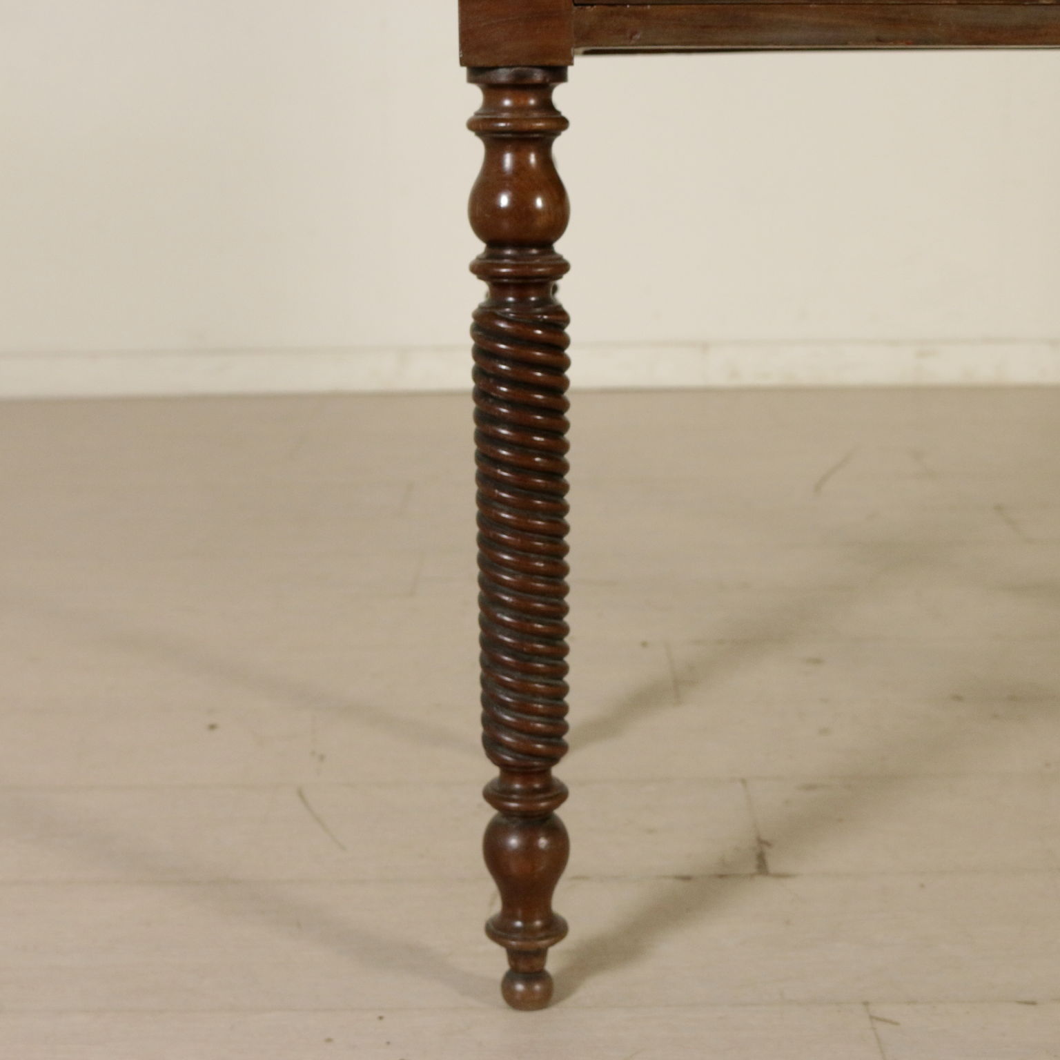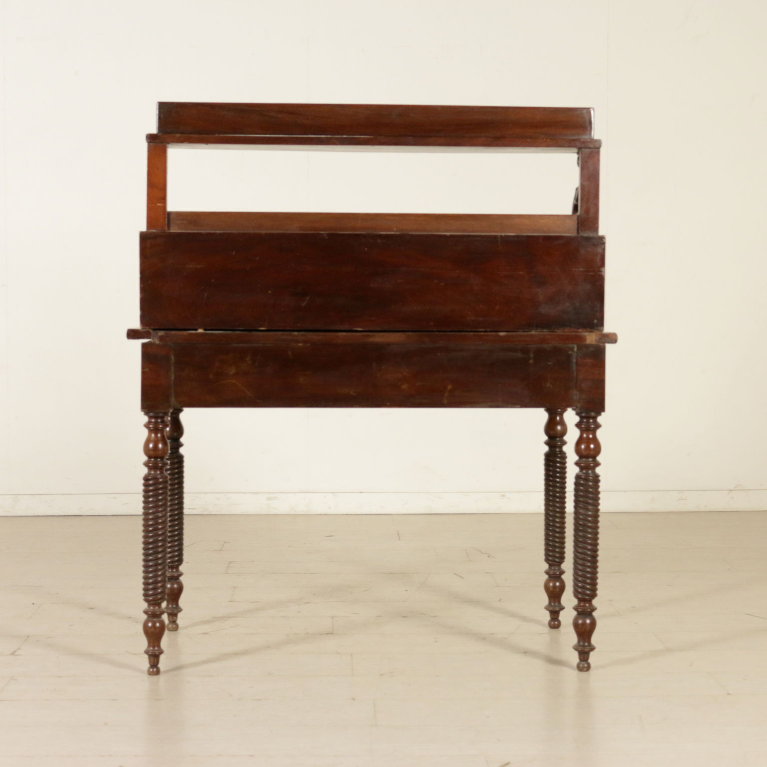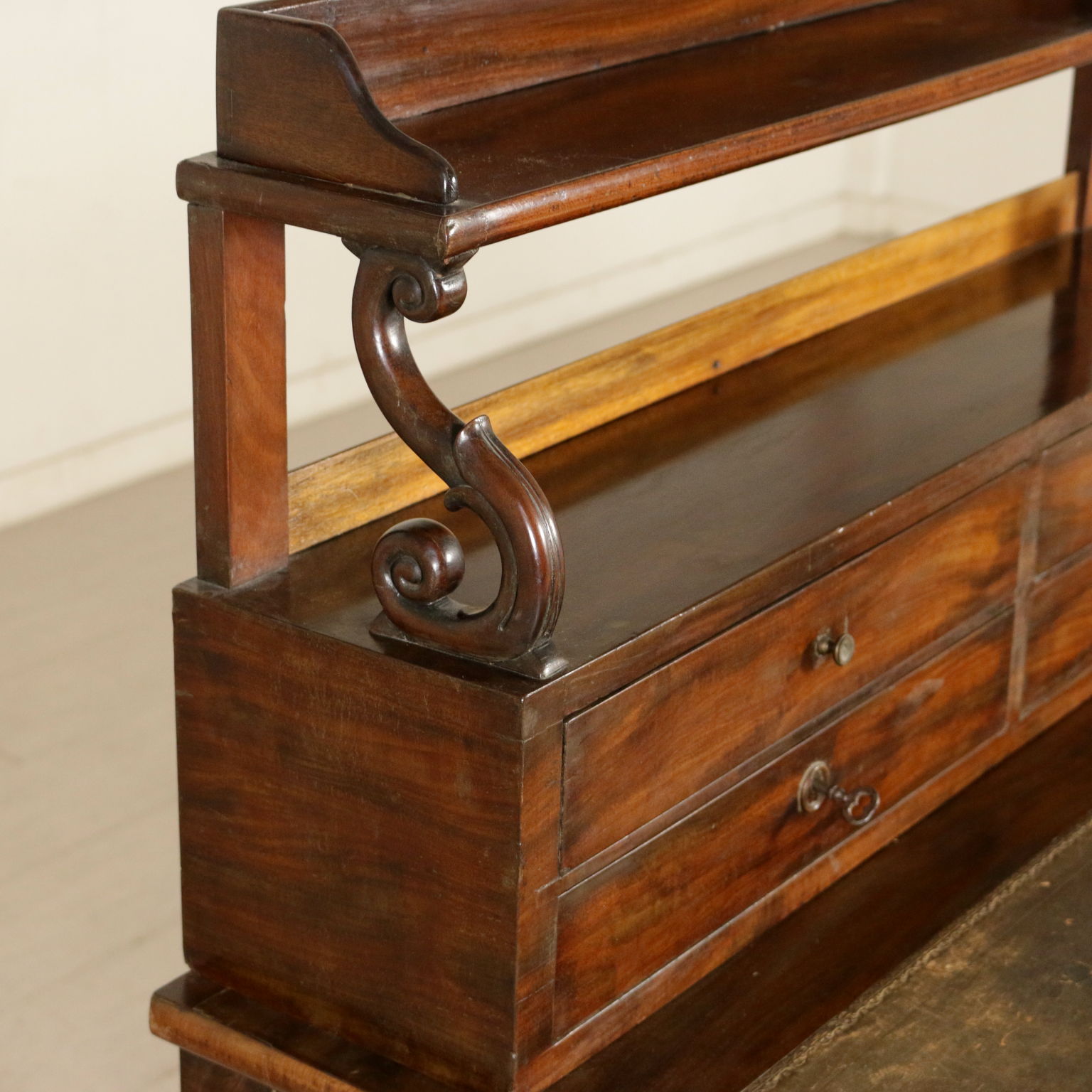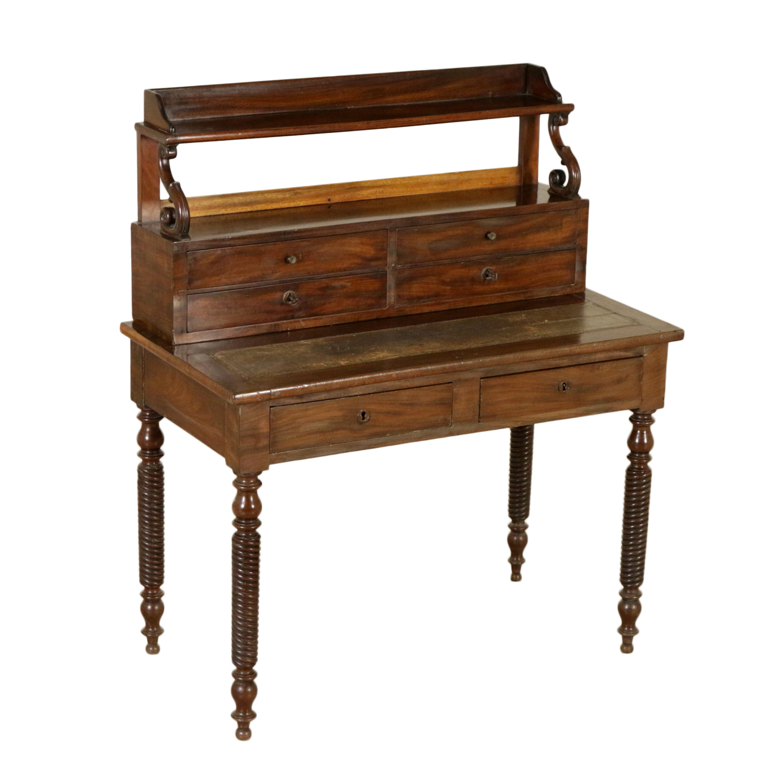 Elegante escritorio desde el centro apoyado por las patas torneadas cuenta con dos cajones y piso con inserto de cuero. Planteado con cuatro cajones y un estante apoyado por los pergaminos.