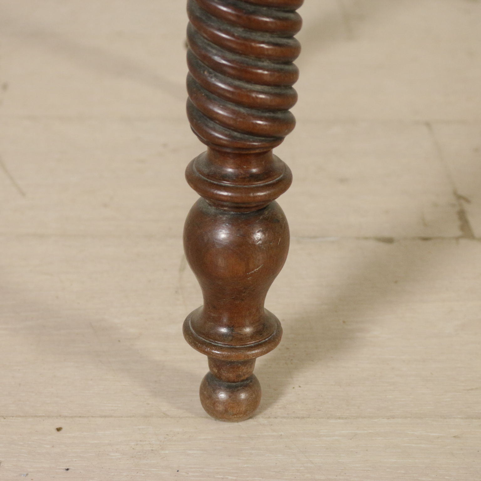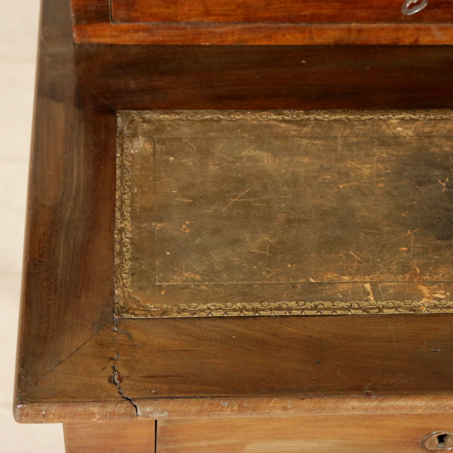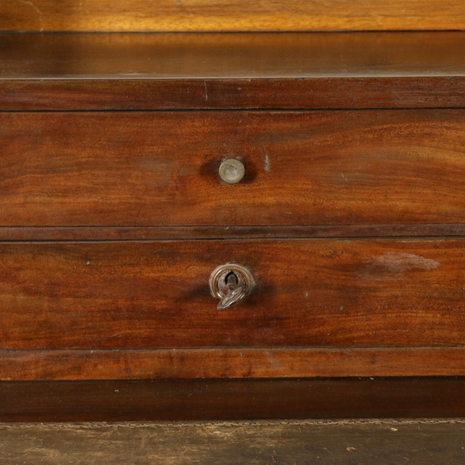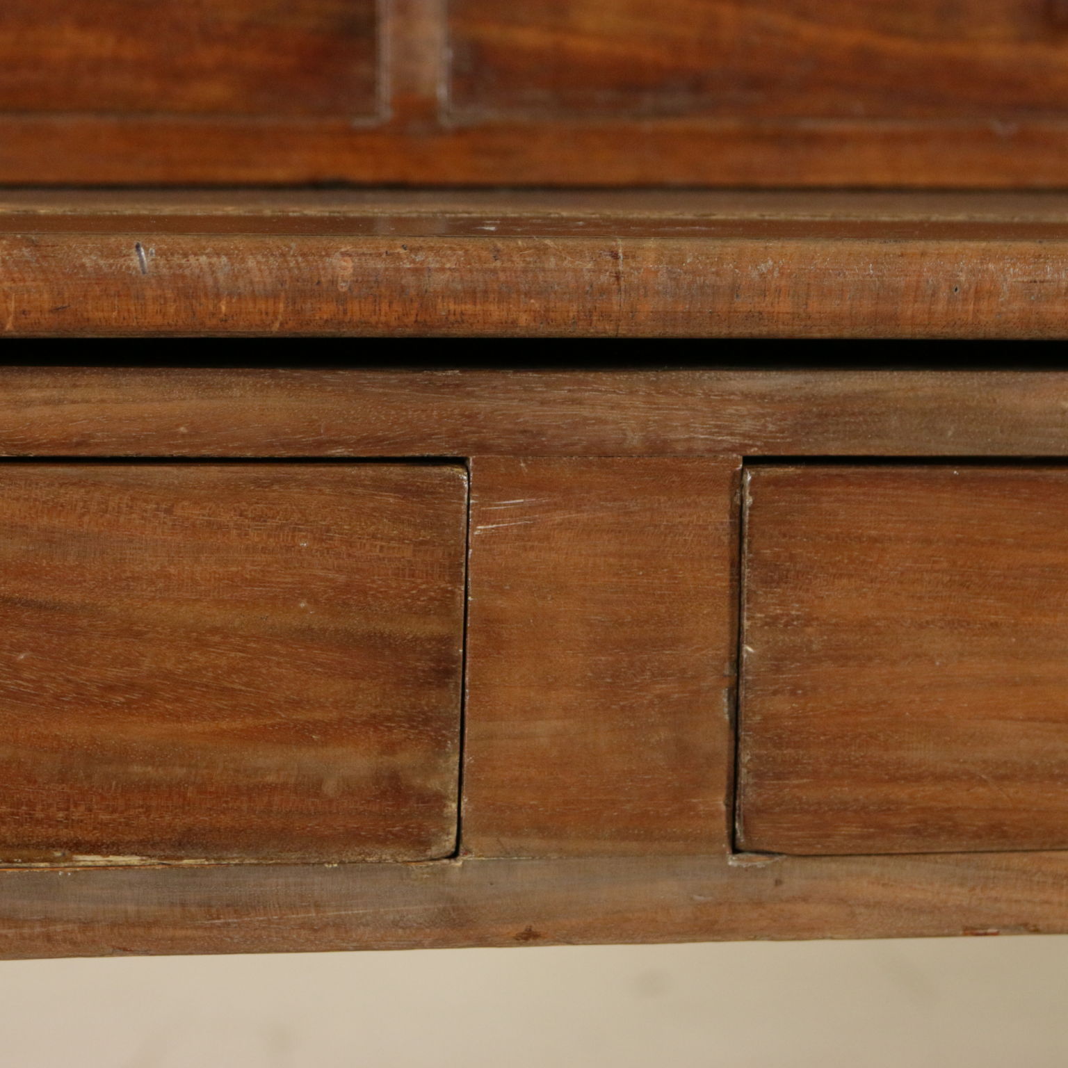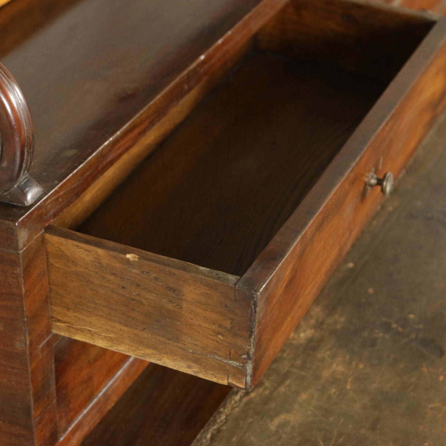 Elegante escritorio desde el centro apoyado por las patas torneadas cuenta con dos cajones y piso con inserto de cuero. Planteado con cuatro cajones y un estante apoyado por los pergaminos.