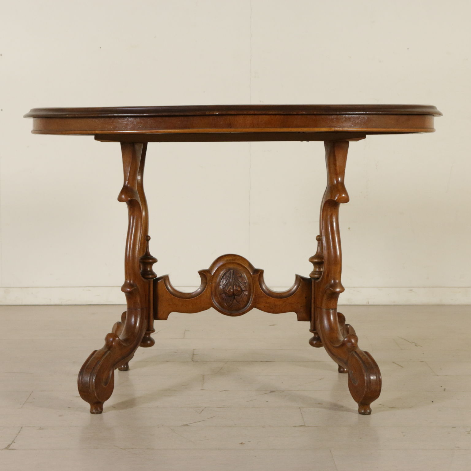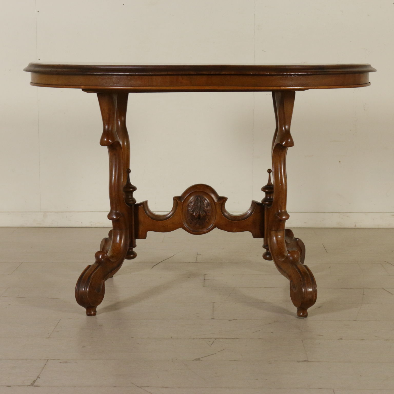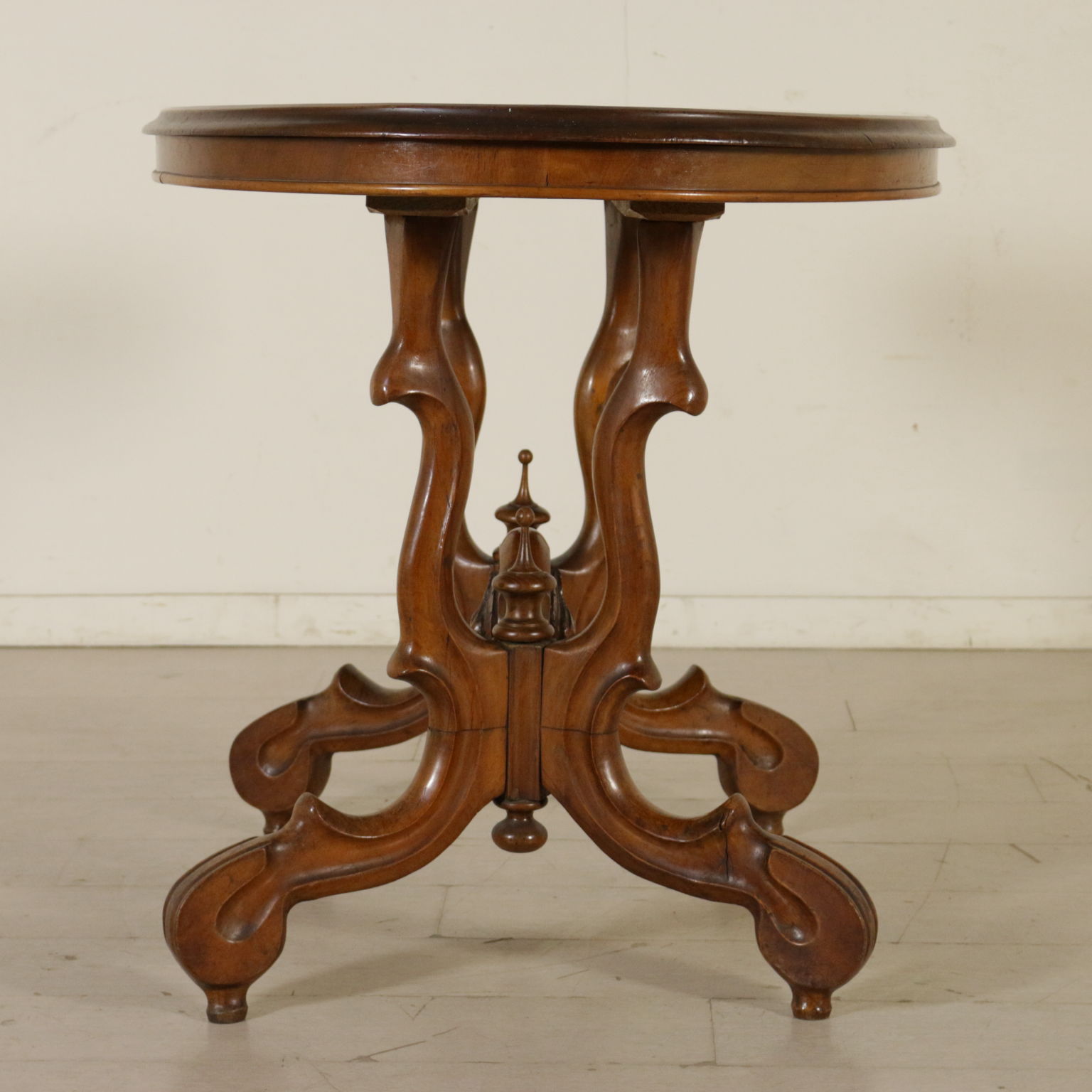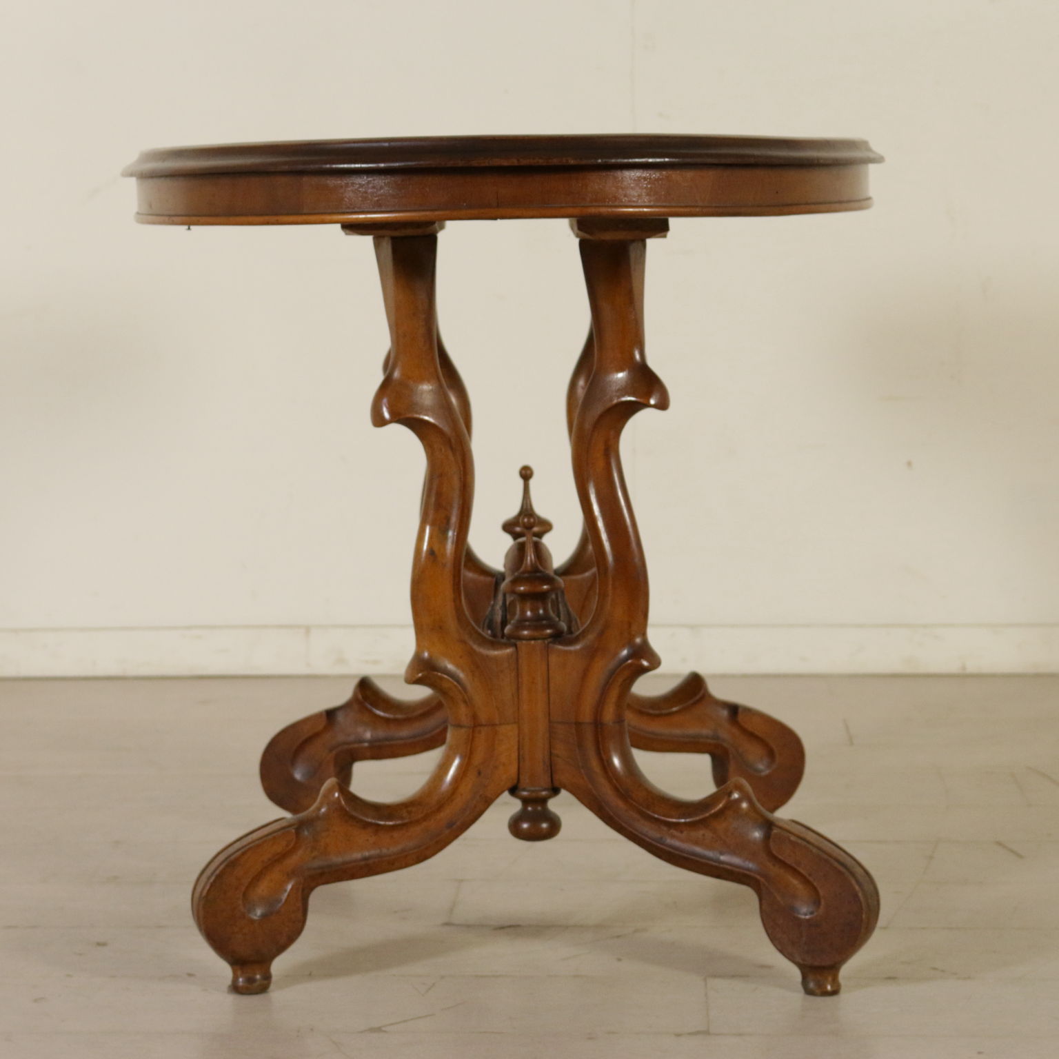 Apoyado por las piernas mueve conectado por los miembros de la cruz. Parte superior ovalada de madera chapada en la pluma de nogal cuatripartito.