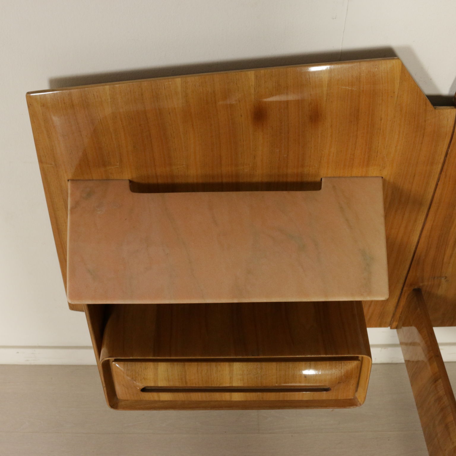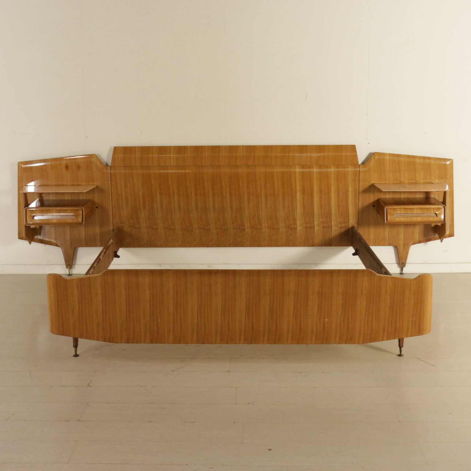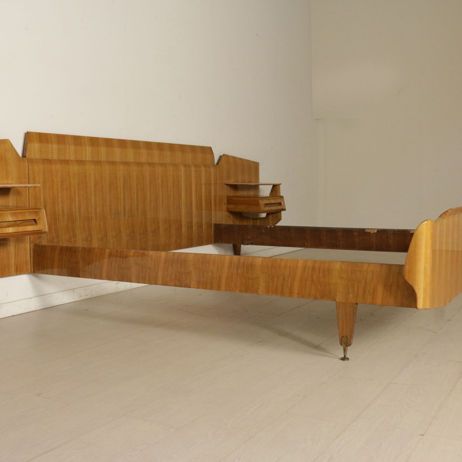 Letto matrimoniale con comodini pensili; legno impiallacciato noce, marmo, piedini in ottone.