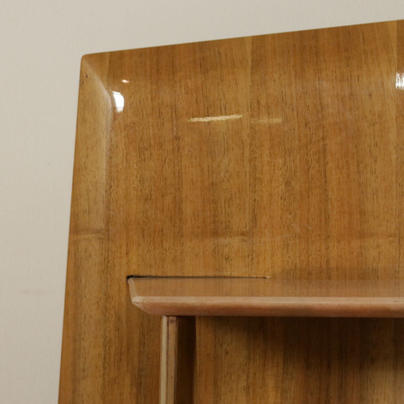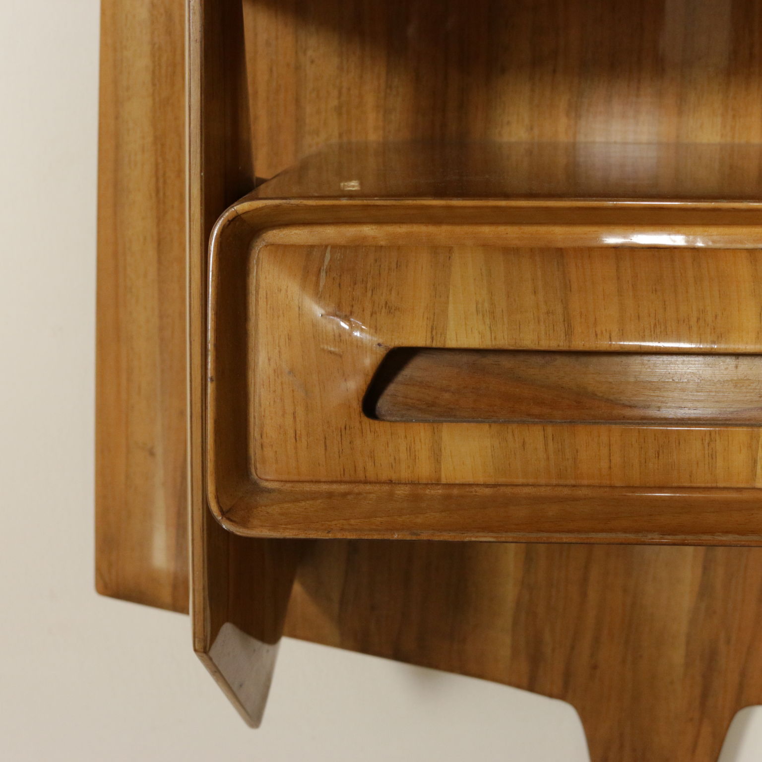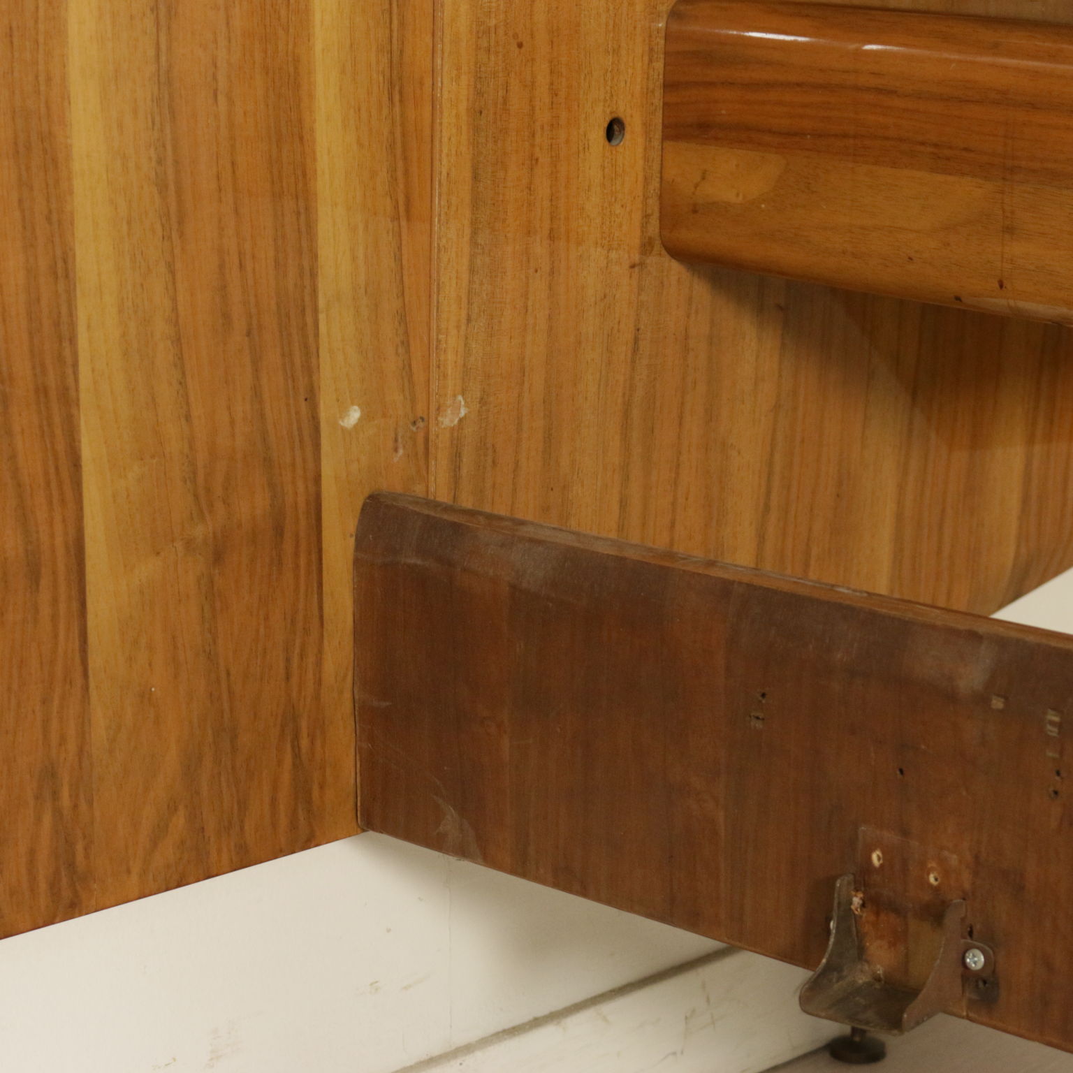Letto matrimoniale con comodini pensili; legno impiallacciato noce, marmo, piedini in ottone.