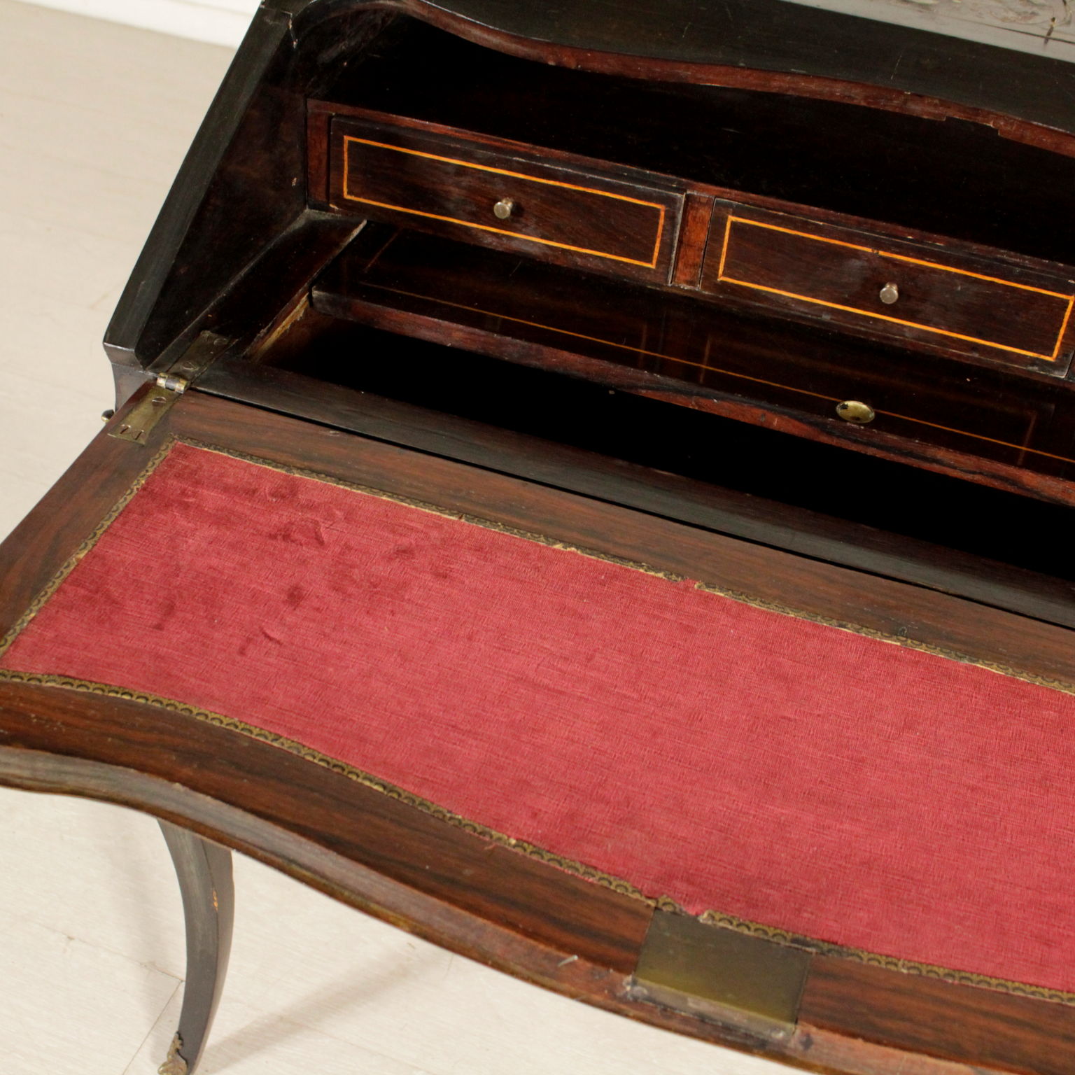 El estilo de escritura de Boulle escritorio apoyado por las piernas mueve tiene la inclinación de la puerta, moldeada. En el interior de la inserción en la tela, deslizando la parte superior y tres cajones compartimiento. Reserva en latón y carey. Frisos de bronce.
