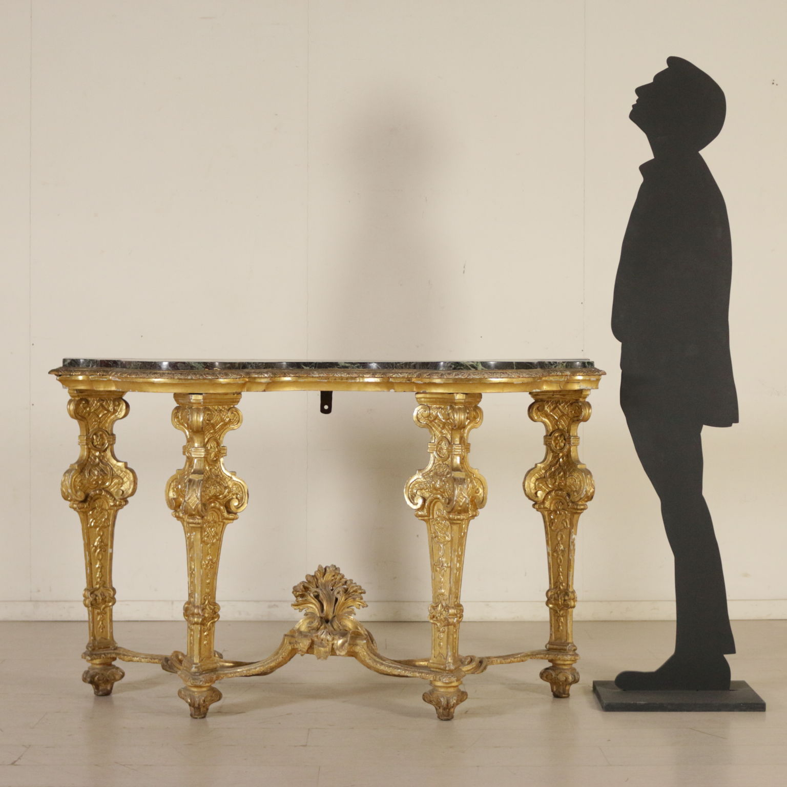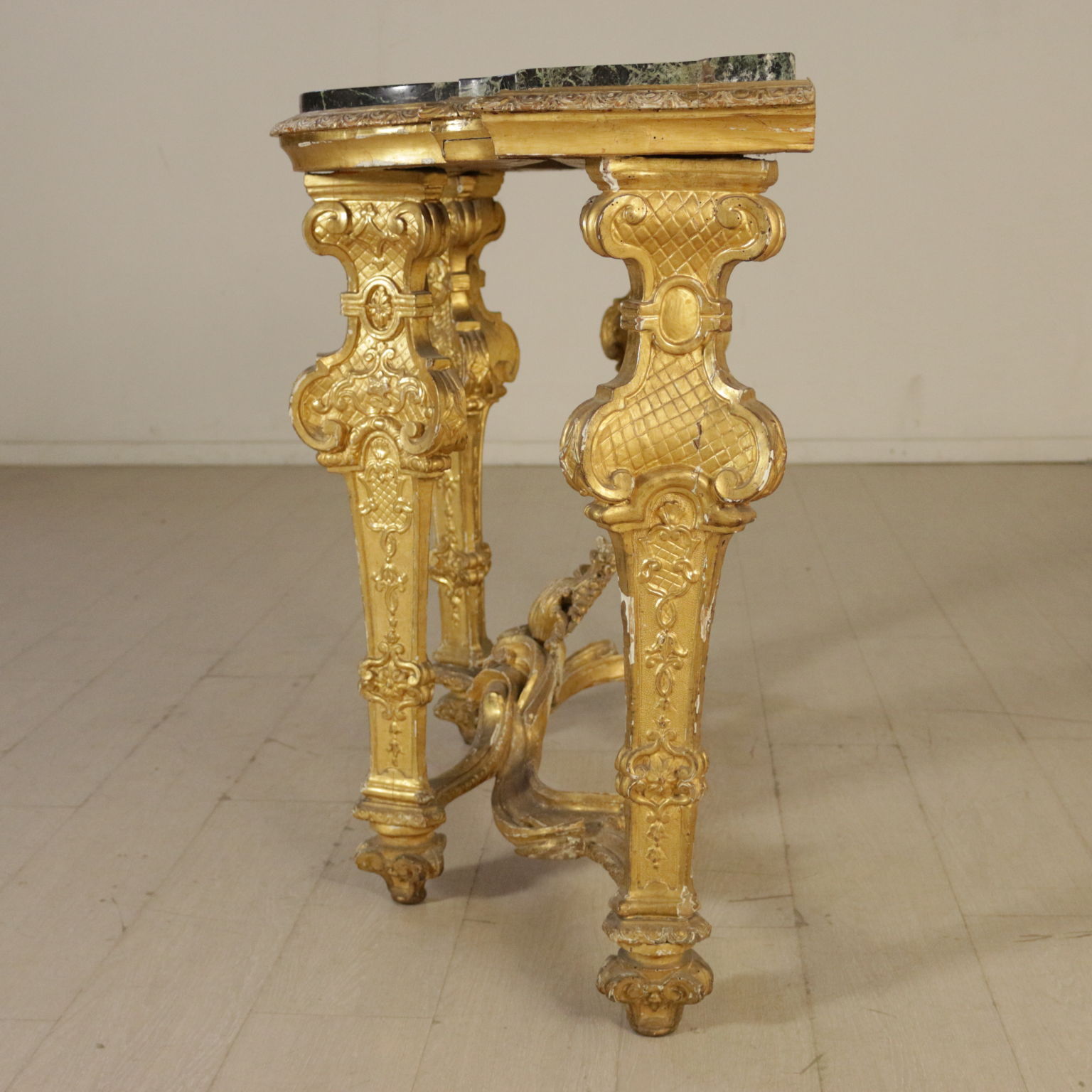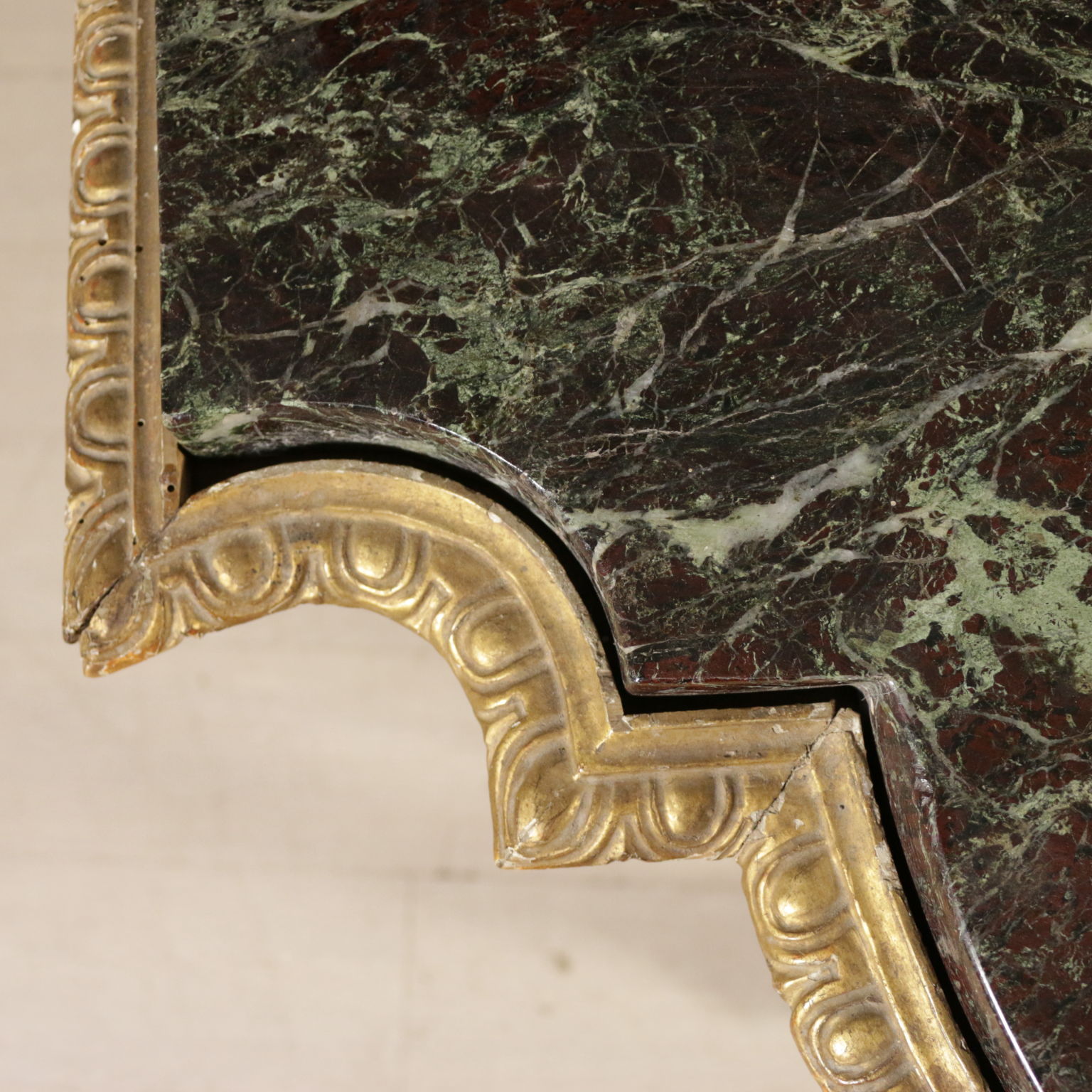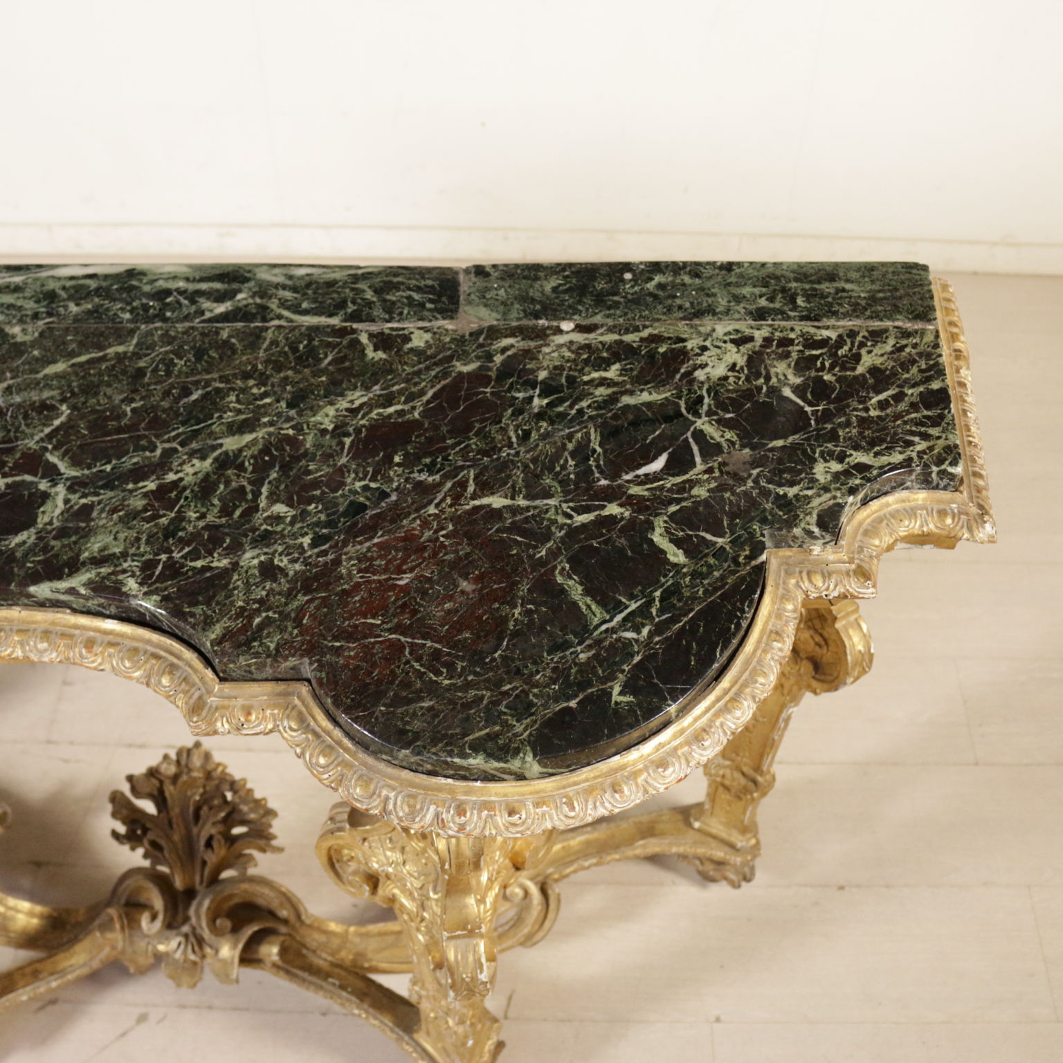 Elegante mesa de consola apoyado en cuatro patas están finamente talladas y conectado por crucero moldeada con el centro de la talla. La forma de la parte superior con la parte superior de mármol verde hundidos. El aumento en la profundidad en un período posterior. Totalmente de oro.