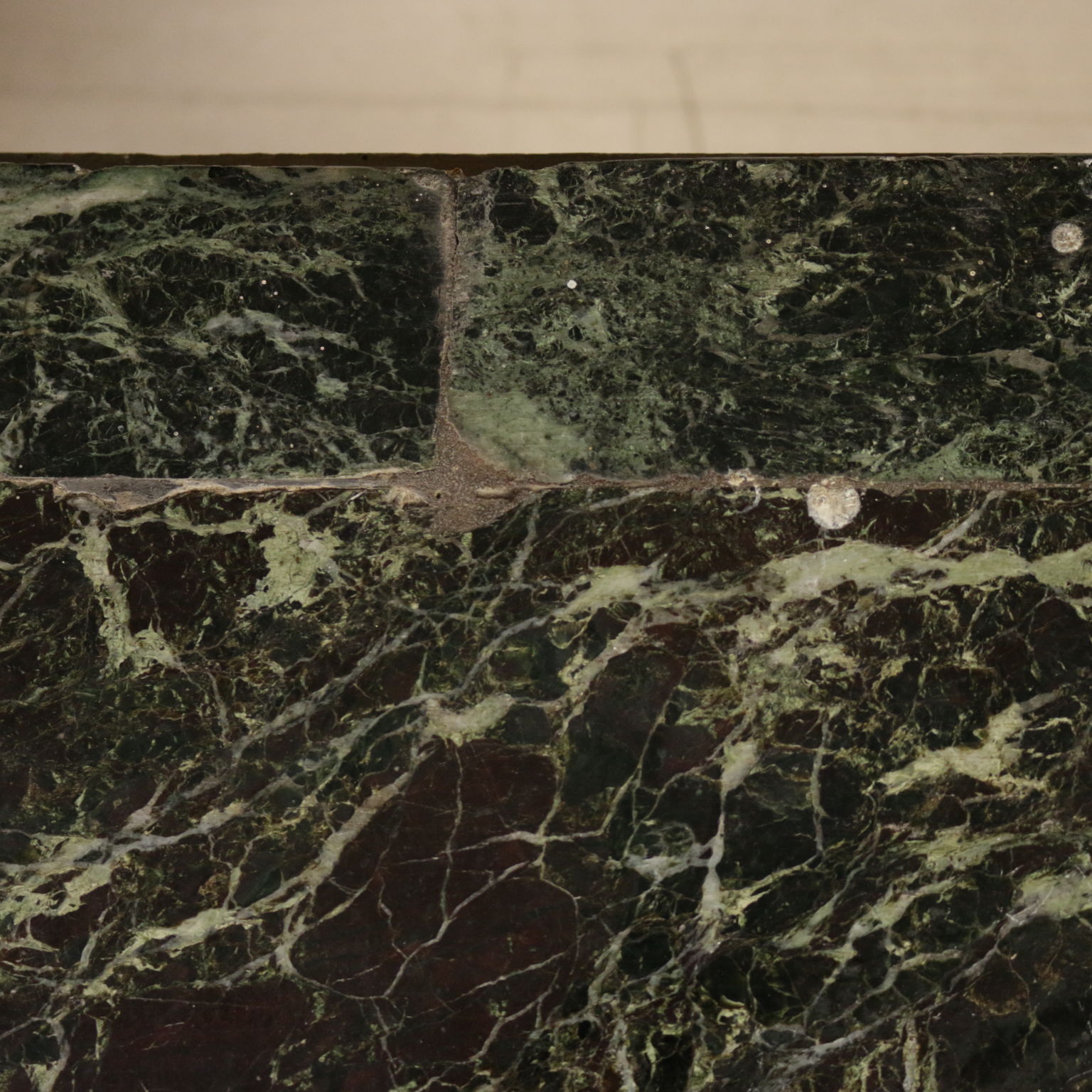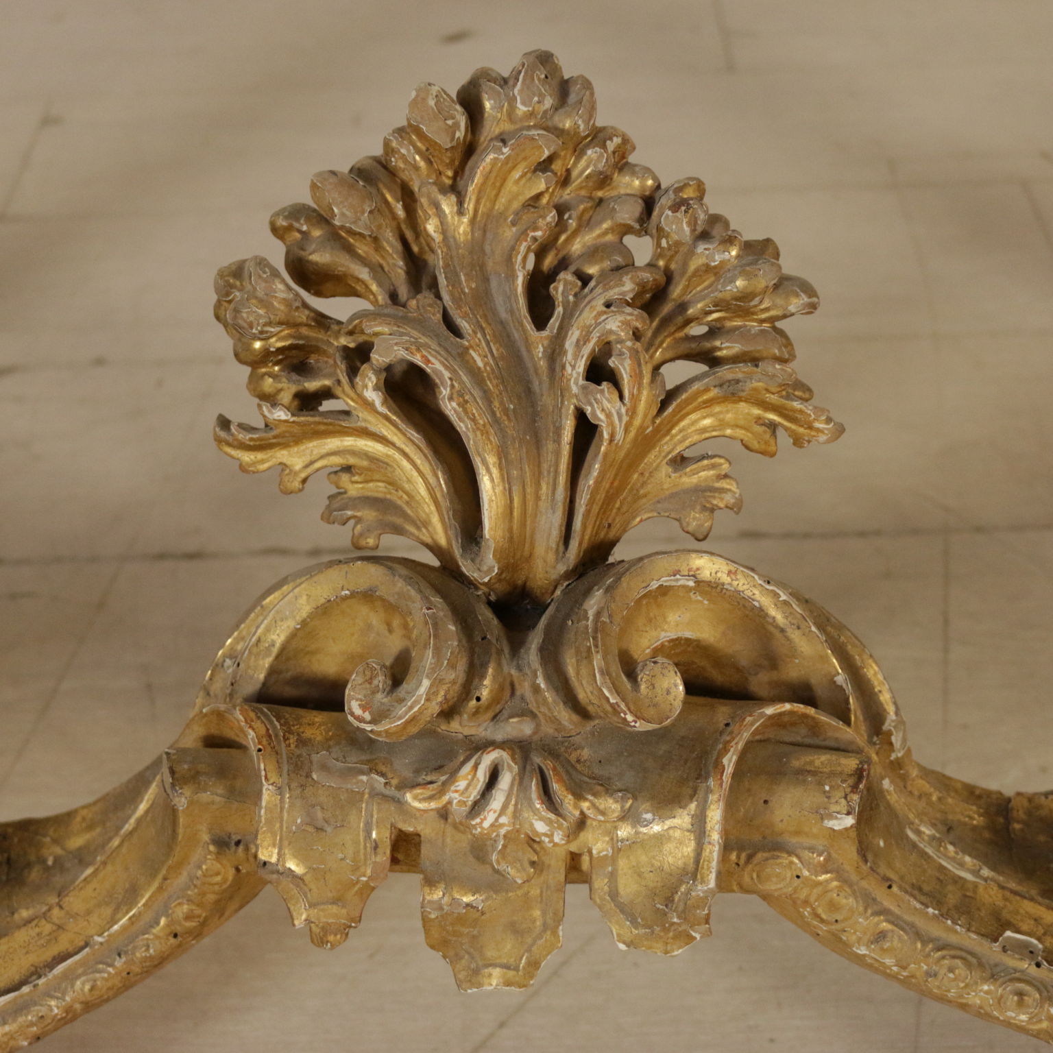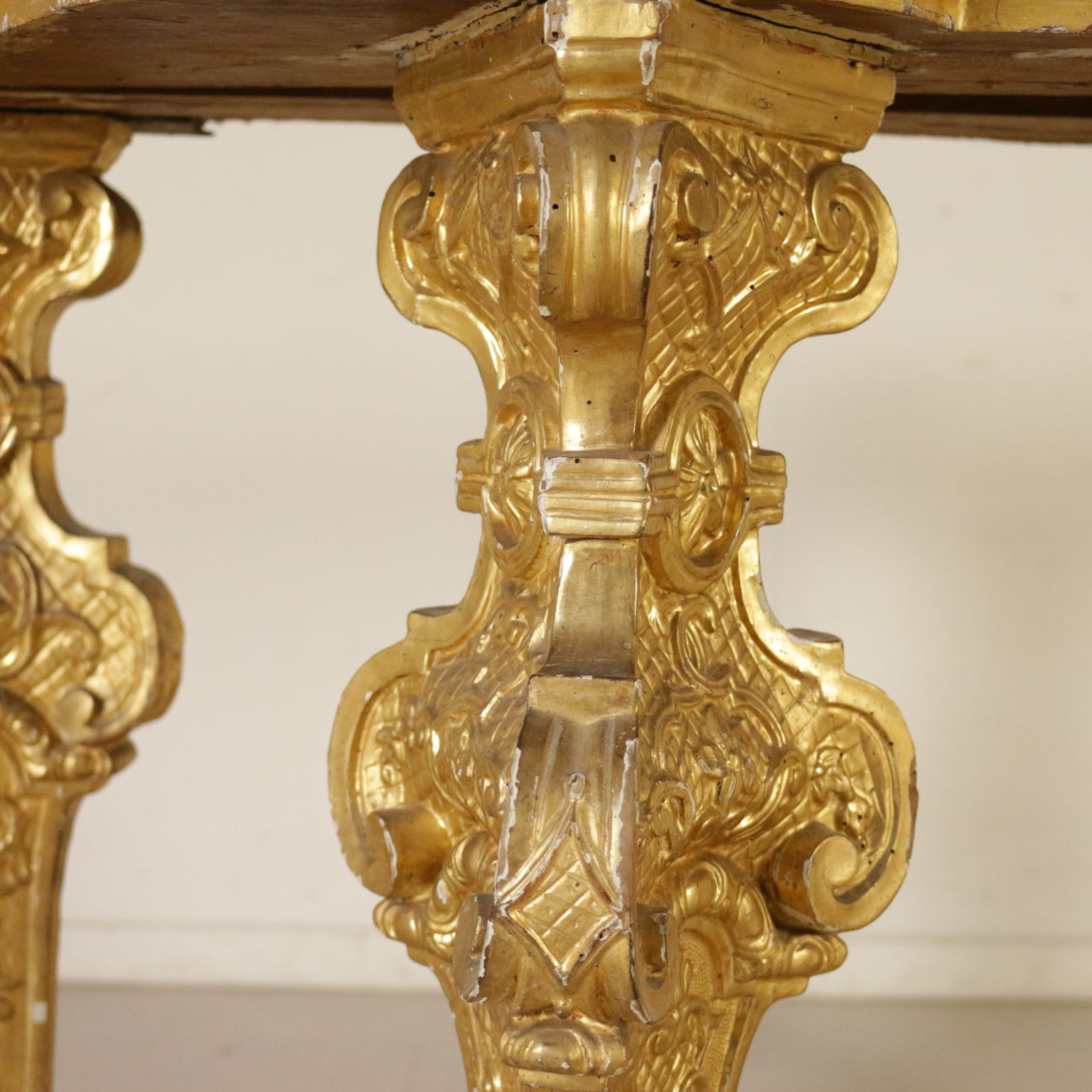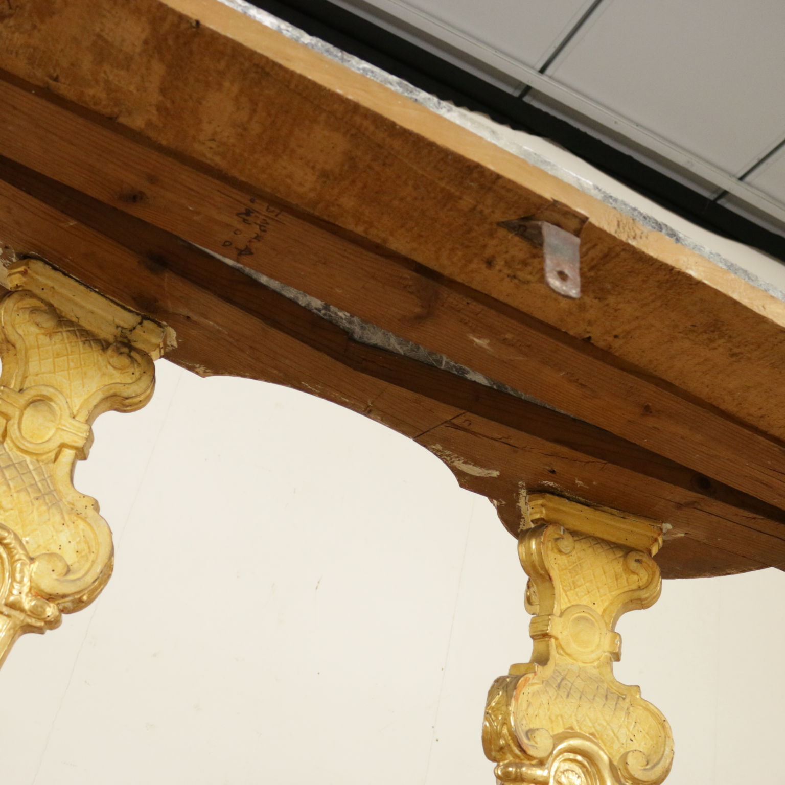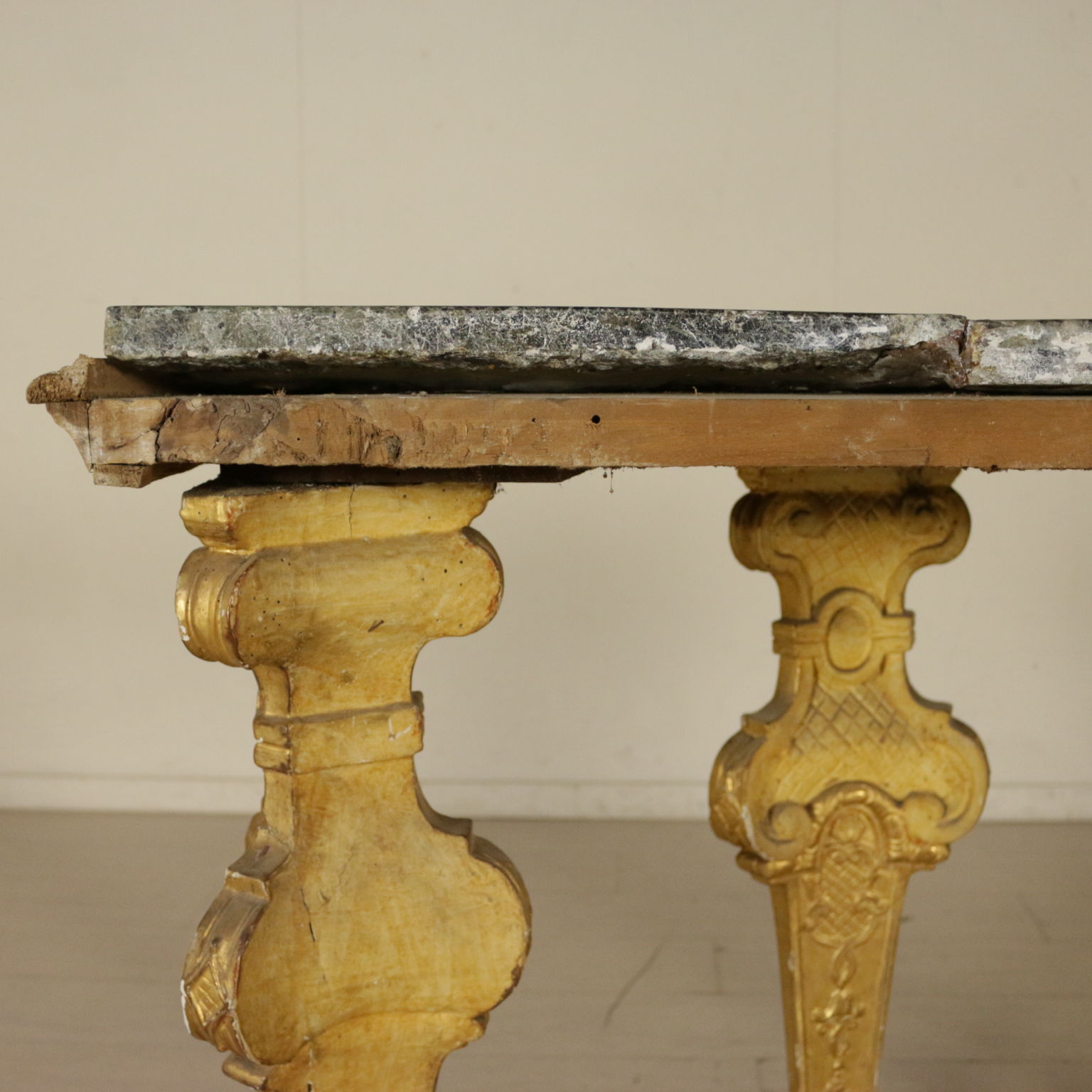 Elegante mesa de consola apoyado en cuatro patas están finamente talladas y conectado por crucero moldeada con el centro de la talla. La forma de la parte superior con la parte superior de mármol verde hundidos. El aumento en la profundidad en un período posterior. Totalmente de oro.