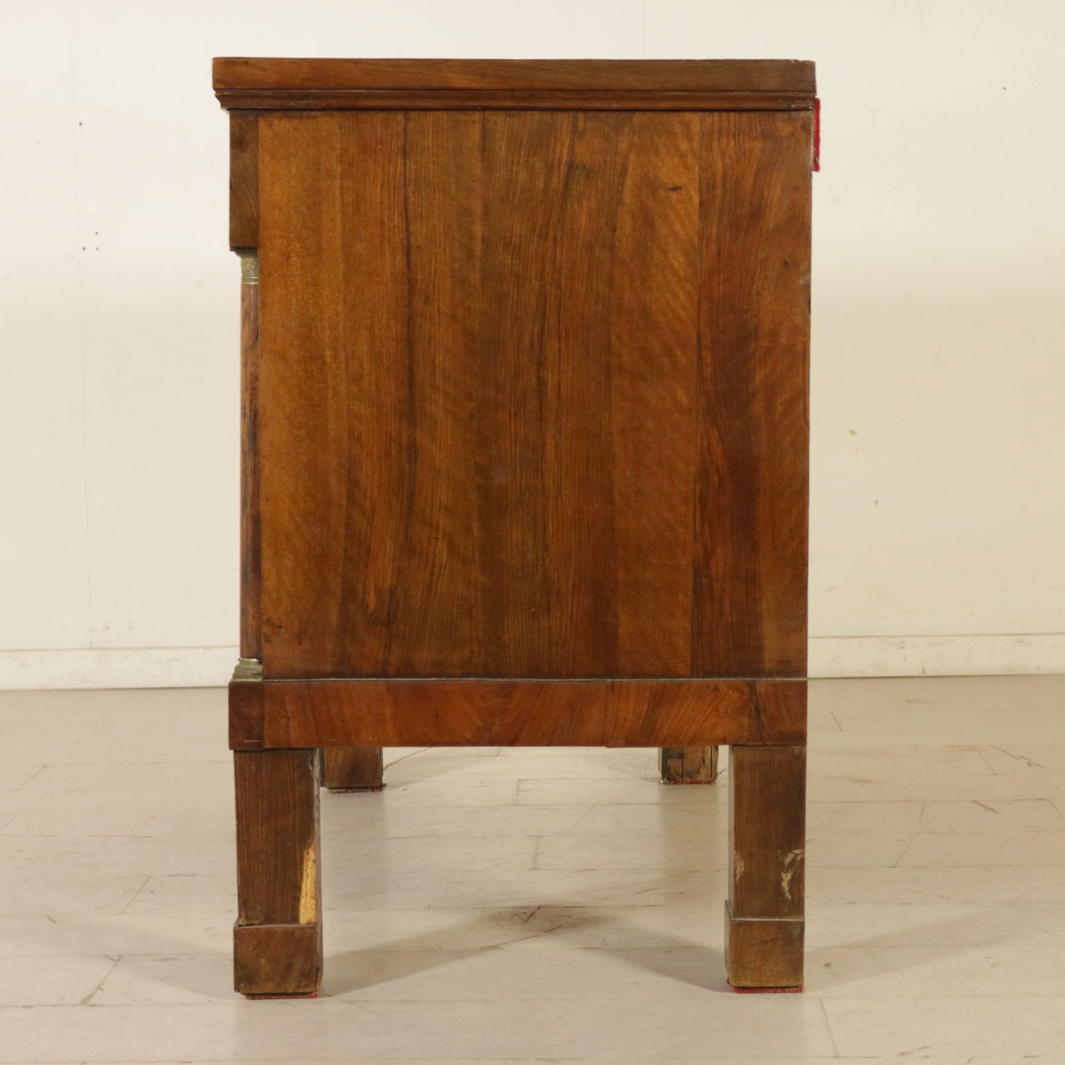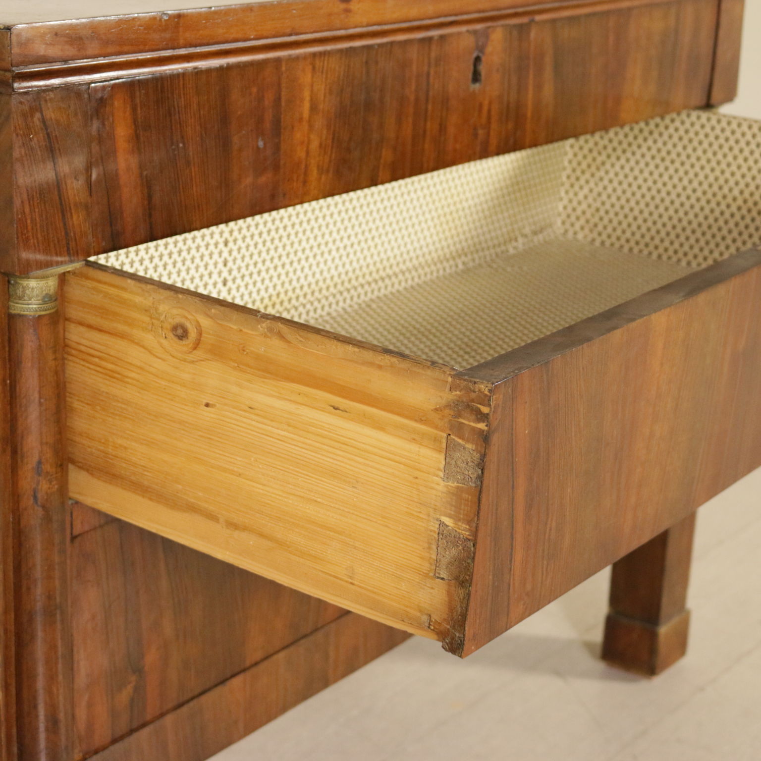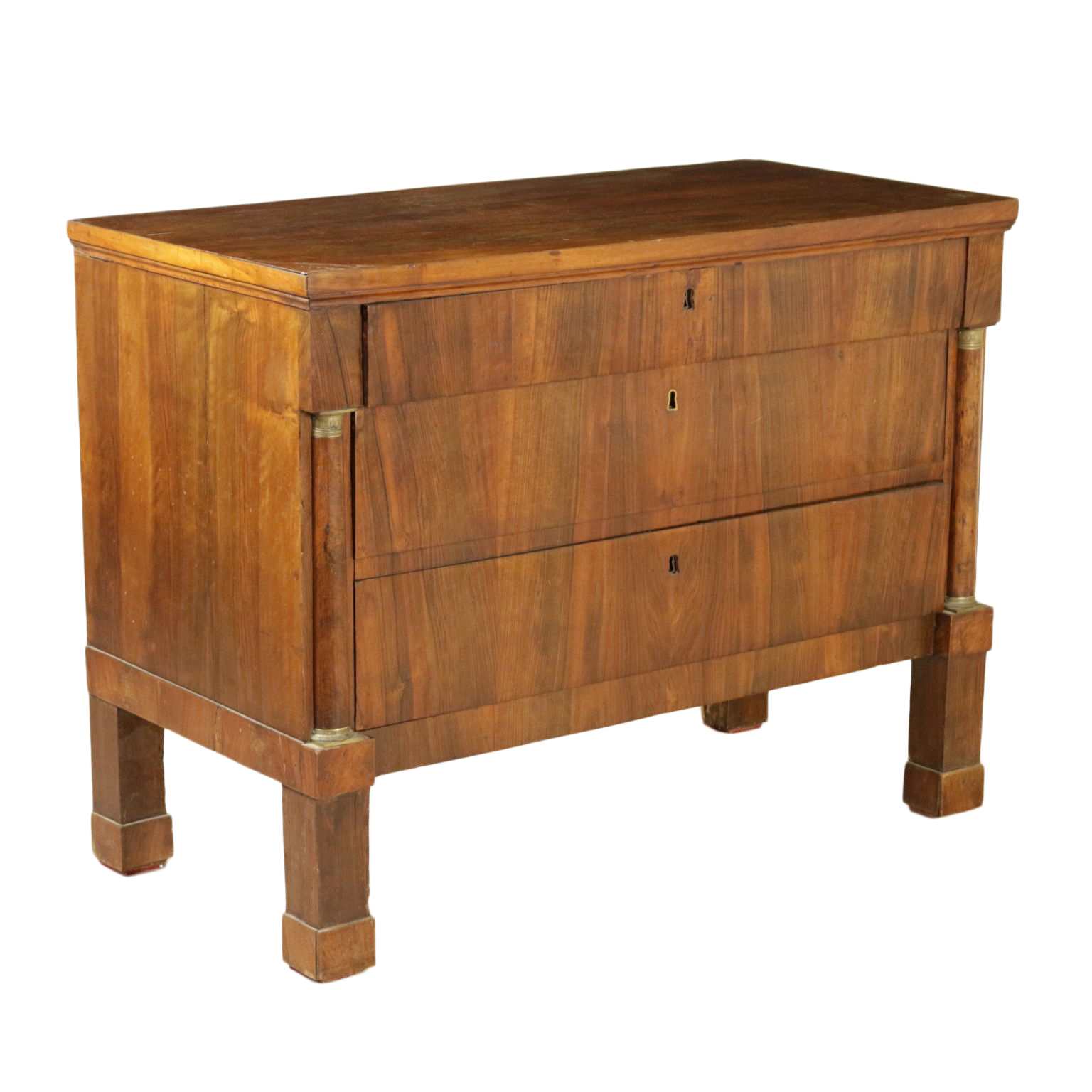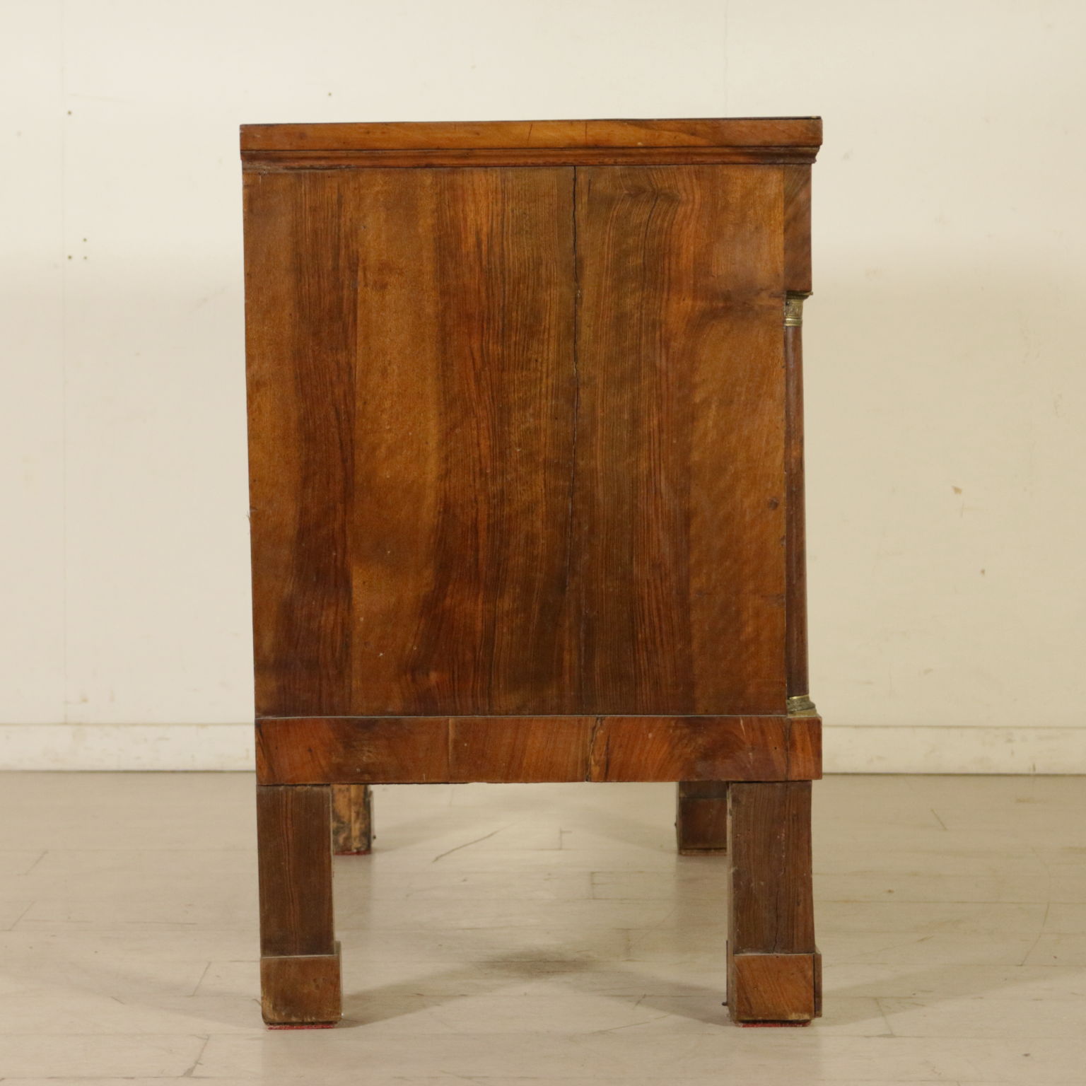 Pecho de cajones Imperio dos cajones más uno ligeramente la proyección. Pilares con medias columnas con capiteles de bronce y los pies al zócalo.