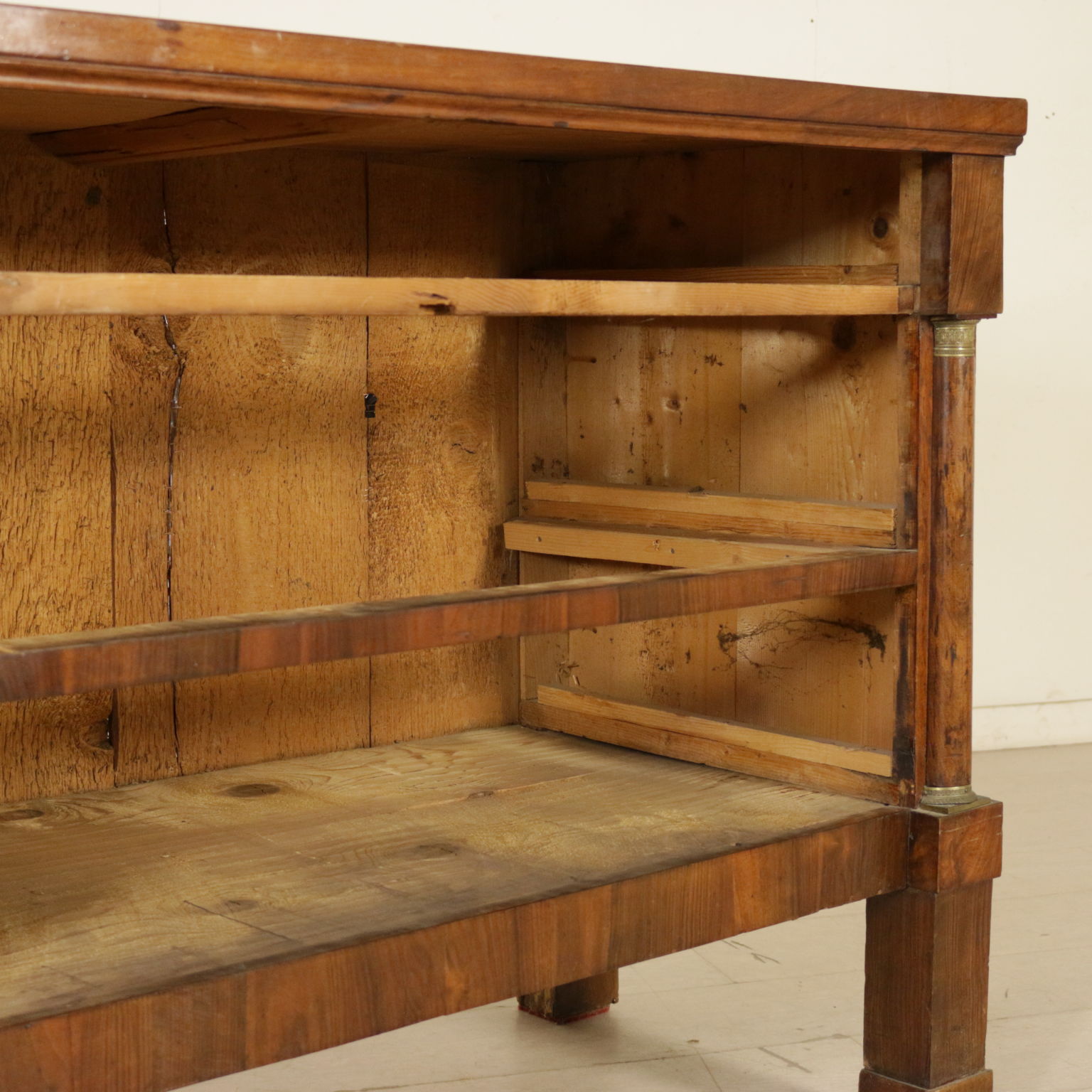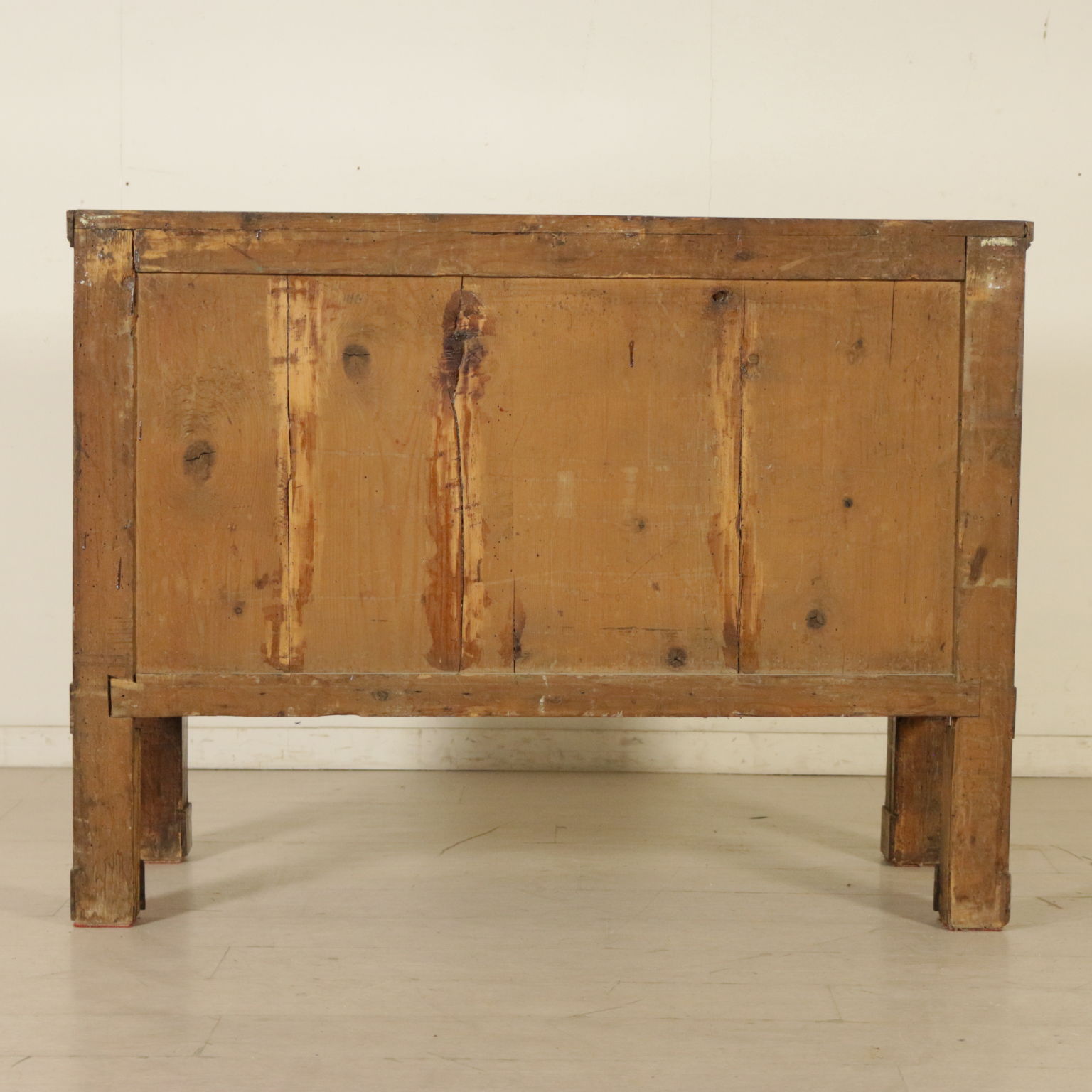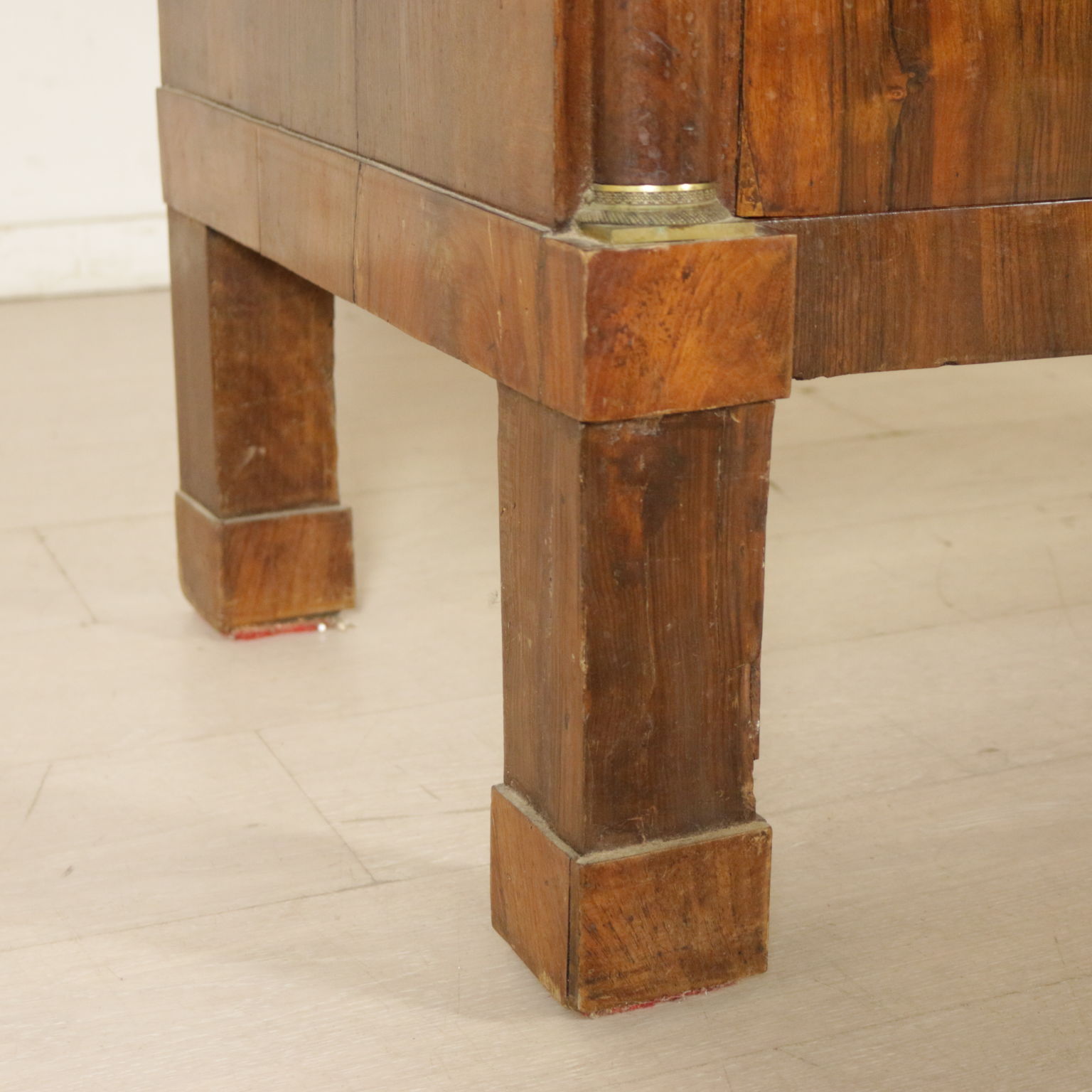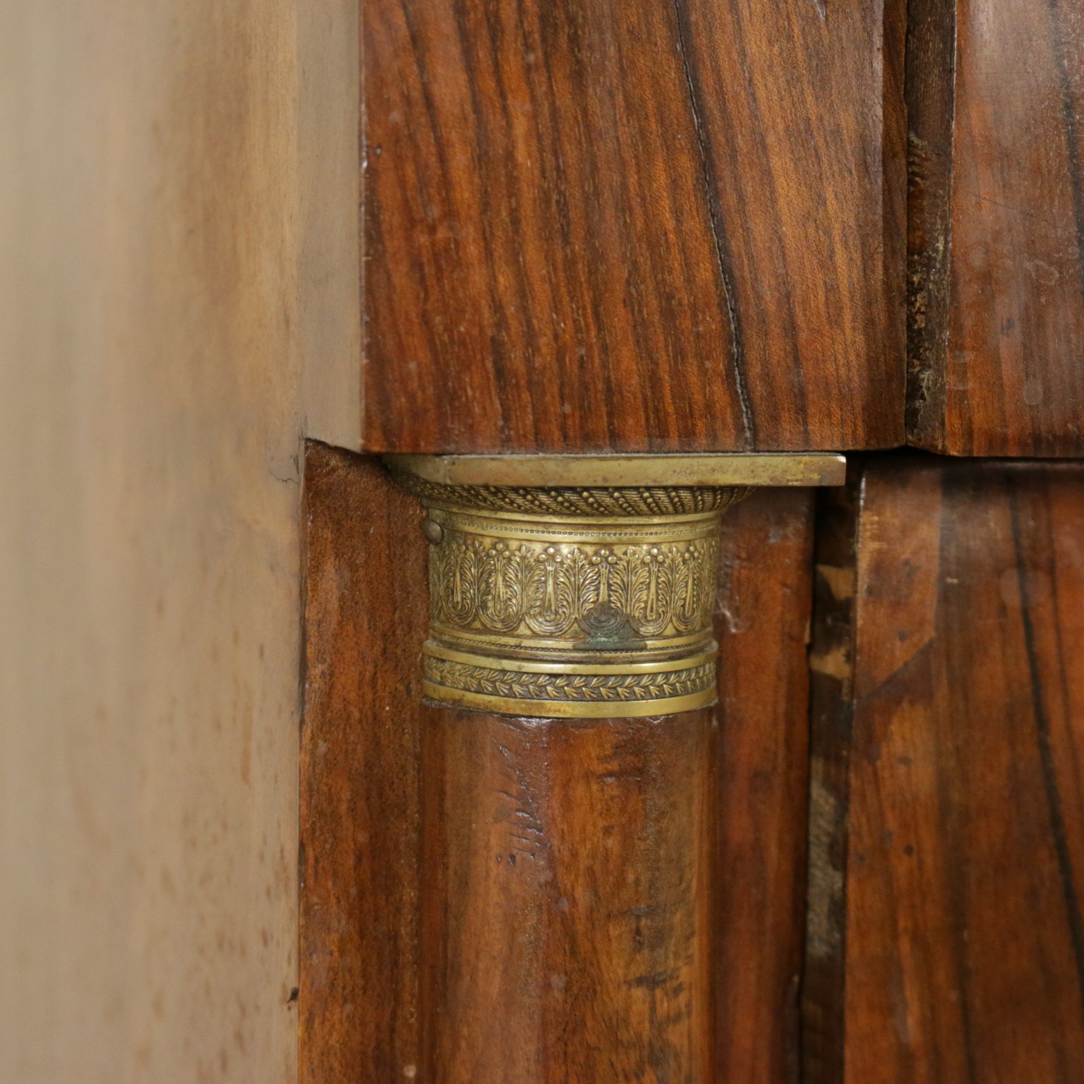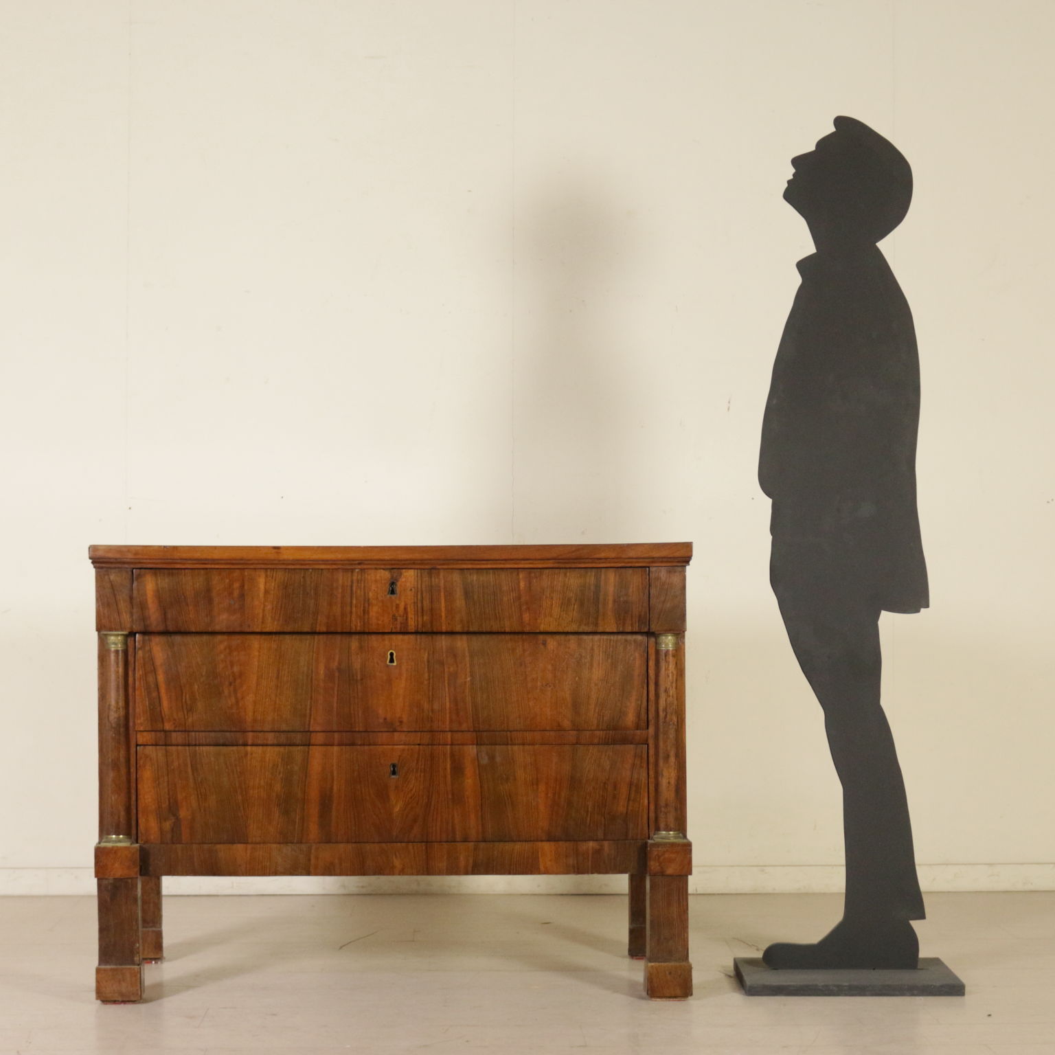 Pecho de cajones Imperio dos cajones más uno ligeramente la proyección. Pilares con medias columnas con capiteles de bronce y los pies al zócalo.