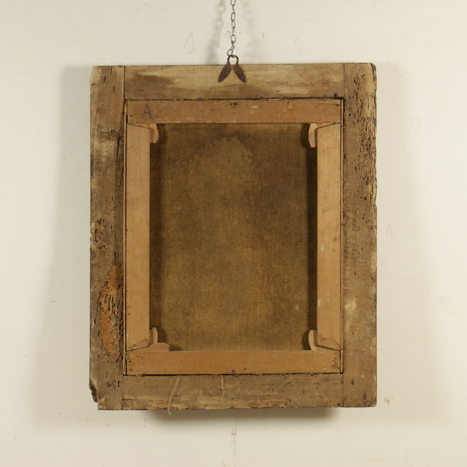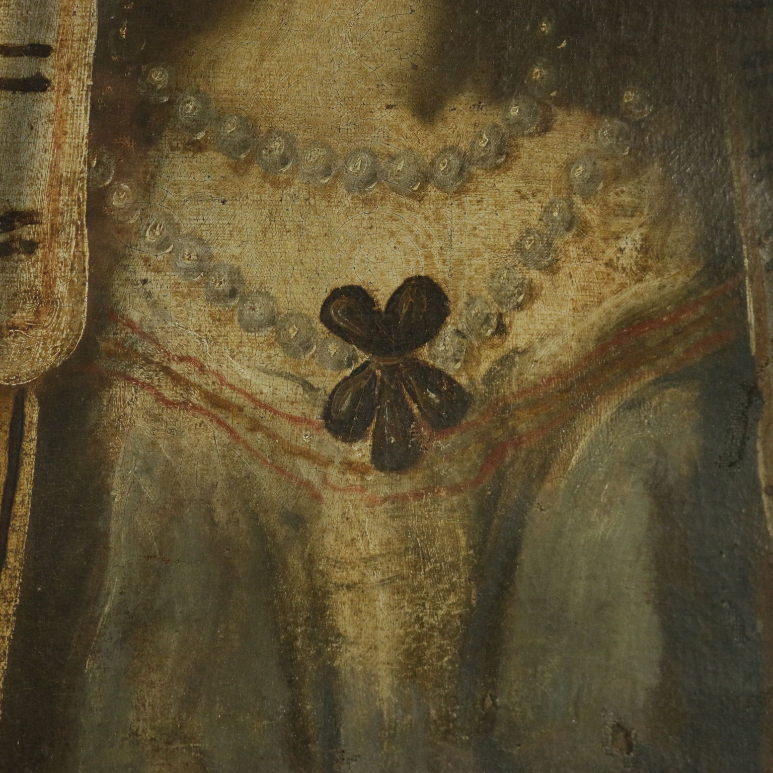 Óleo sobre lienzo. En la parte superior está escrito sólo parcialmente legible, probablemente identificar el retrato del personaje. Algunos daños menores. Presentado en el antiguo marco.