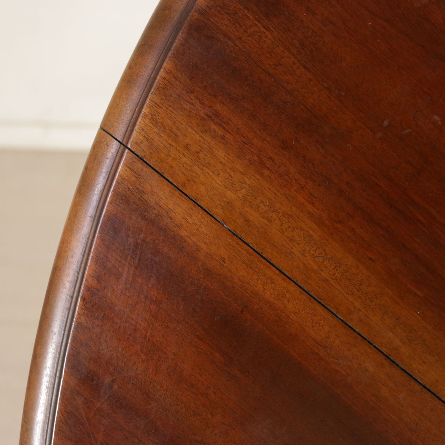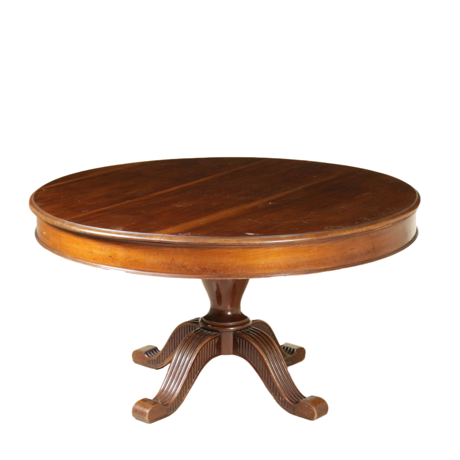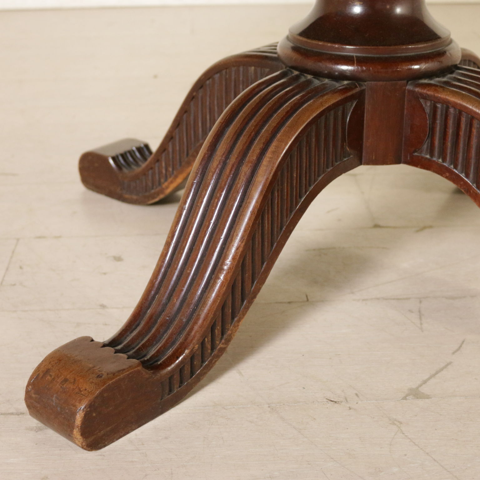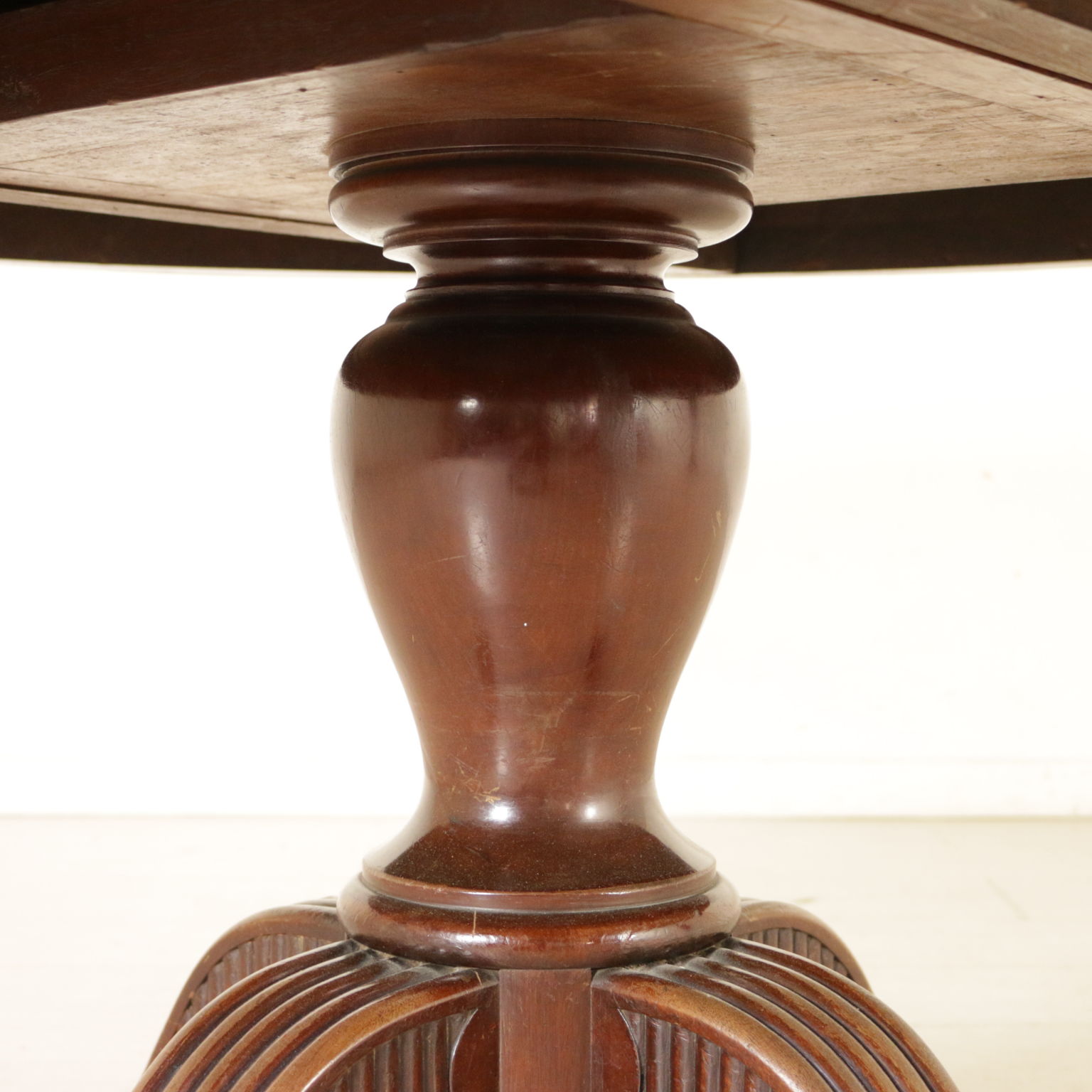 Mesa apoyada por balaustre terminando con el pie movido y tallado. Parte superior redonda en madera maciza de nogal.