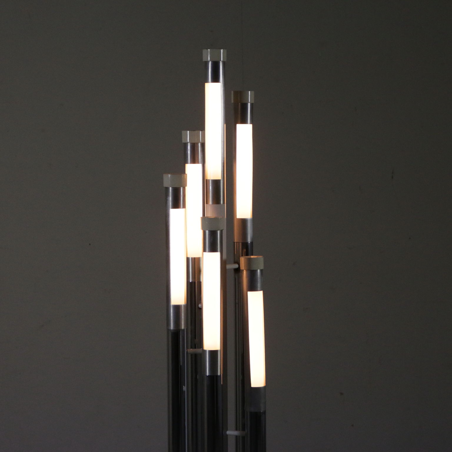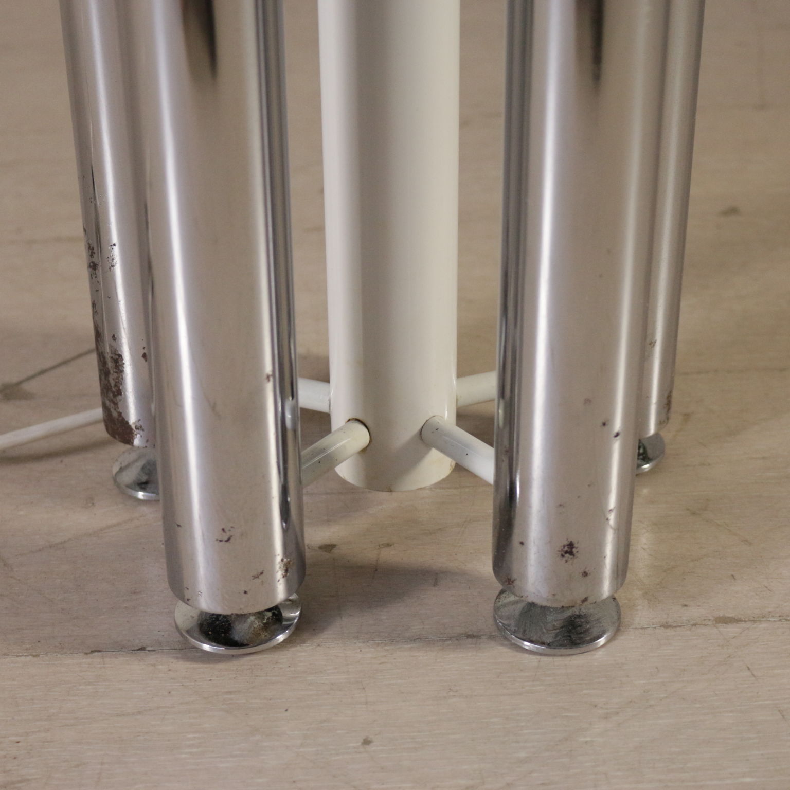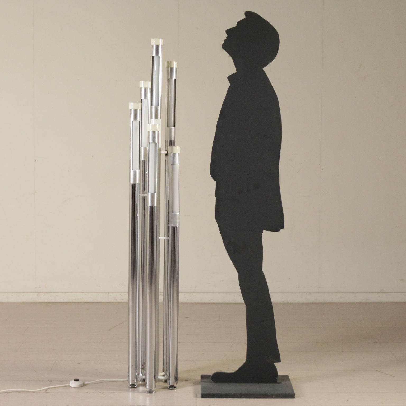 Lámpara de piso; el metal cromado y aluminio lacado.