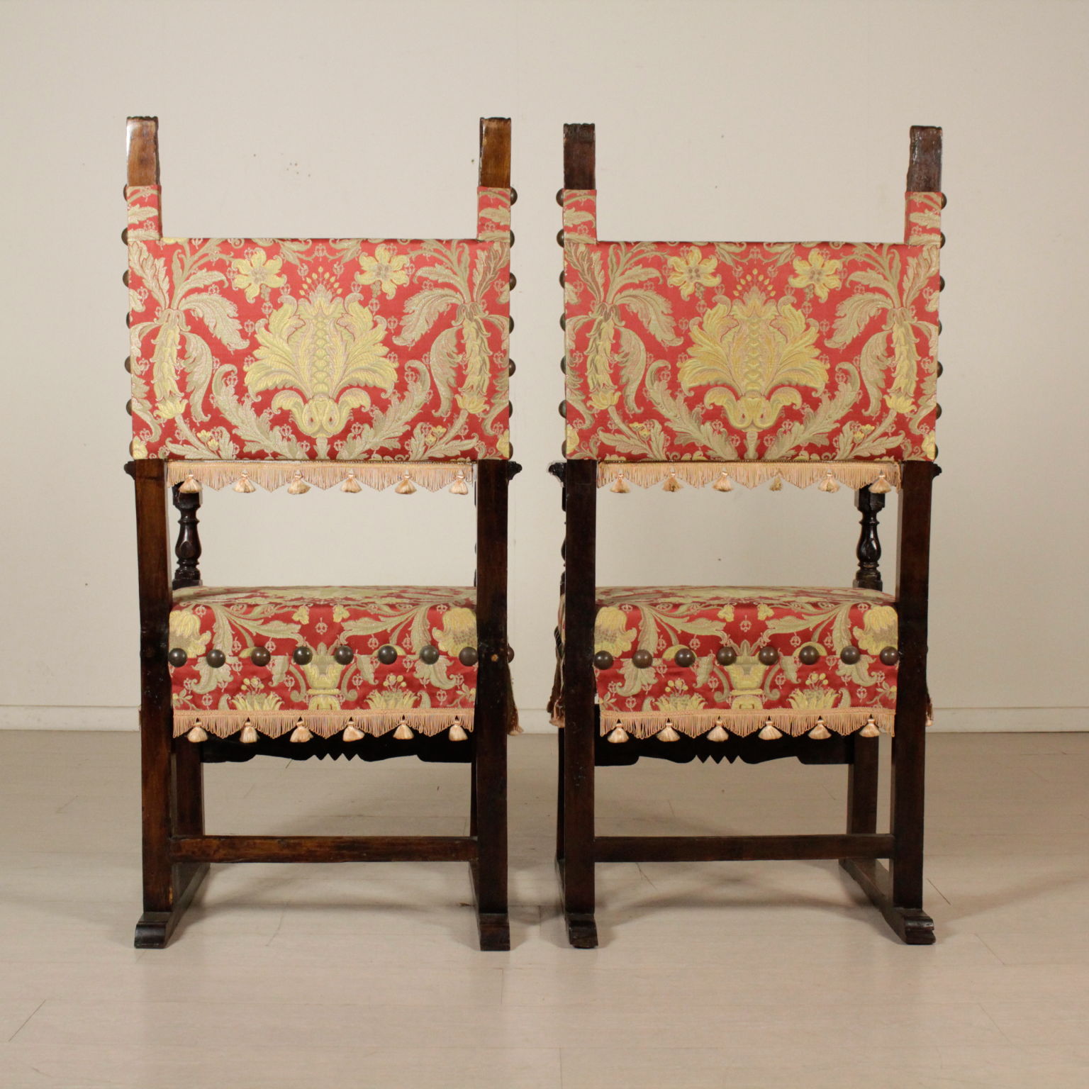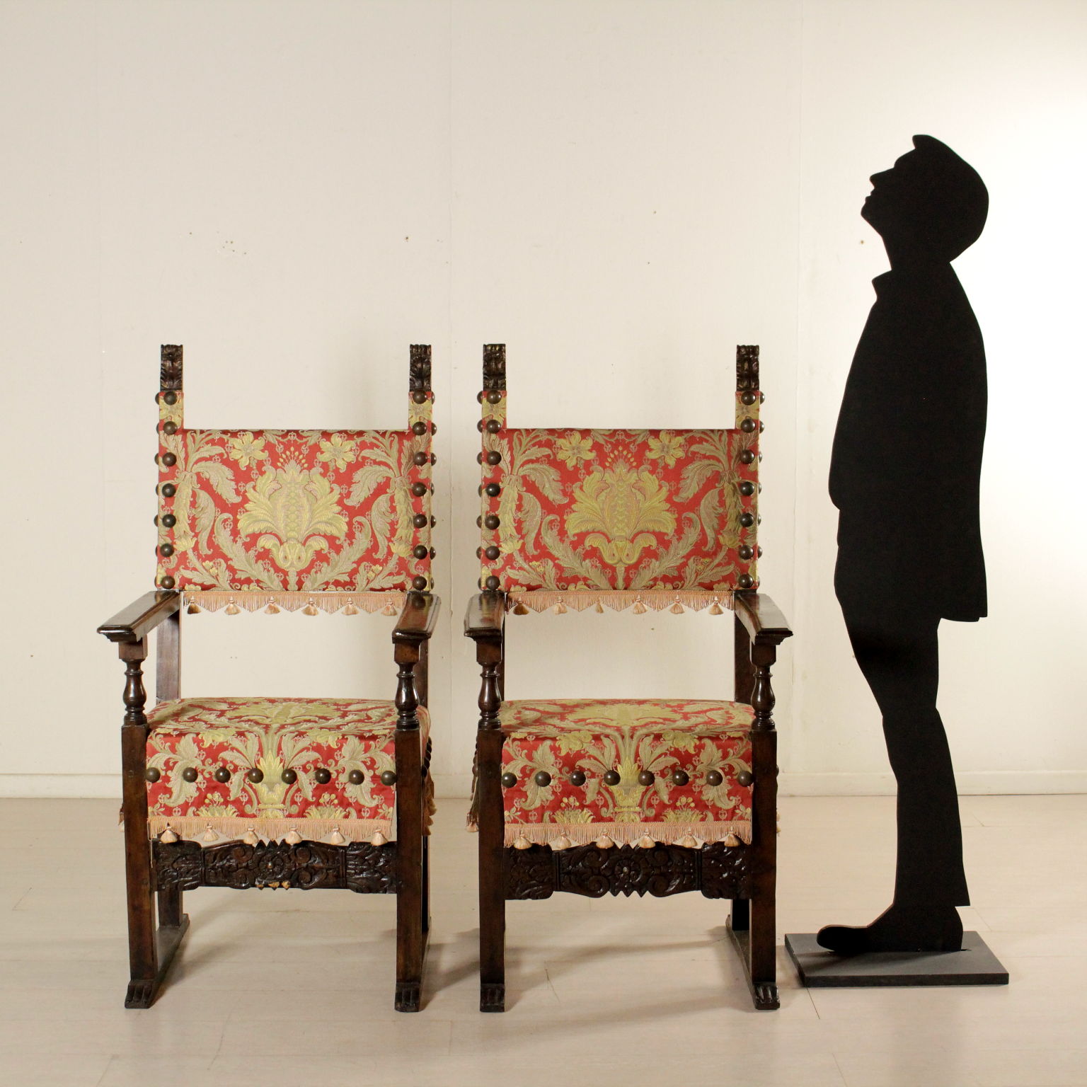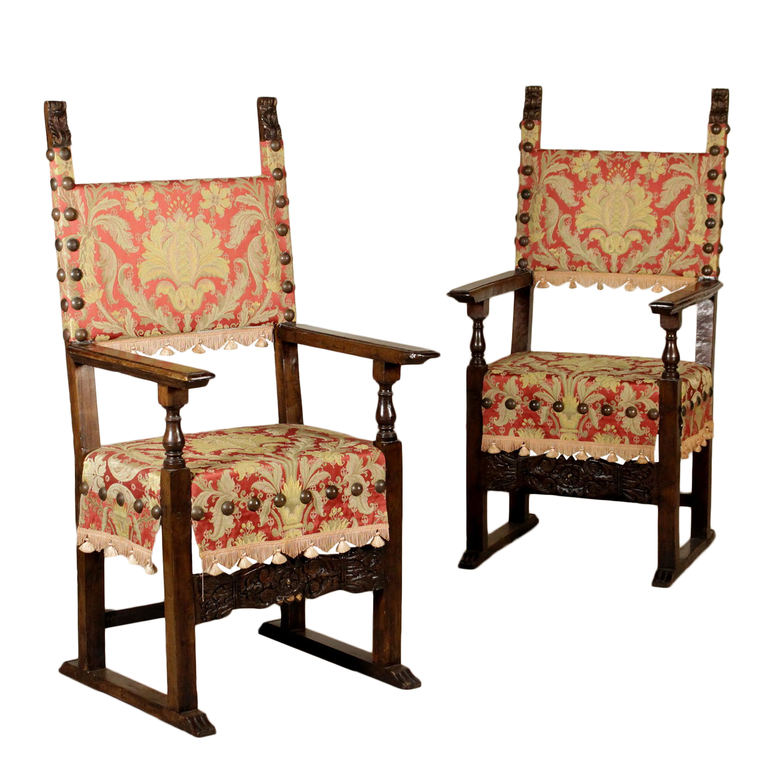 Par importante sillas tienen amplia brazos rectos verticales con activado. Las carpetas están finamente talladas. El asiento y el respaldo con los terminales de los muebles tapizados. Hecho restauraciones.