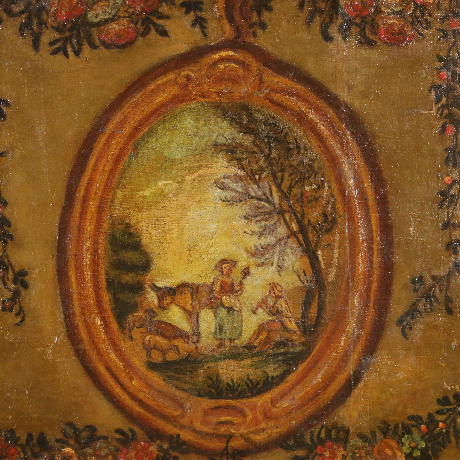 Óleo sobre lienzo aplicado a un panel de madera contrachapada. El panel se enmarca y se divide en dos paneles por las tiras de oro chapado de madera; no hay trozos de la parte inferior del panel. En el panel superior, enmarcado por los motivos florales,dentro de un marco pintado, una escena pastoral con los pastores tocar instrumentos musicales.