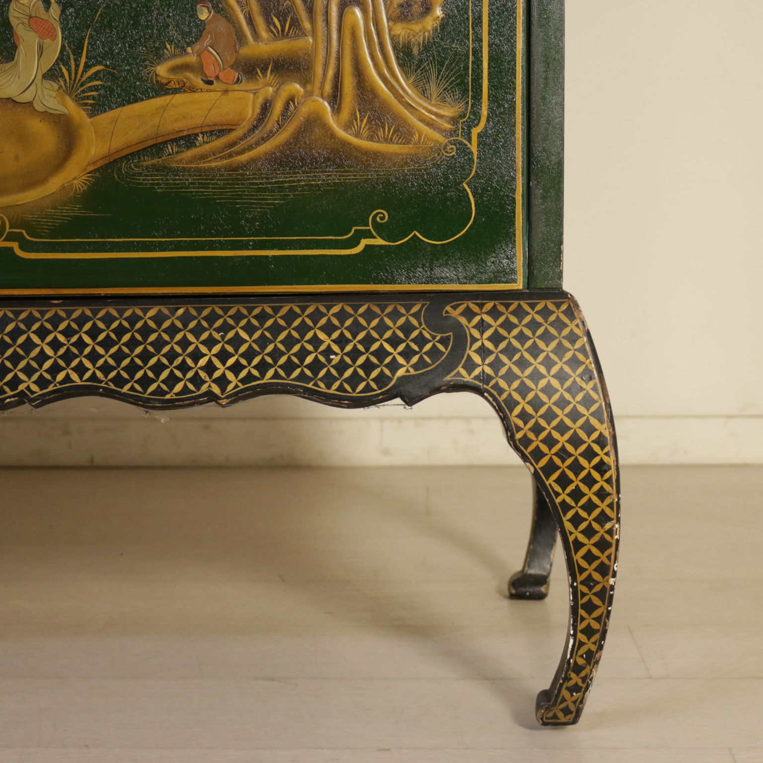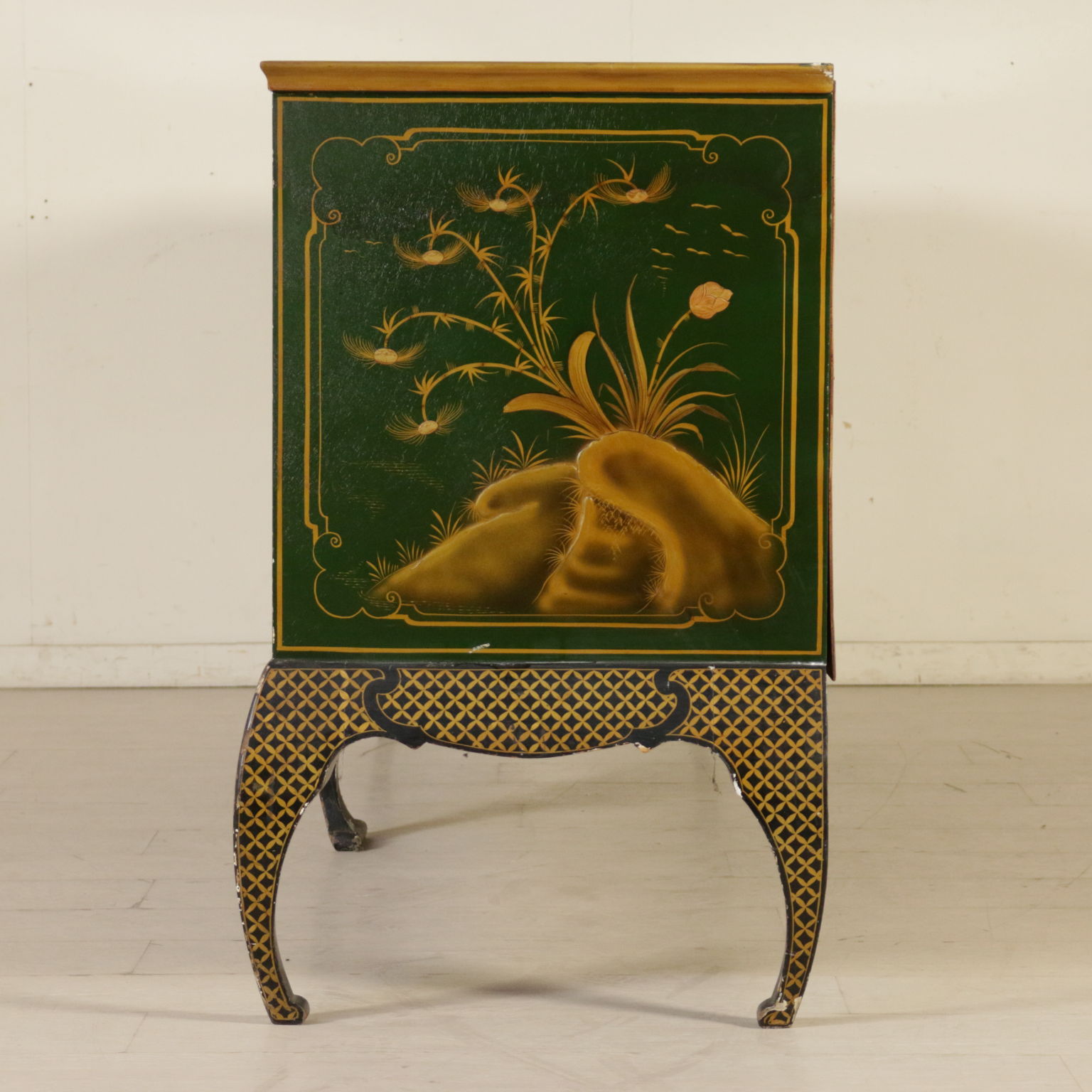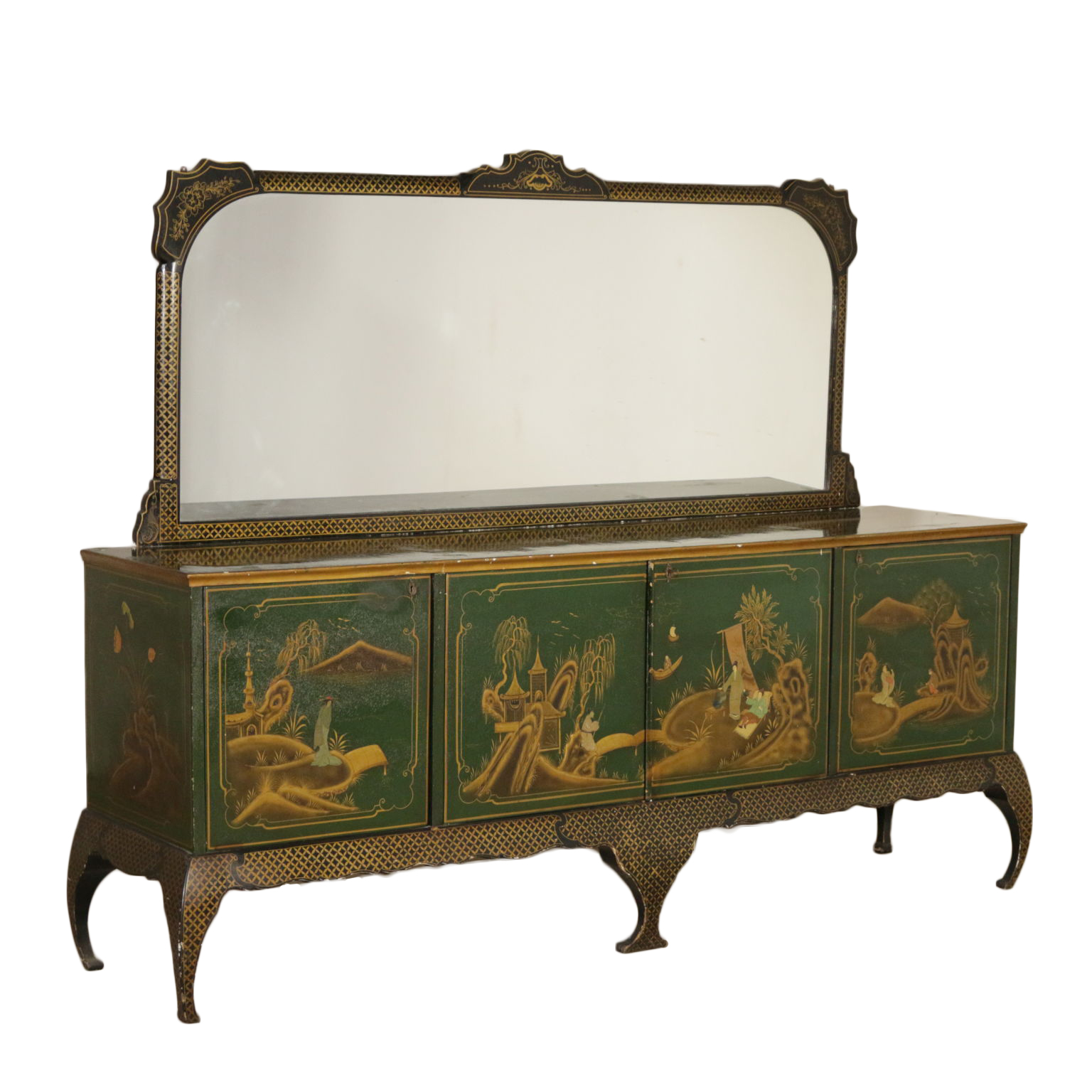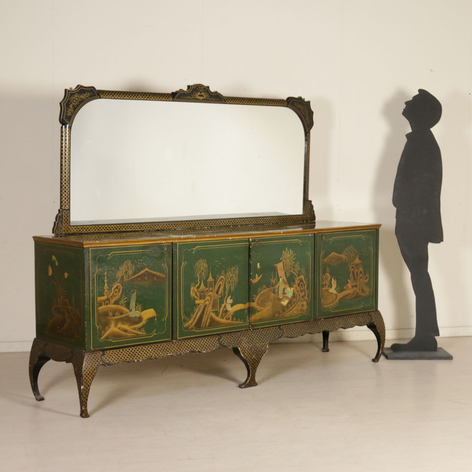 Directamente desde el cárter por la línea ondulada; tiene cuatro puertas y un espejo. Lacado y decorado en policromada con motivos de la chinoiserie.
