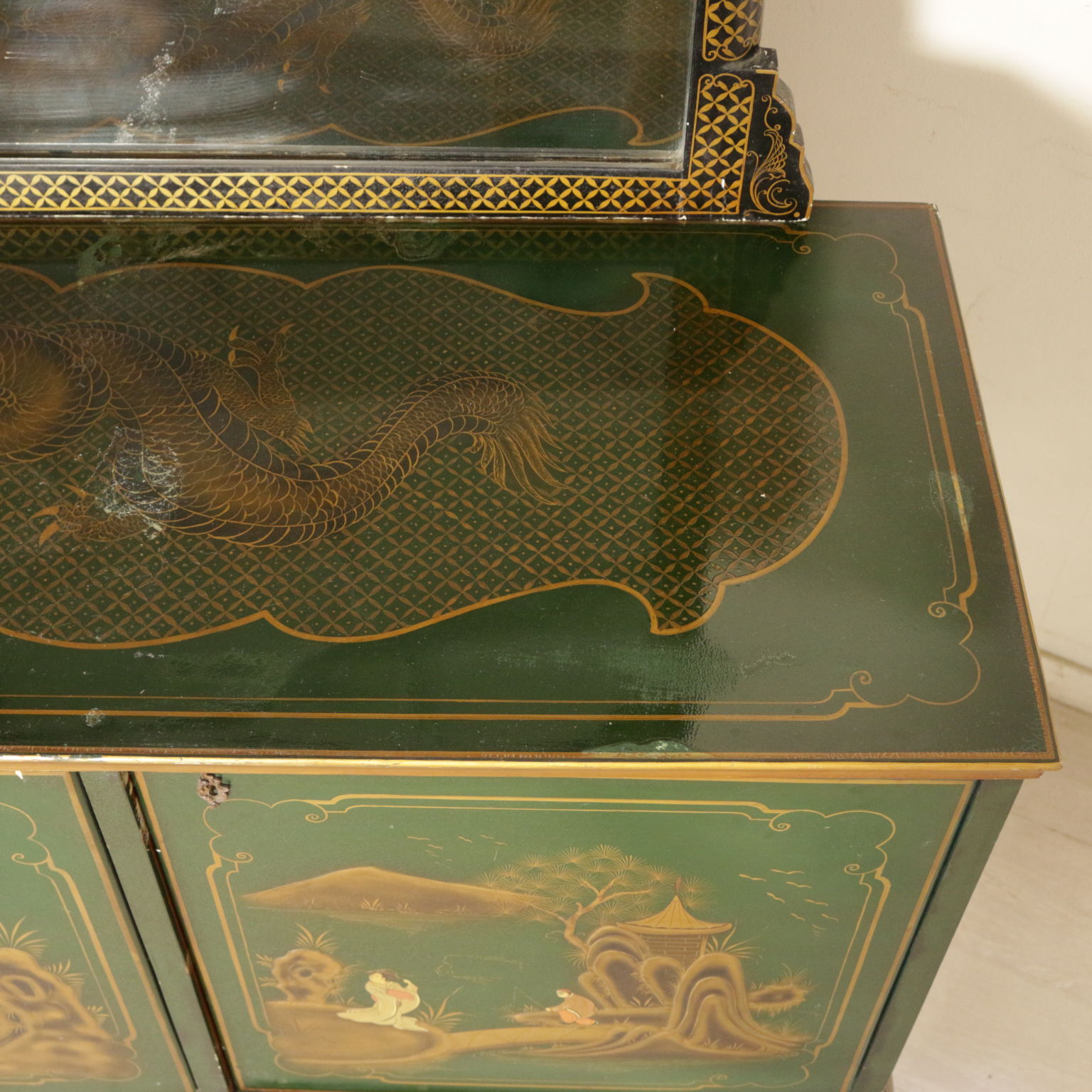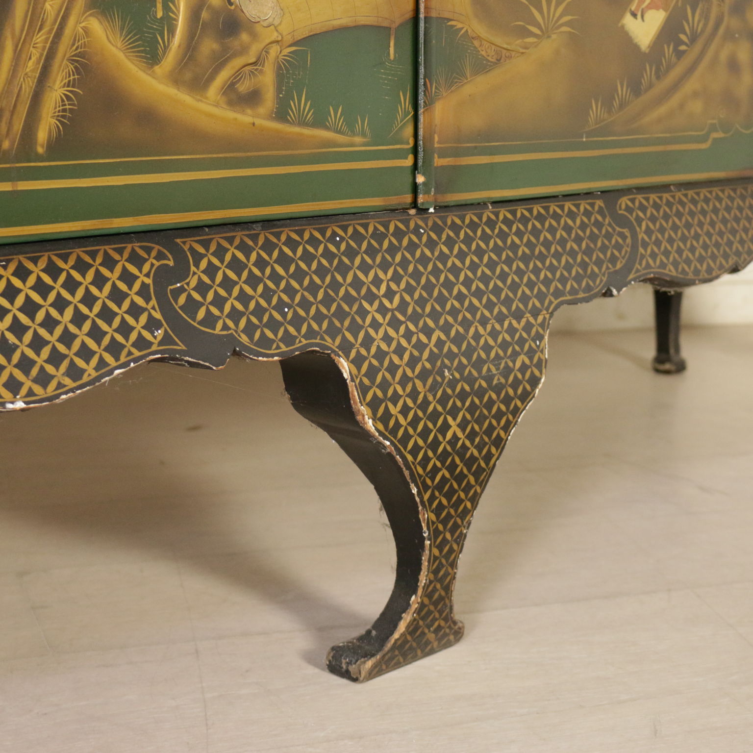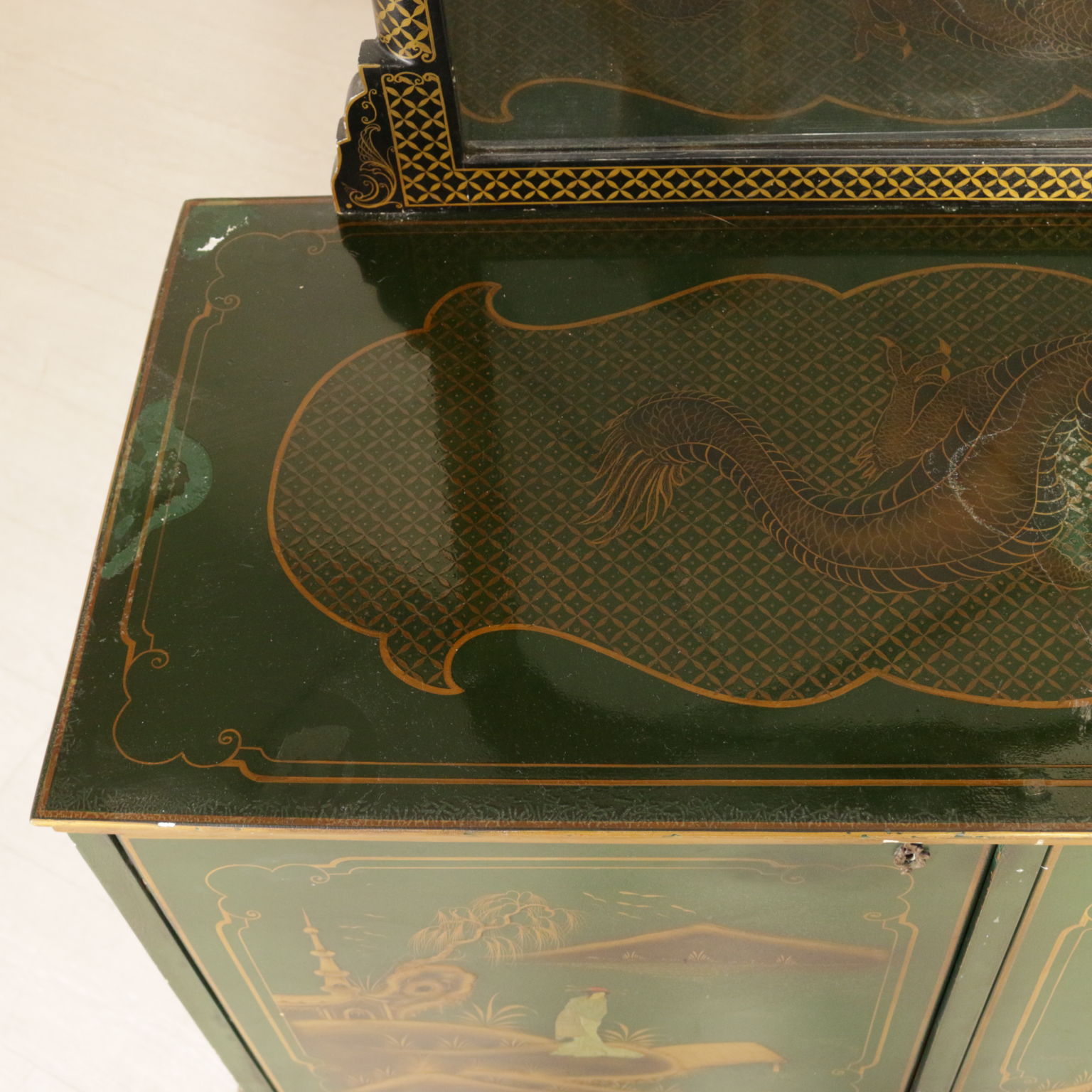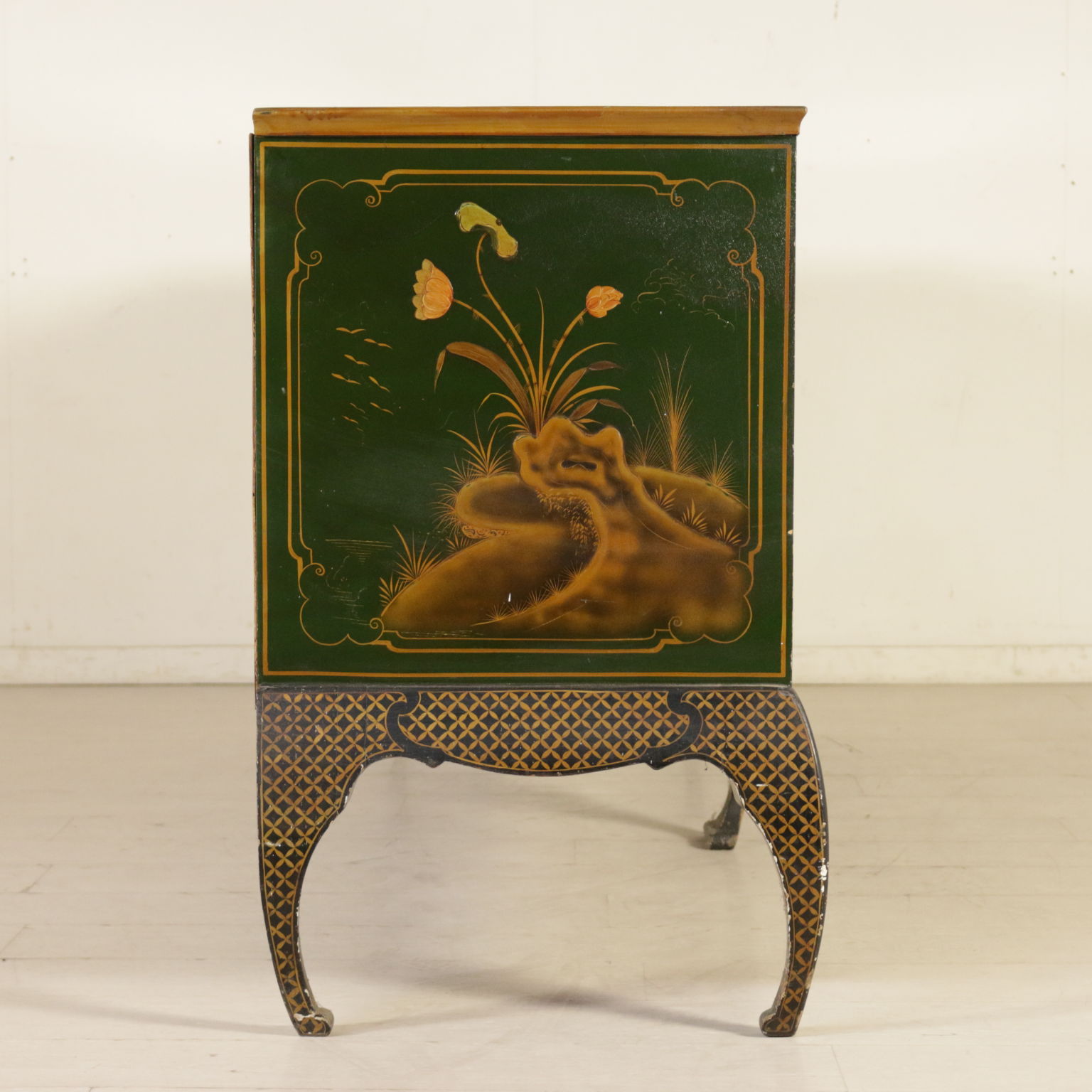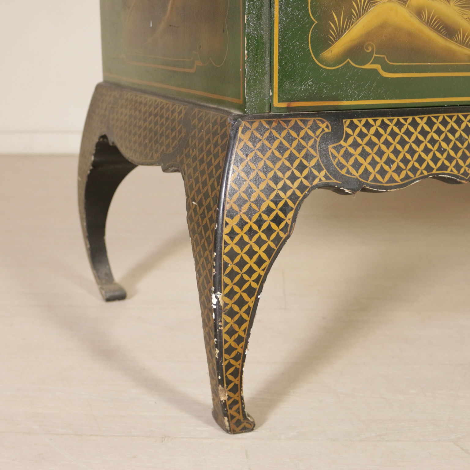Directamente desde el cárter por la línea ondulada; tiene cuatro puertas y un espejo. Lacado y decorado en policromada con motivos de la chinoiserie.