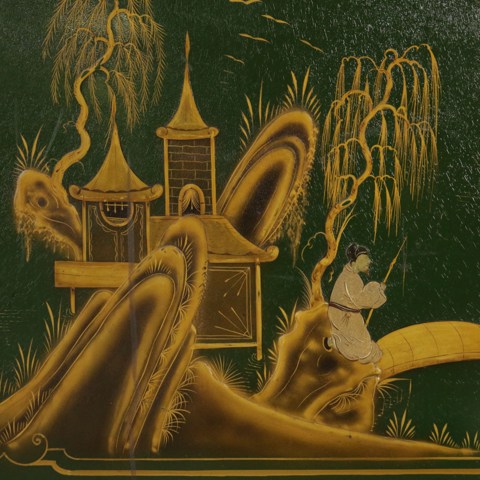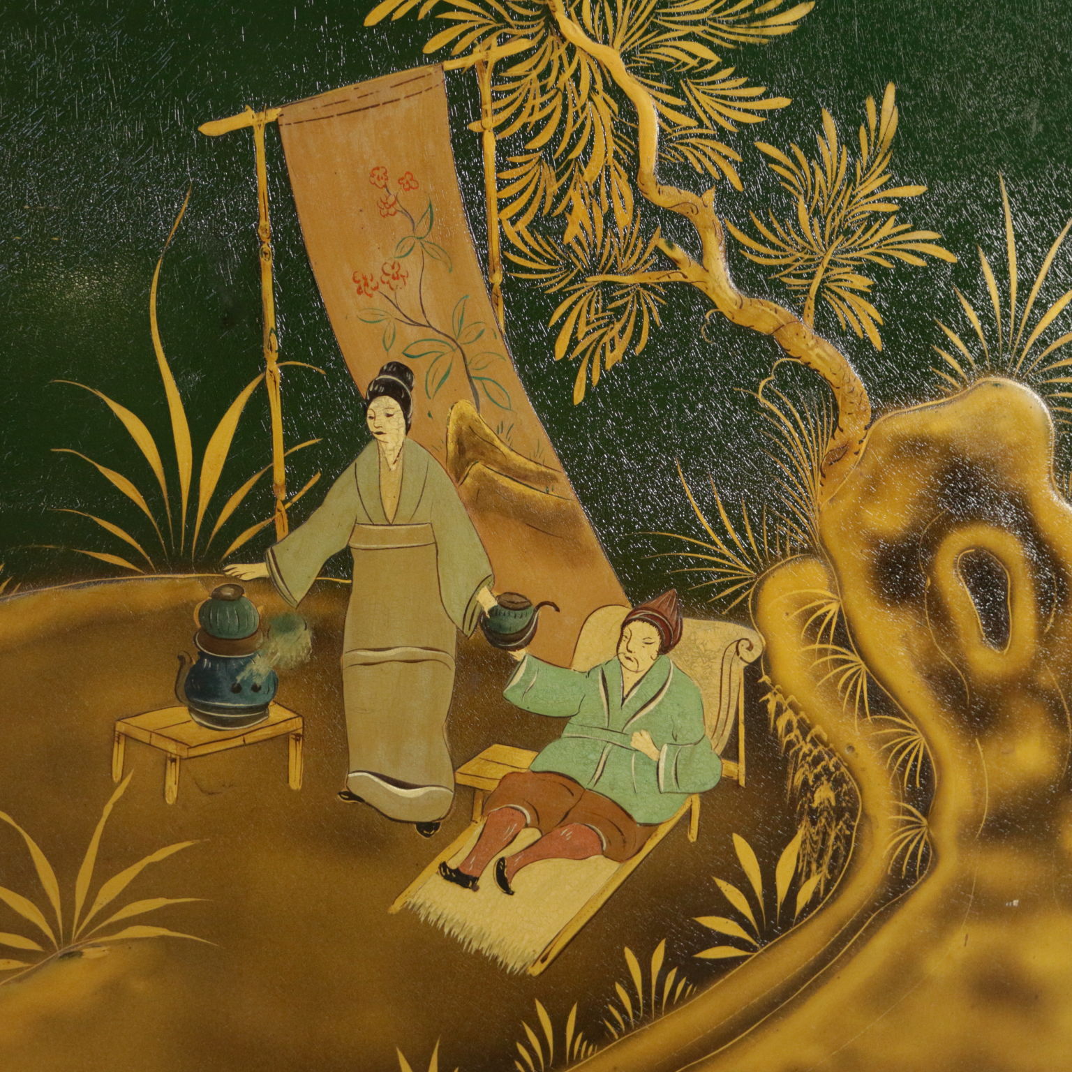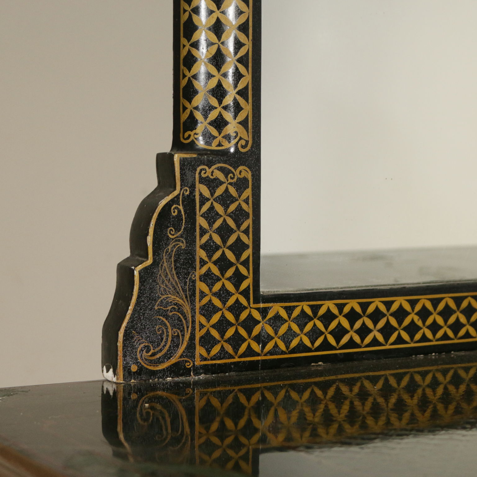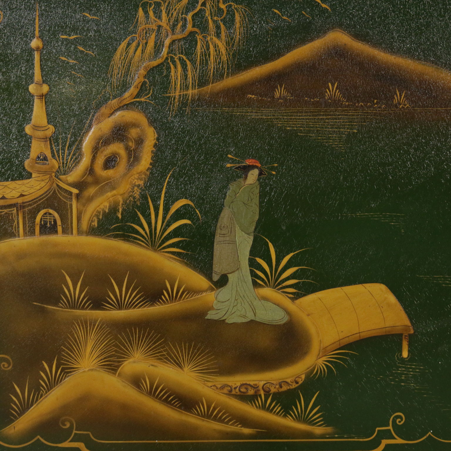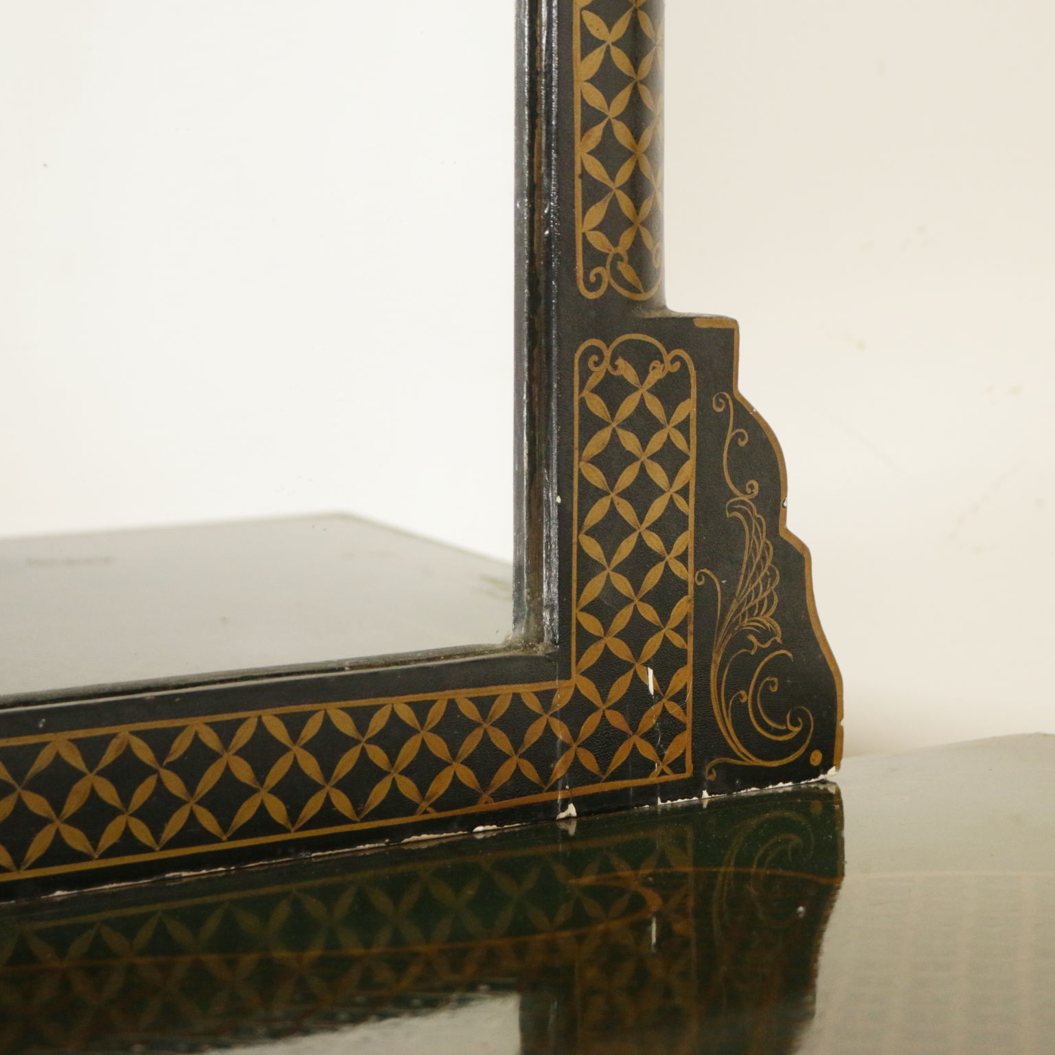 Directamente desde el cárter por la línea ondulada; tiene cuatro puertas y un espejo. Lacado y decorado en policromada con motivos de la chinoiserie.