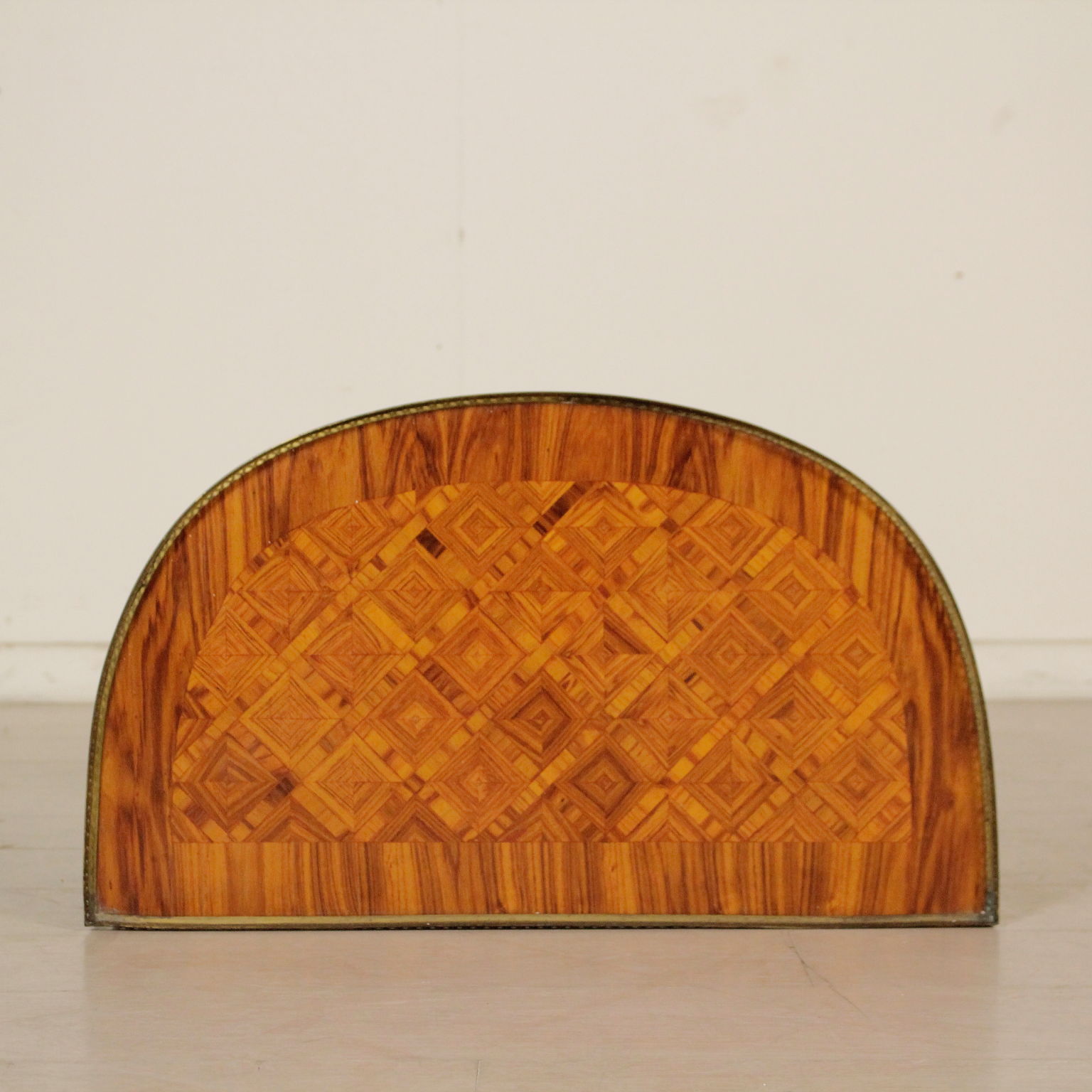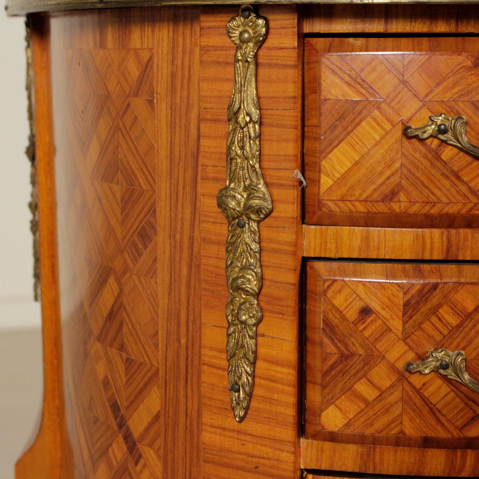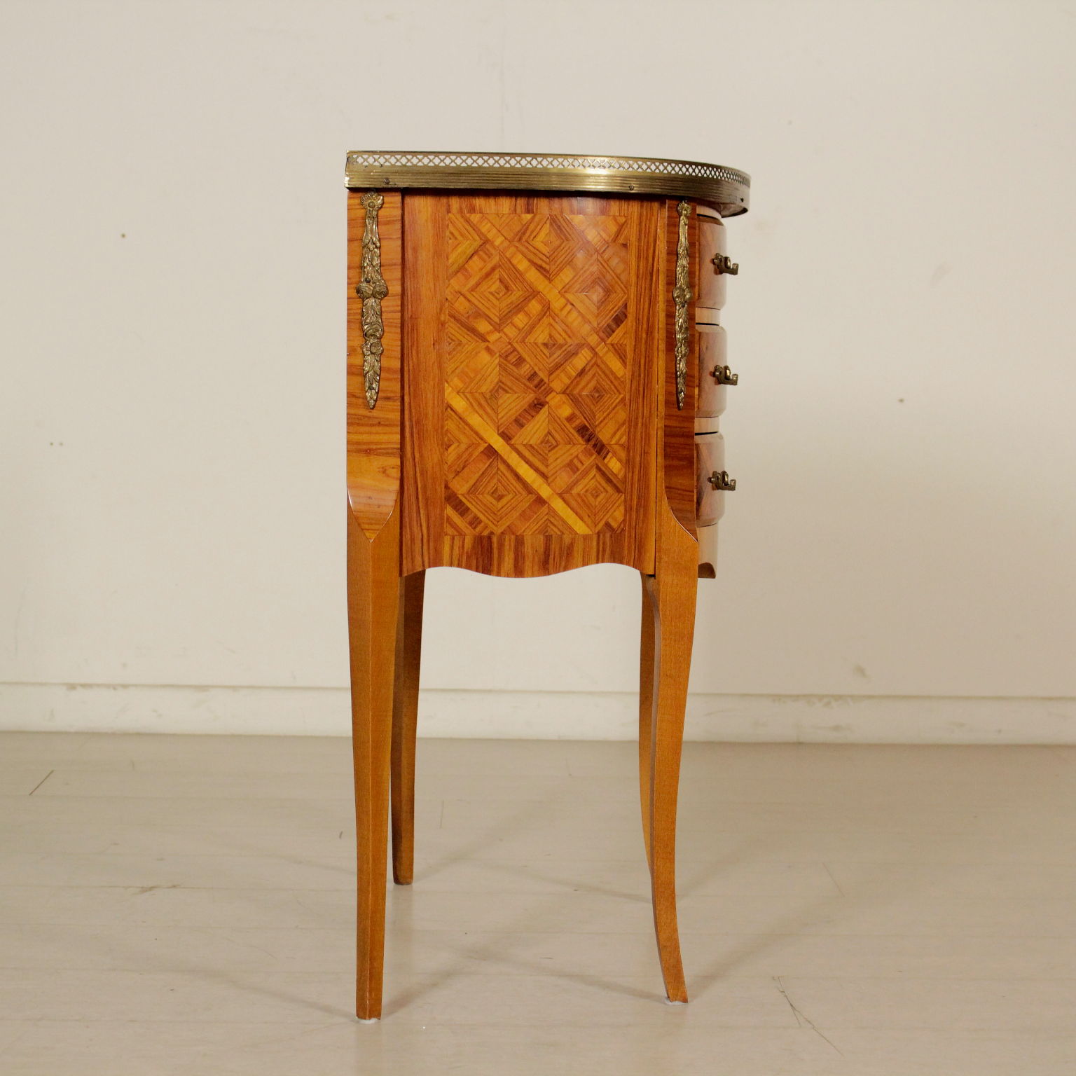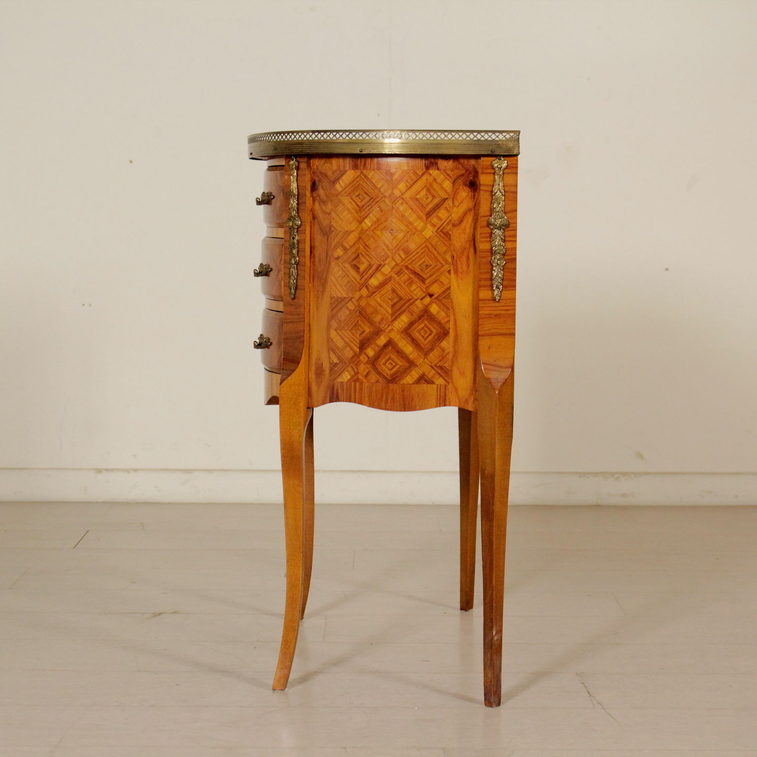 Pequeño demilune tres cajones. Rechapado en marqueterie. Los frisos y los bordes de bronce.