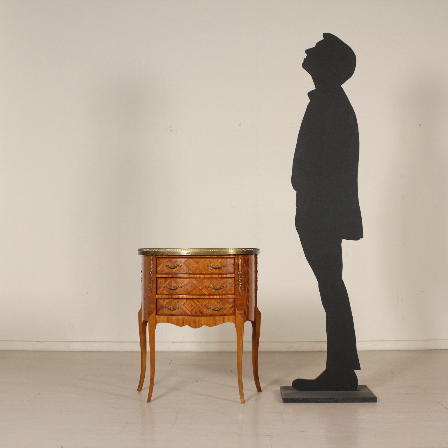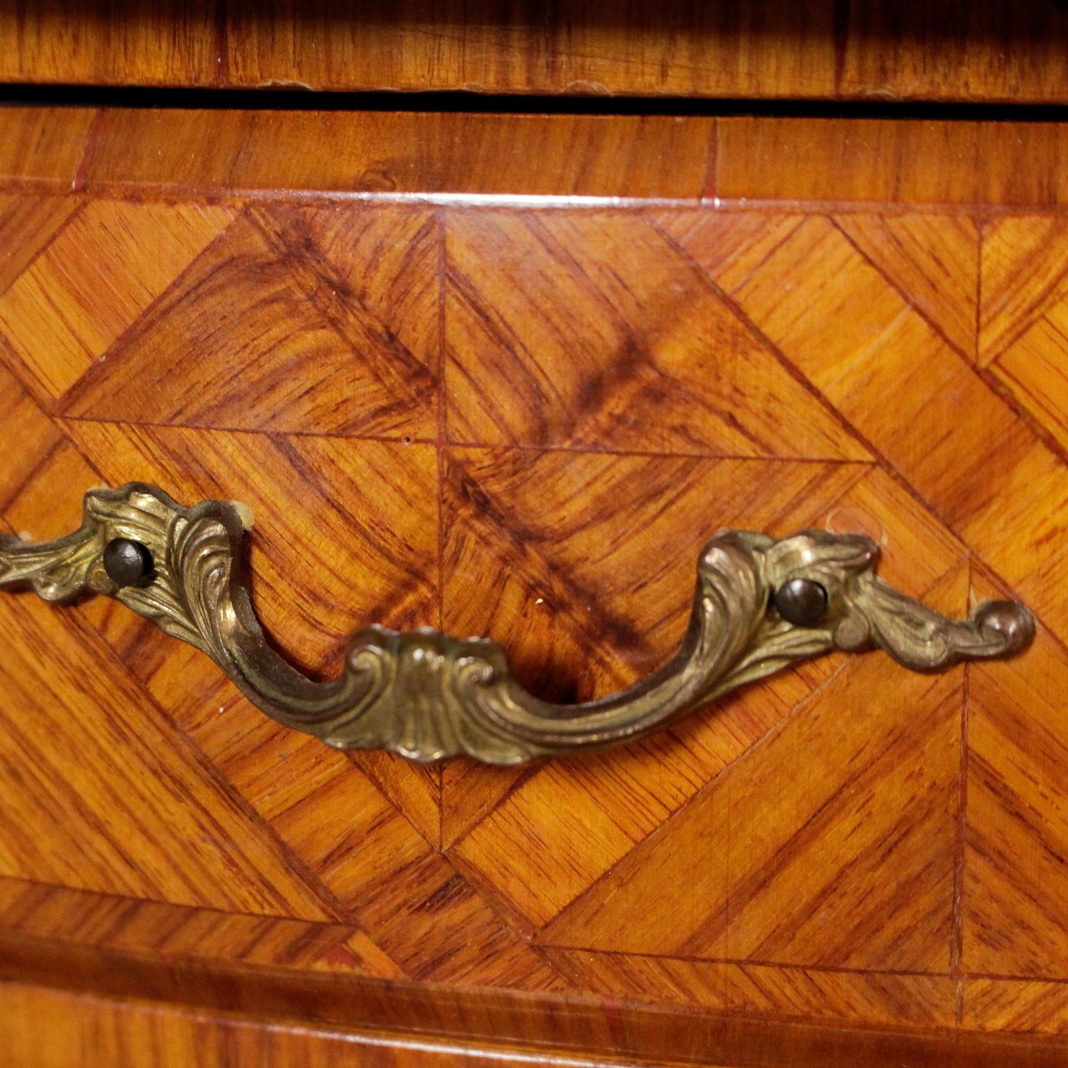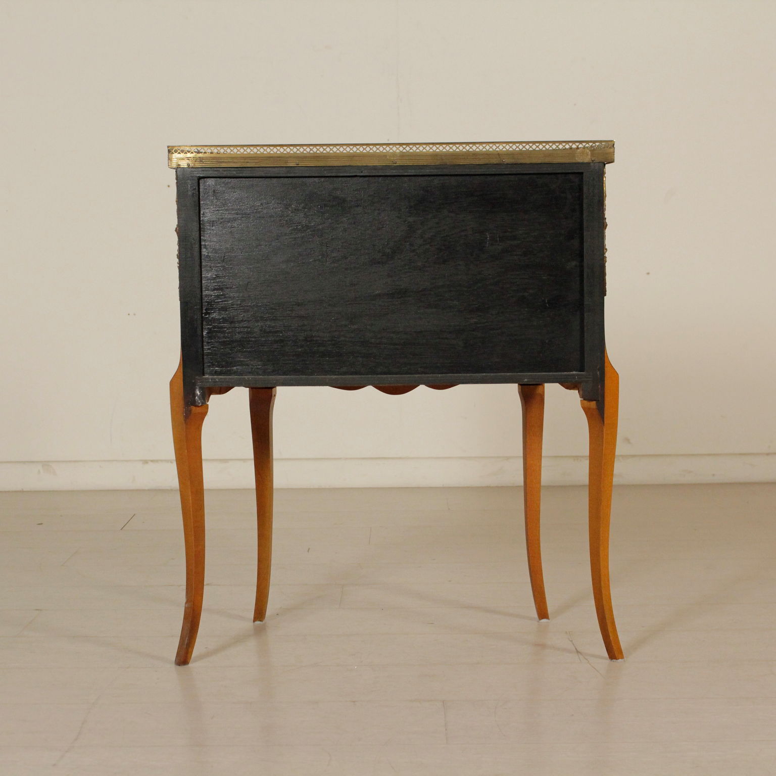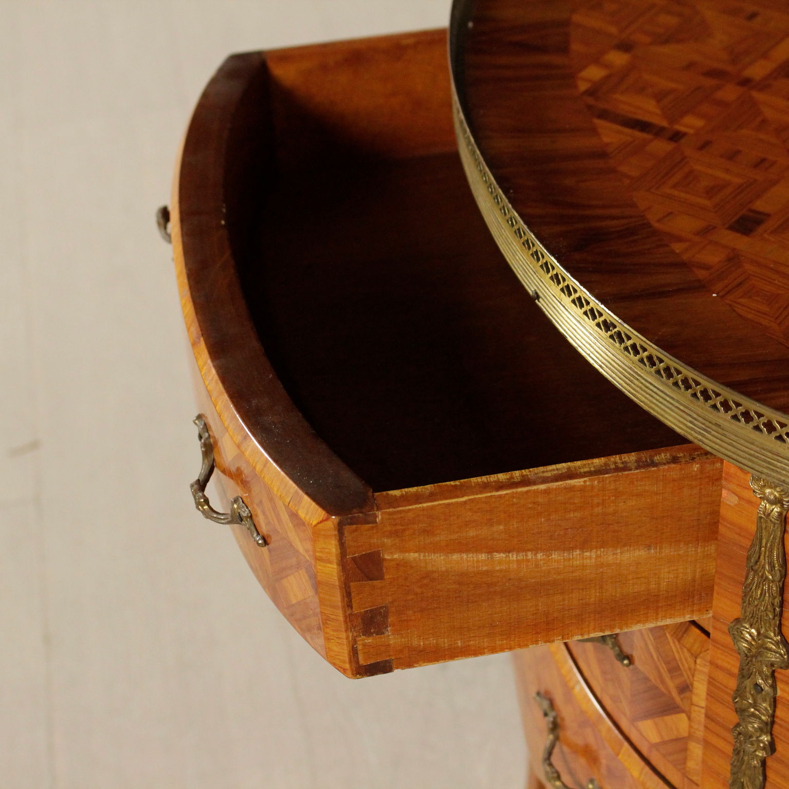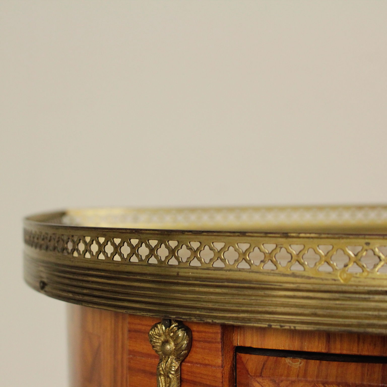 Pequeño demilune tres cajones. Rechapado en marqueterie. Los frisos y los bordes de bronce.