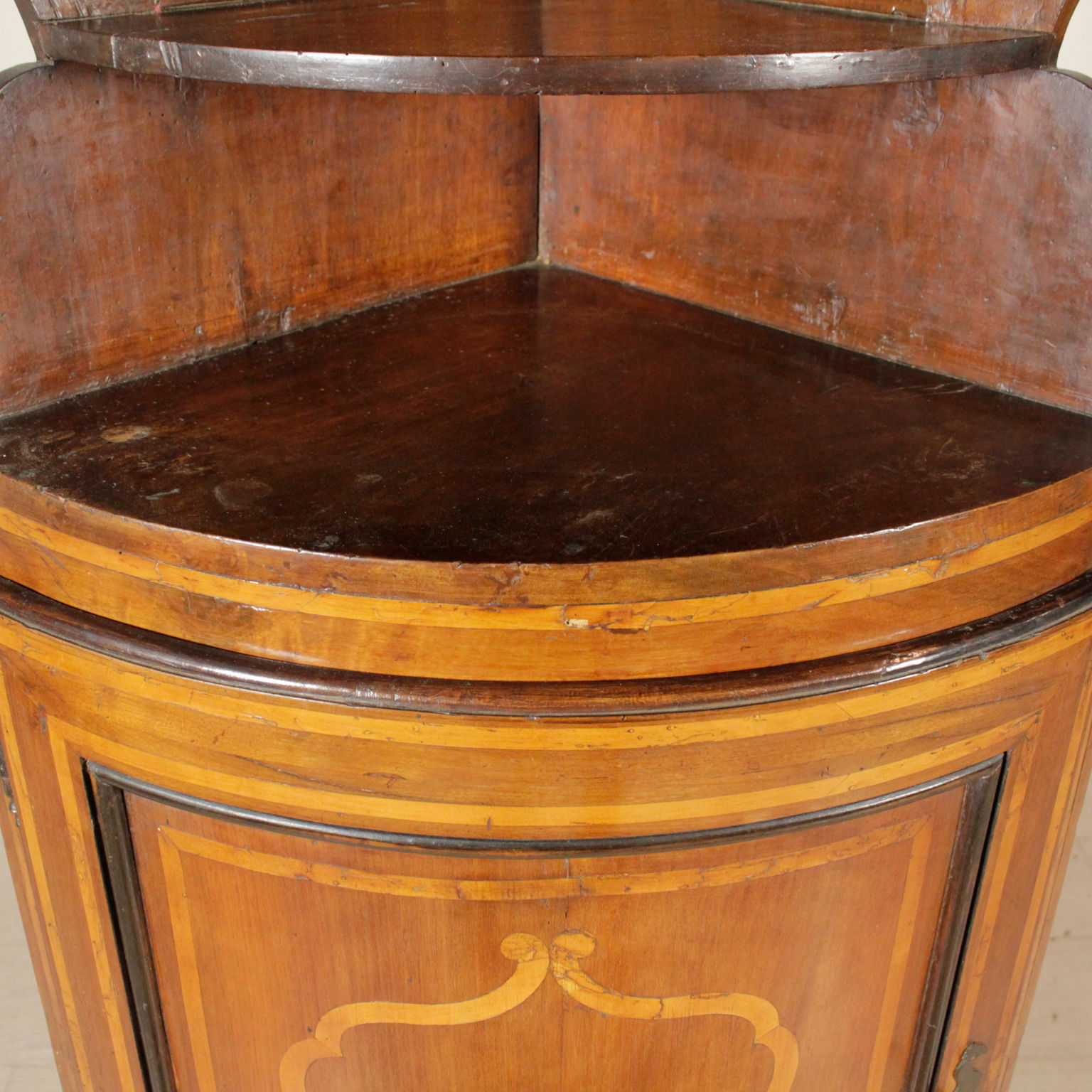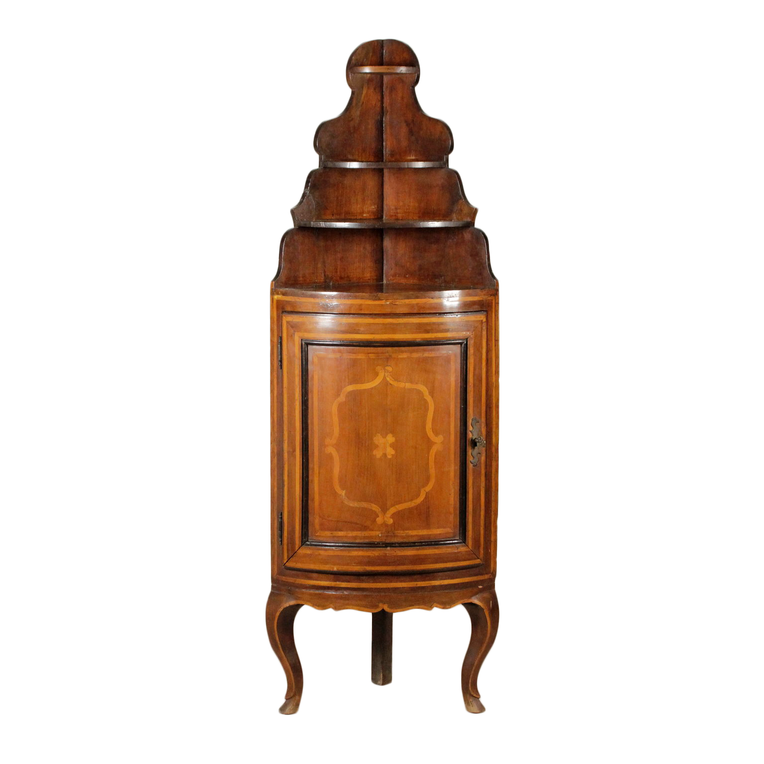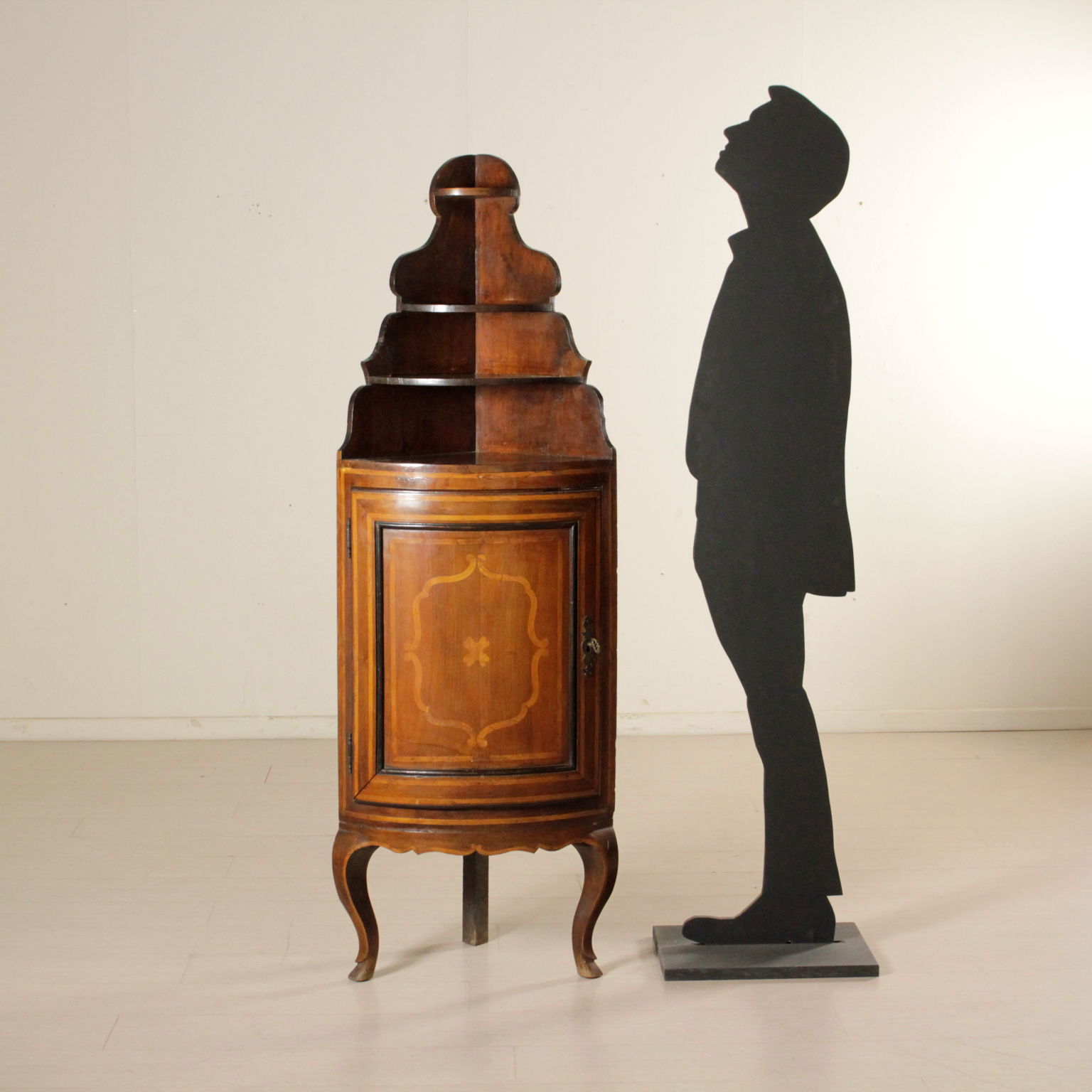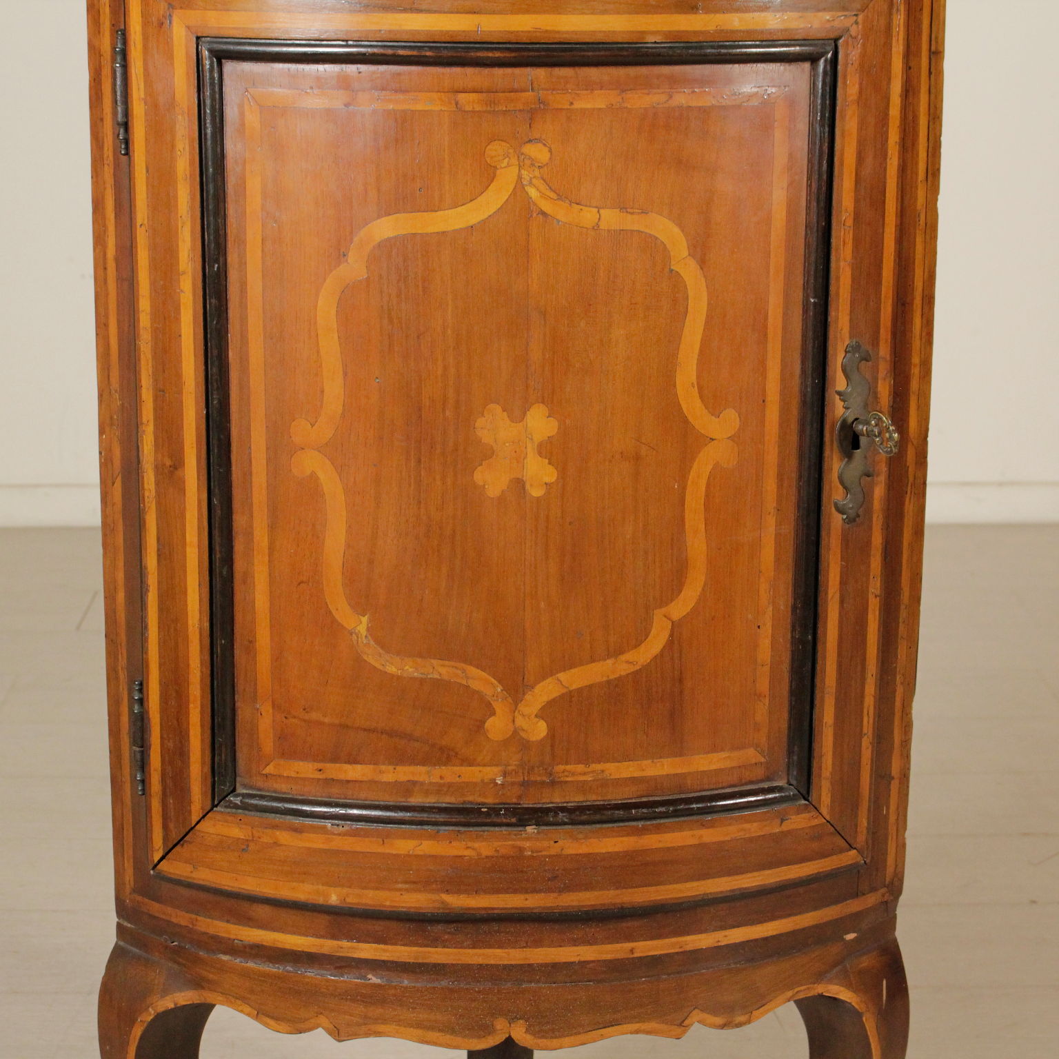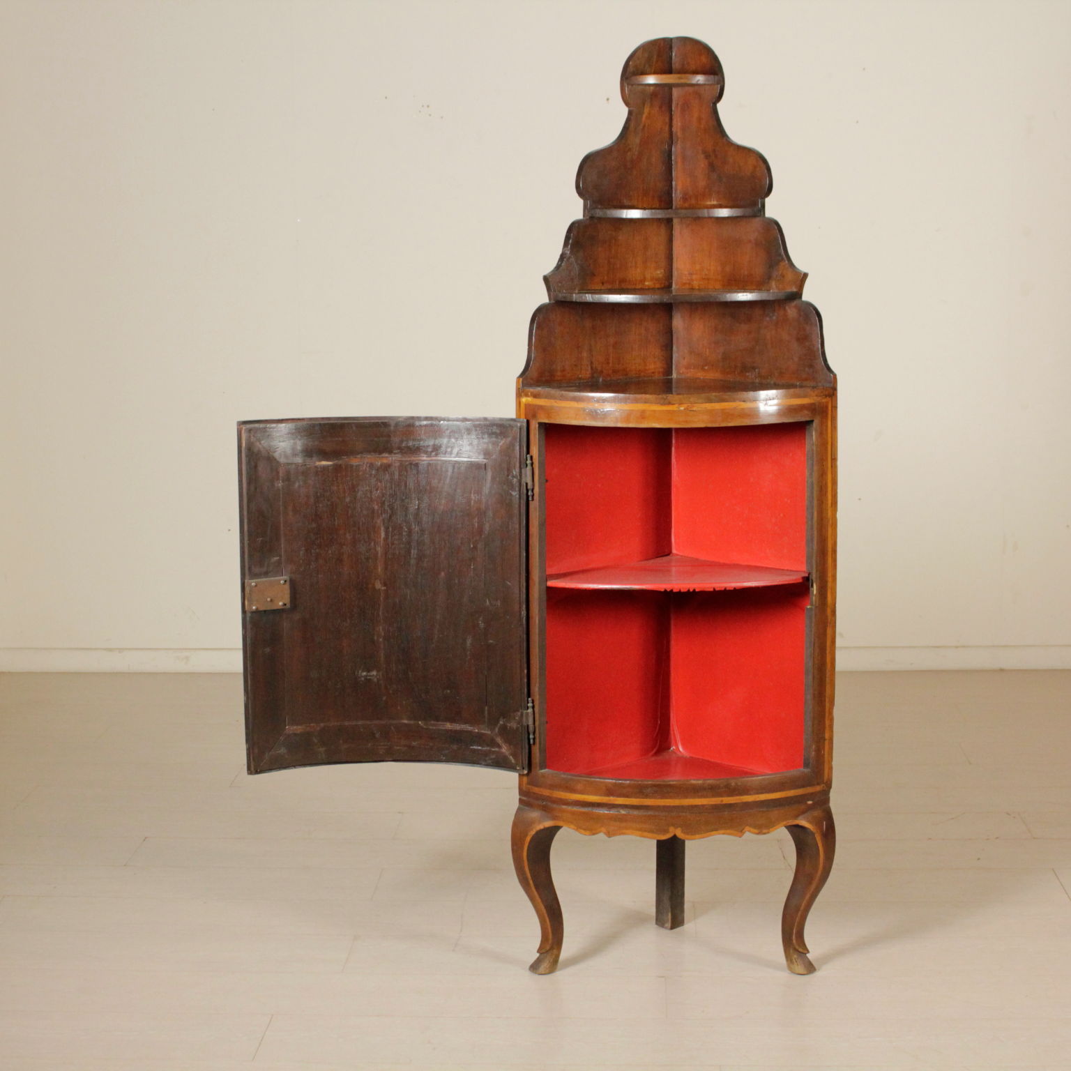 Esquina semi-circular recto piernas mueve. Tiene una puerta con marcos ebanizzate. Copete moldeada estantes. De arce, inlays.