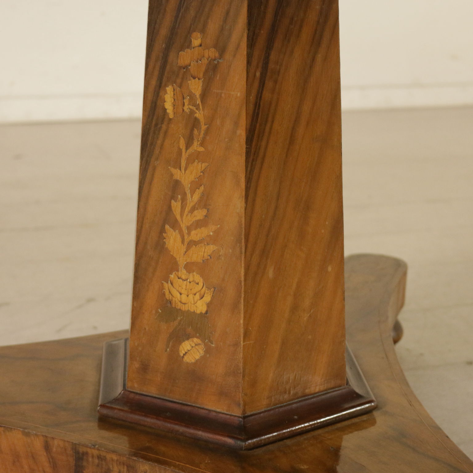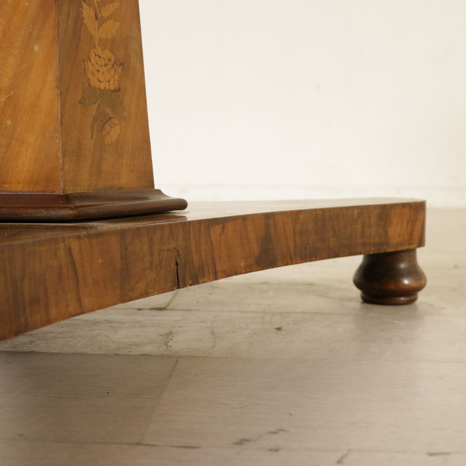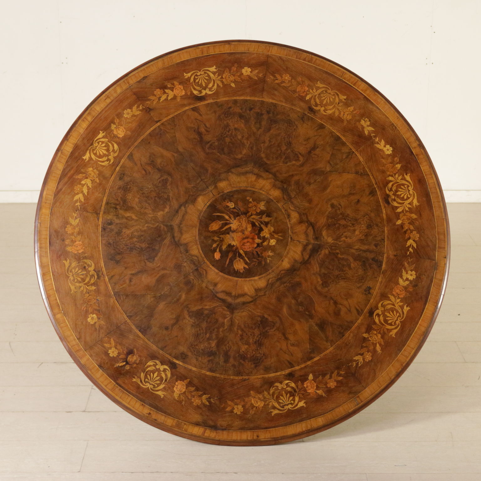 Gran mesa redonda apoyado por balaustre hexagonal, descansando sobre una base tripartita. Round top, ricamente con incrustaciones de diferentes maderas.