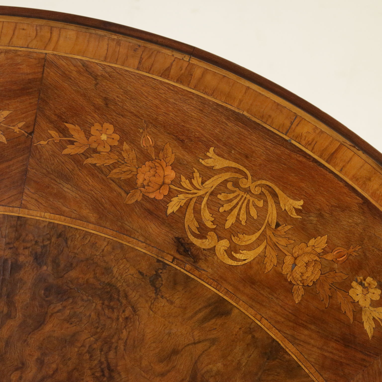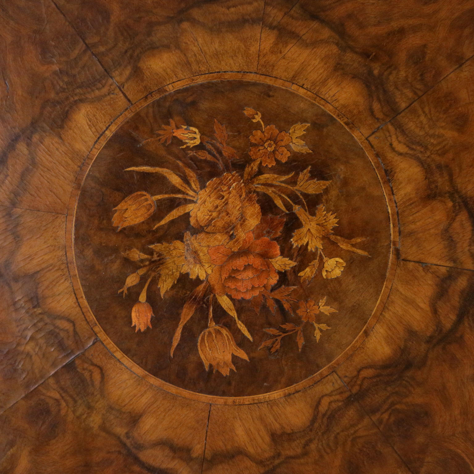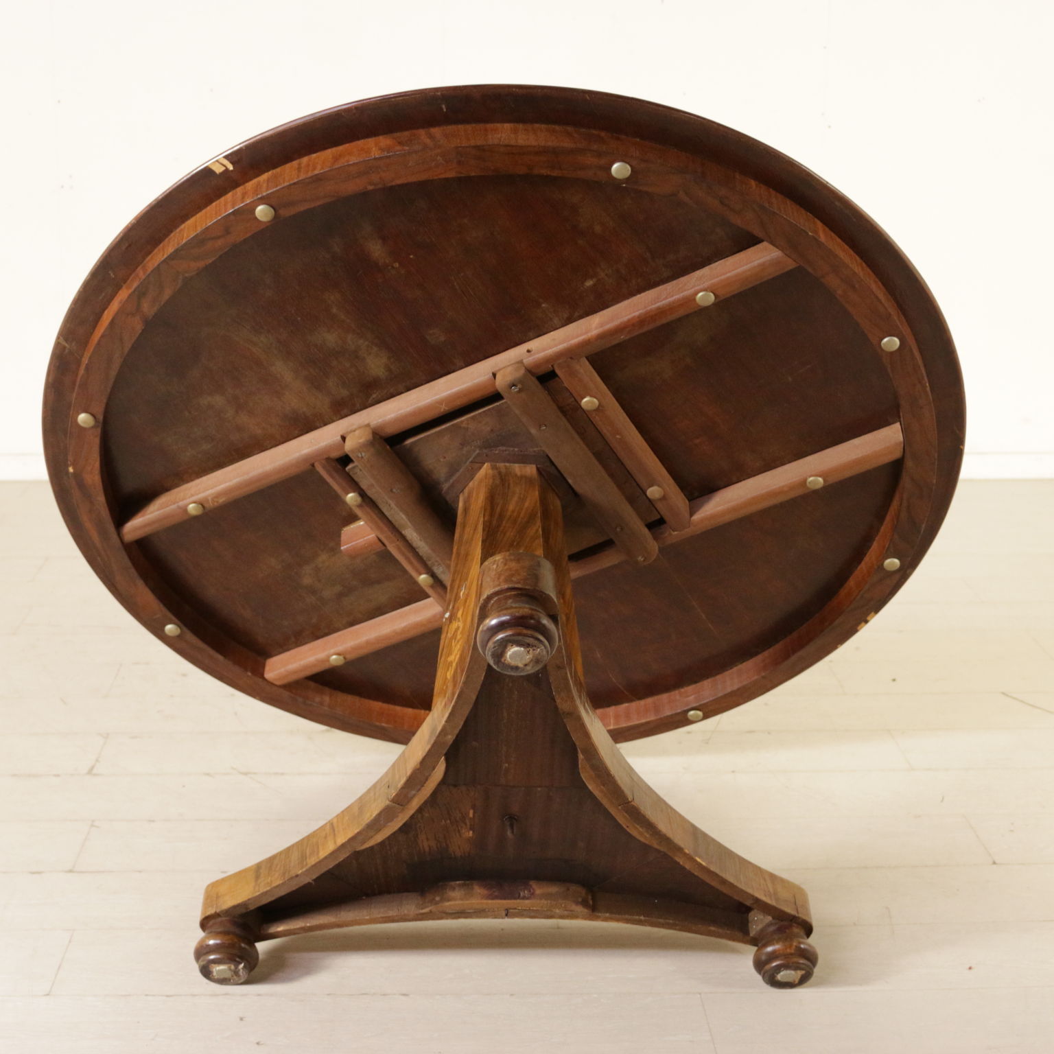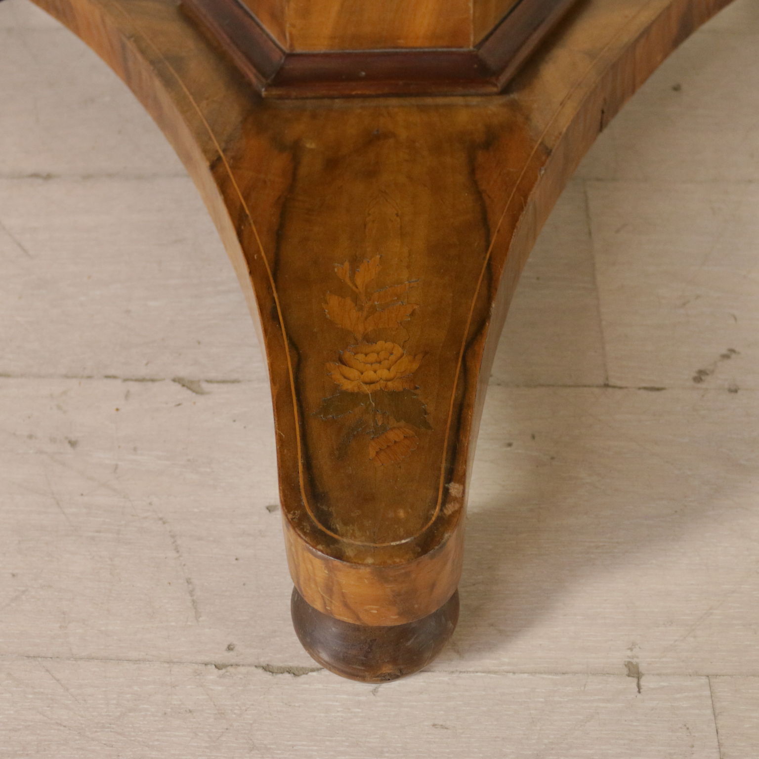 Gran mesa redonda apoyado por balaustre hexagonal, descansando sobre una base tripartita. Round top, ricamente con incrustaciones de diferentes maderas.
