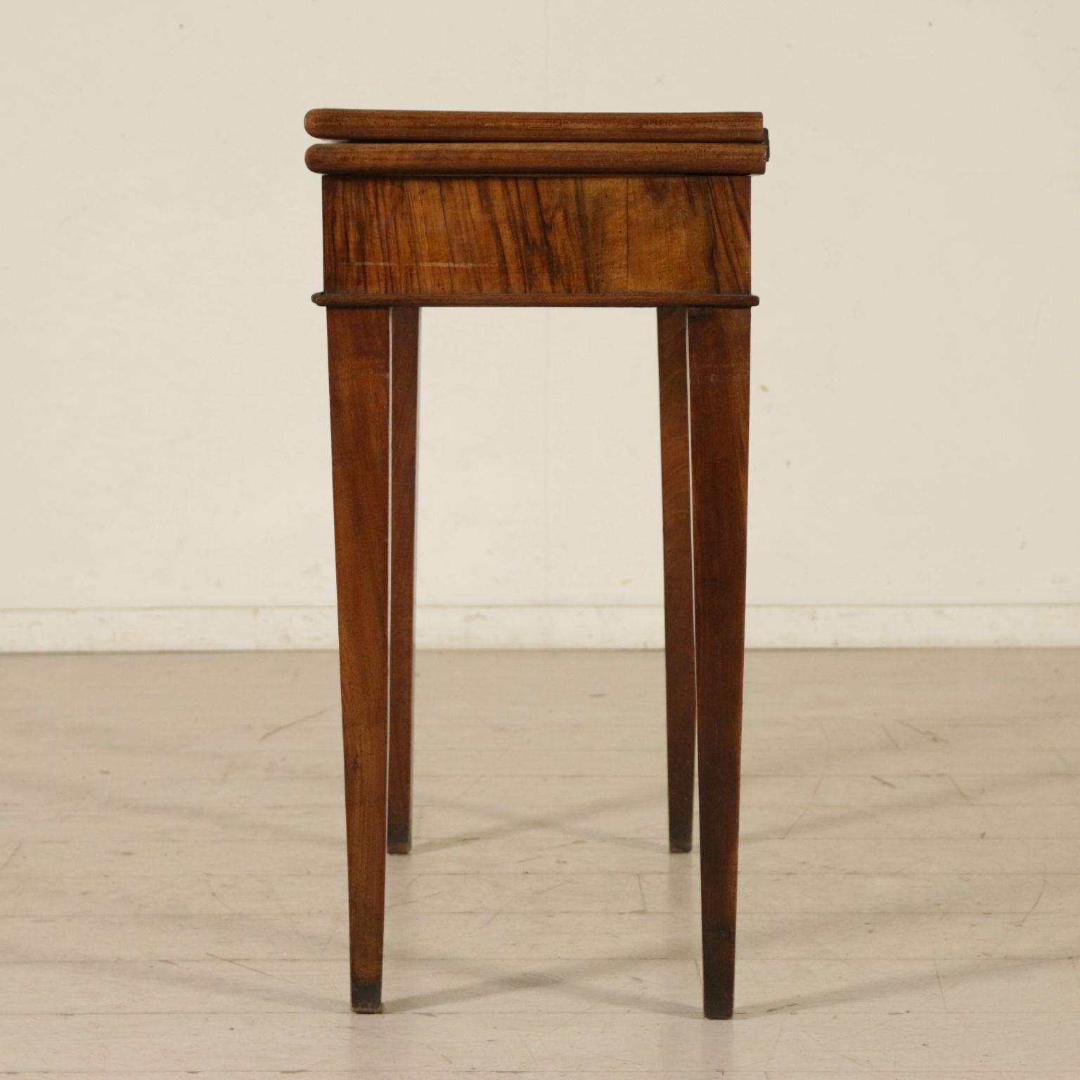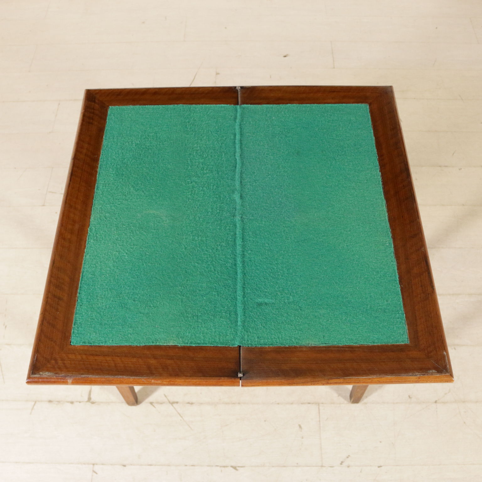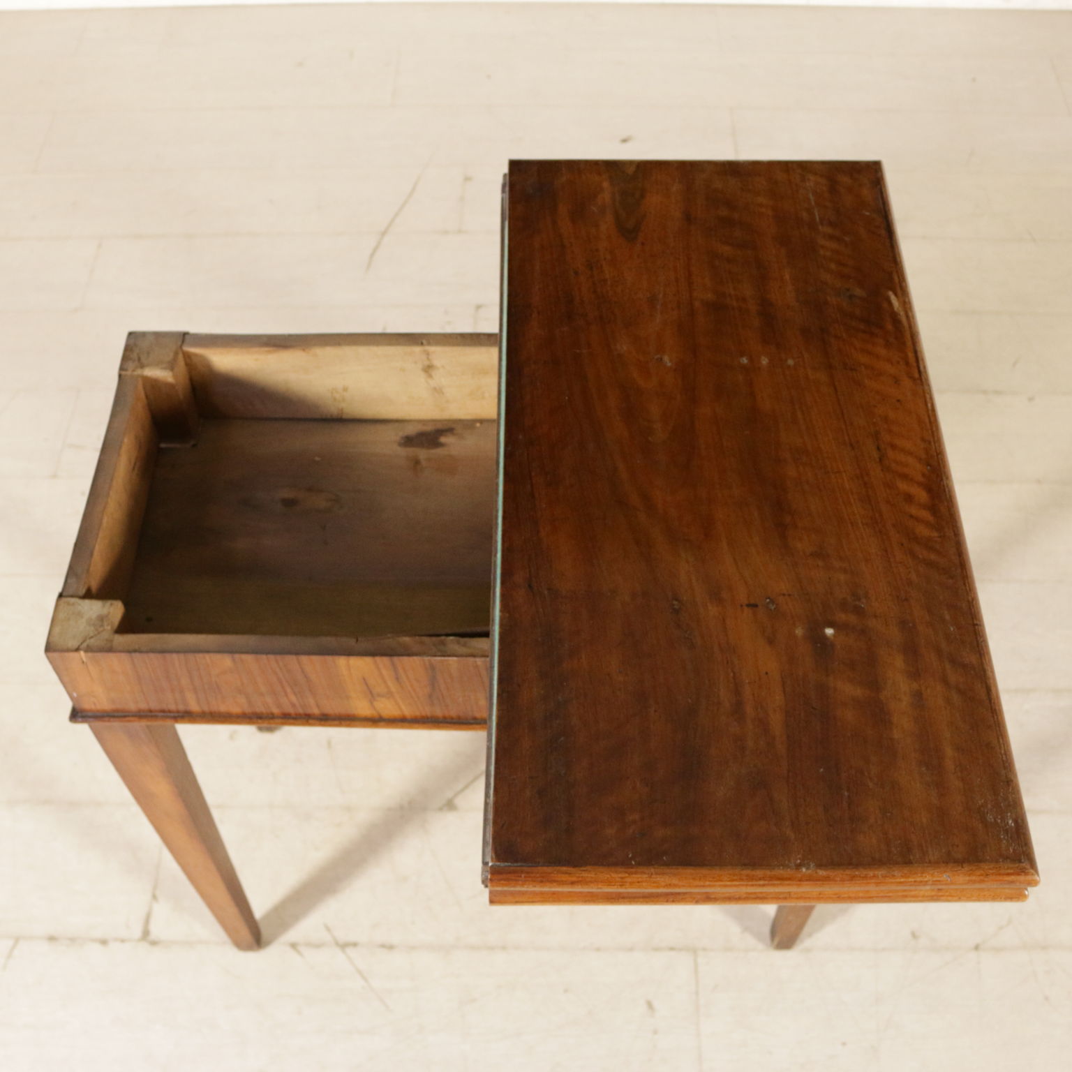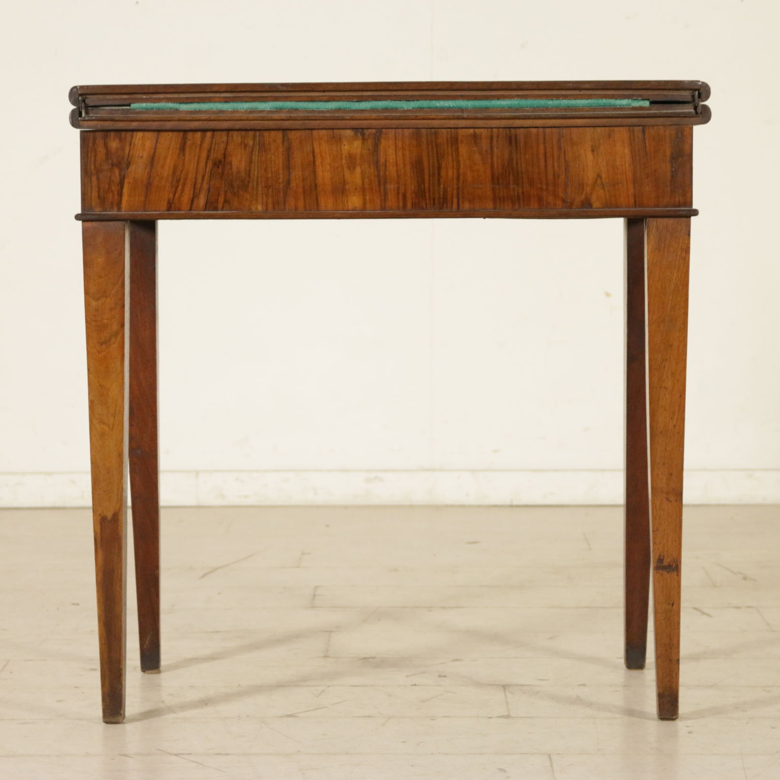 Una mesa de café, sostenido por las piernas con una pirámide truncada de la estructura; se presenta a la banda lastronata pluma de nogal. Plan, de los libros como de la apertura. En el interior de la inserción en el paño verde.