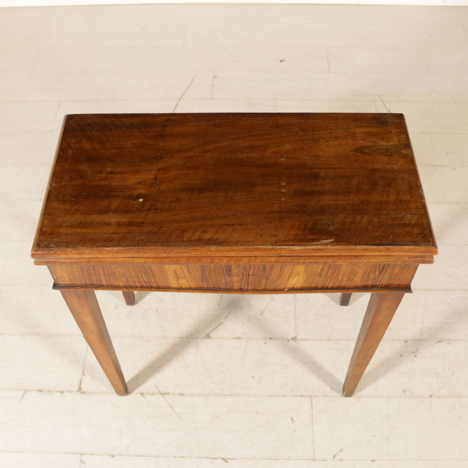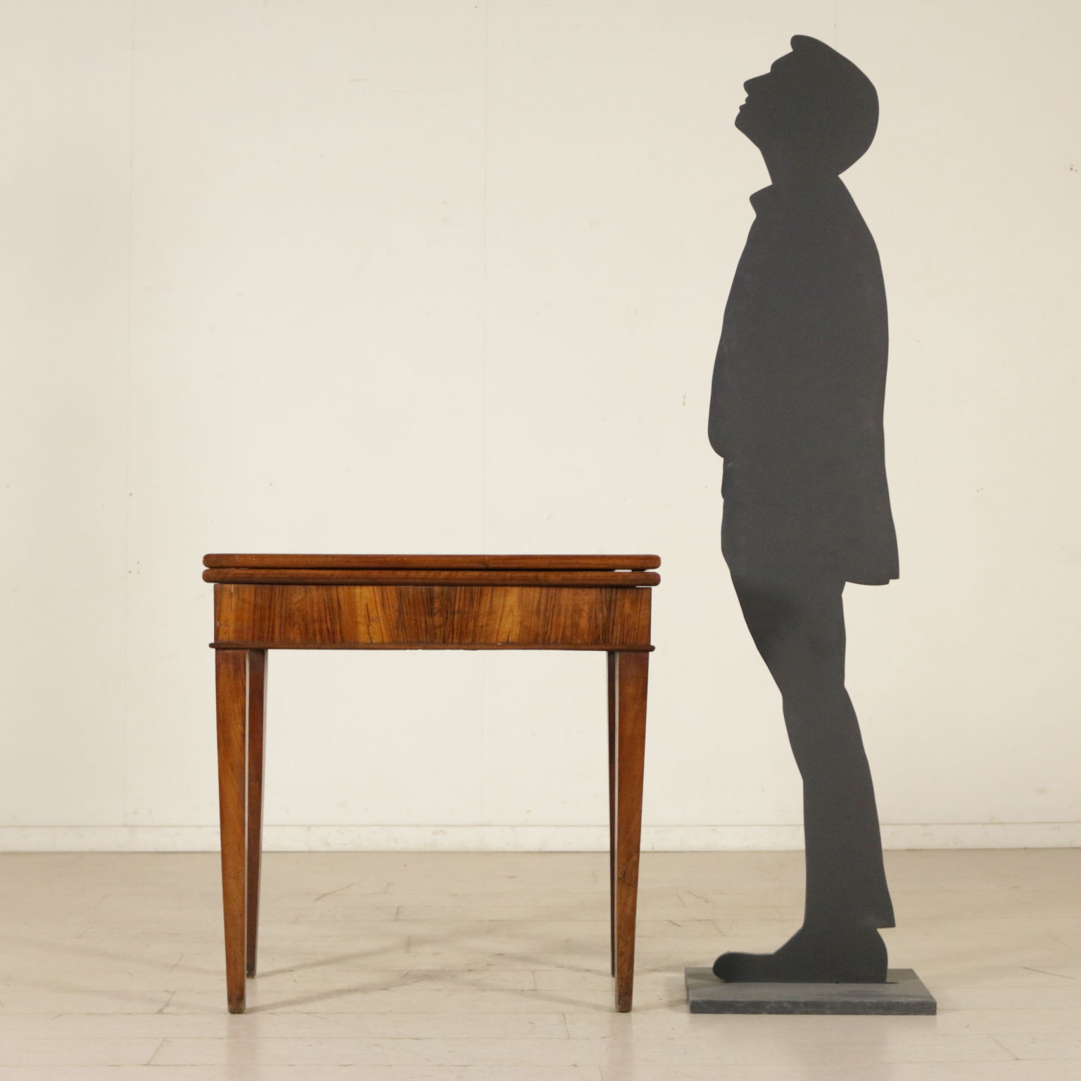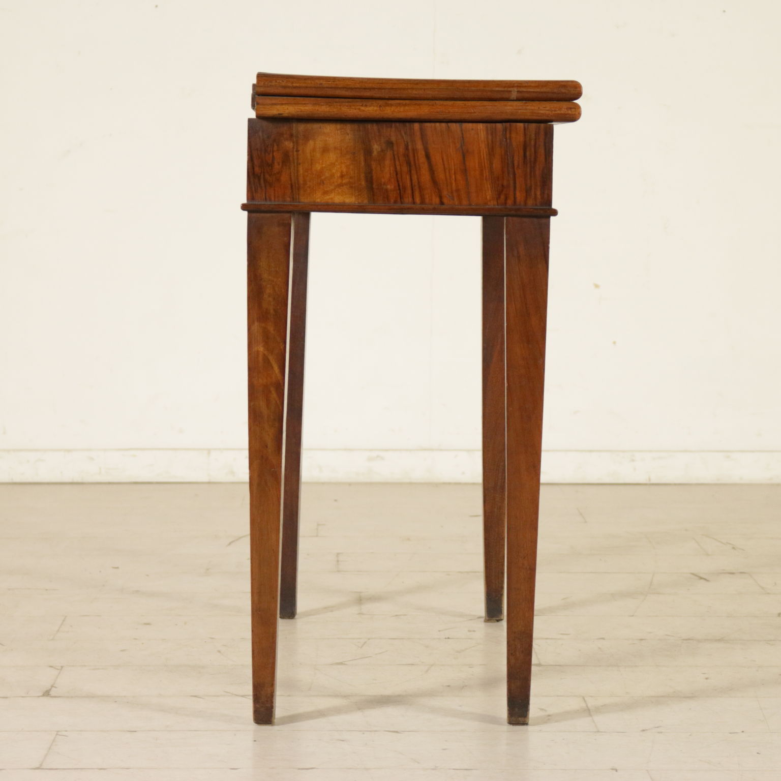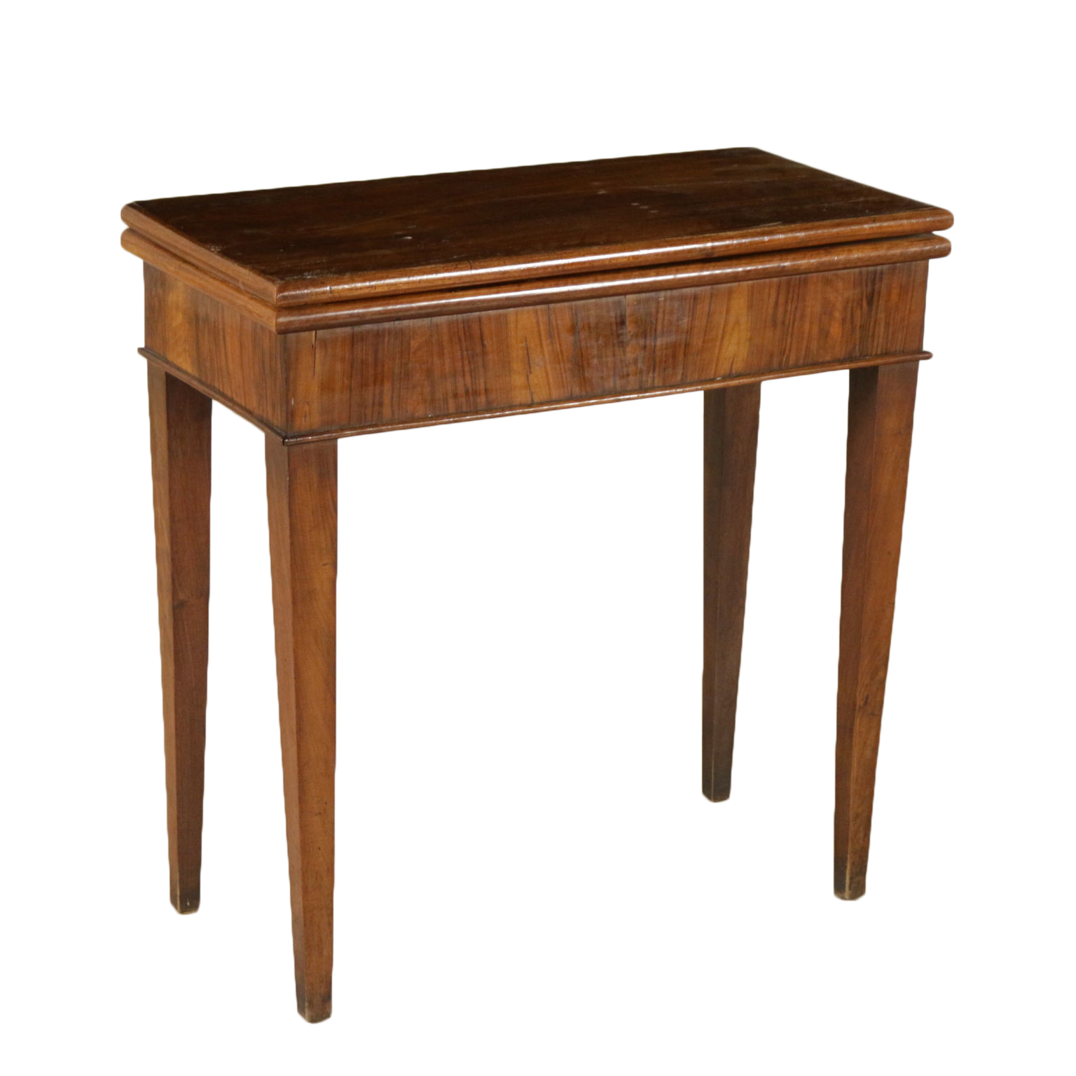 Una mesa de café, sostenido por las piernas con una pirámide truncada de la estructura; se presenta a la banda lastronata pluma de nogal. Plan, de los libros como de la apertura. En el interior de la inserción en el paño verde.