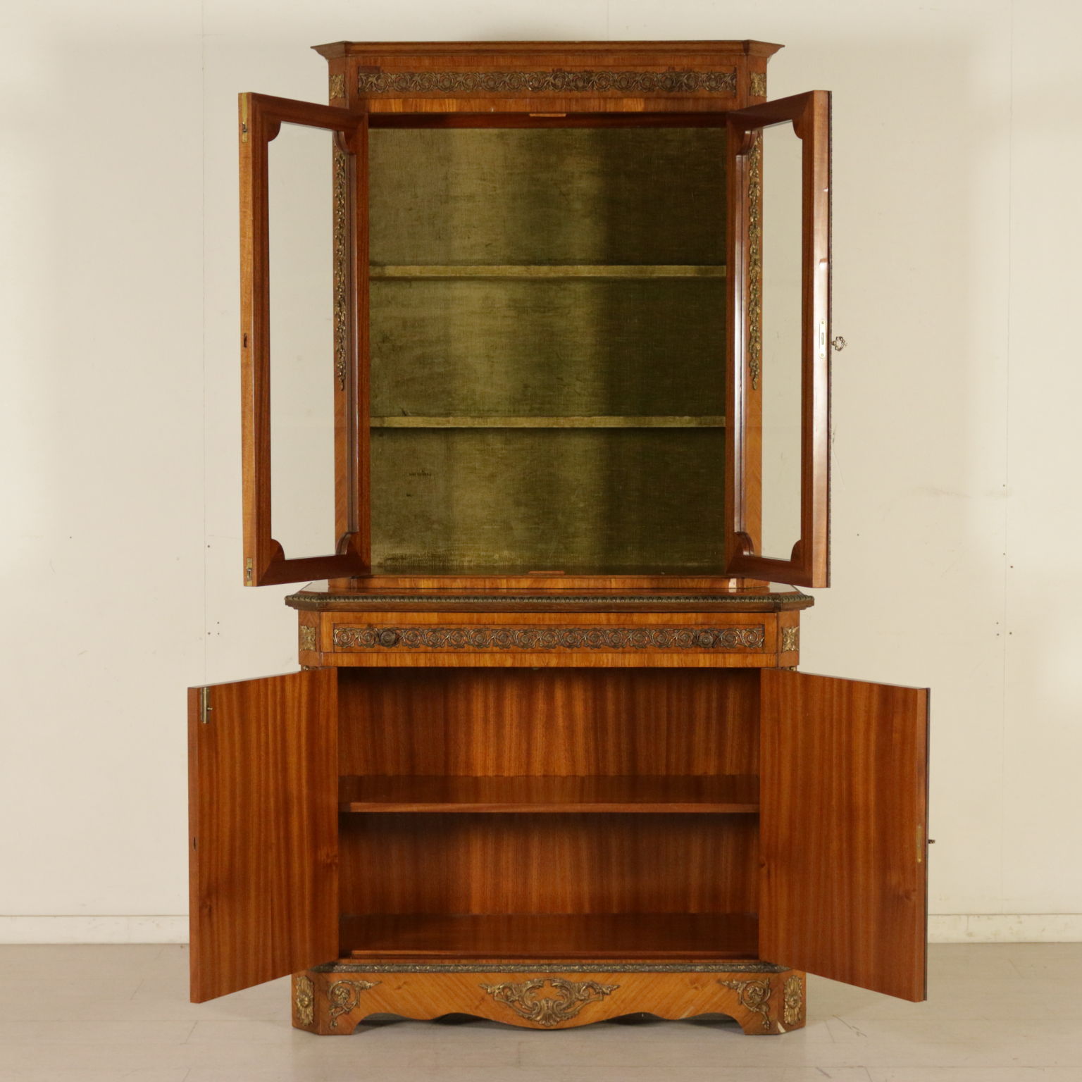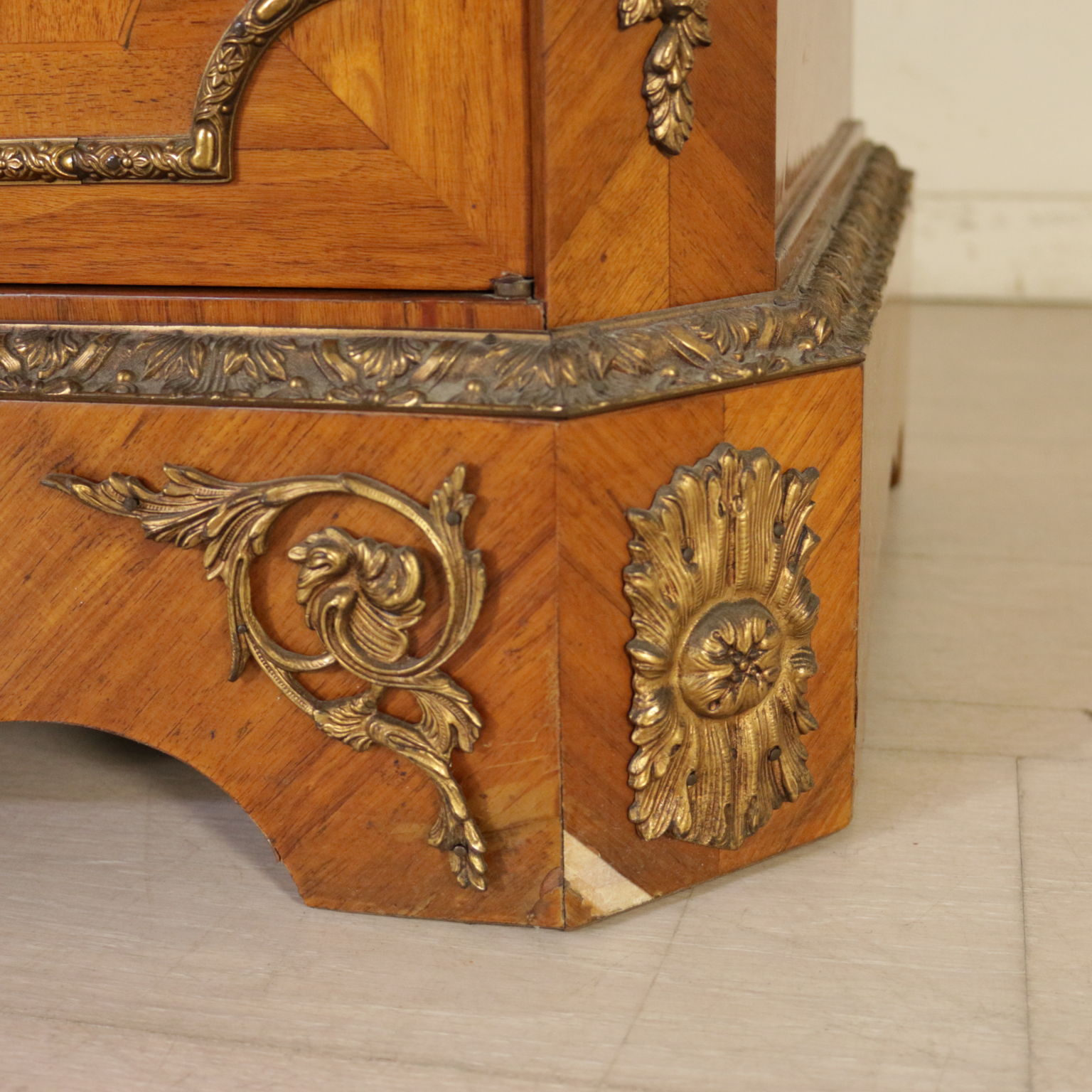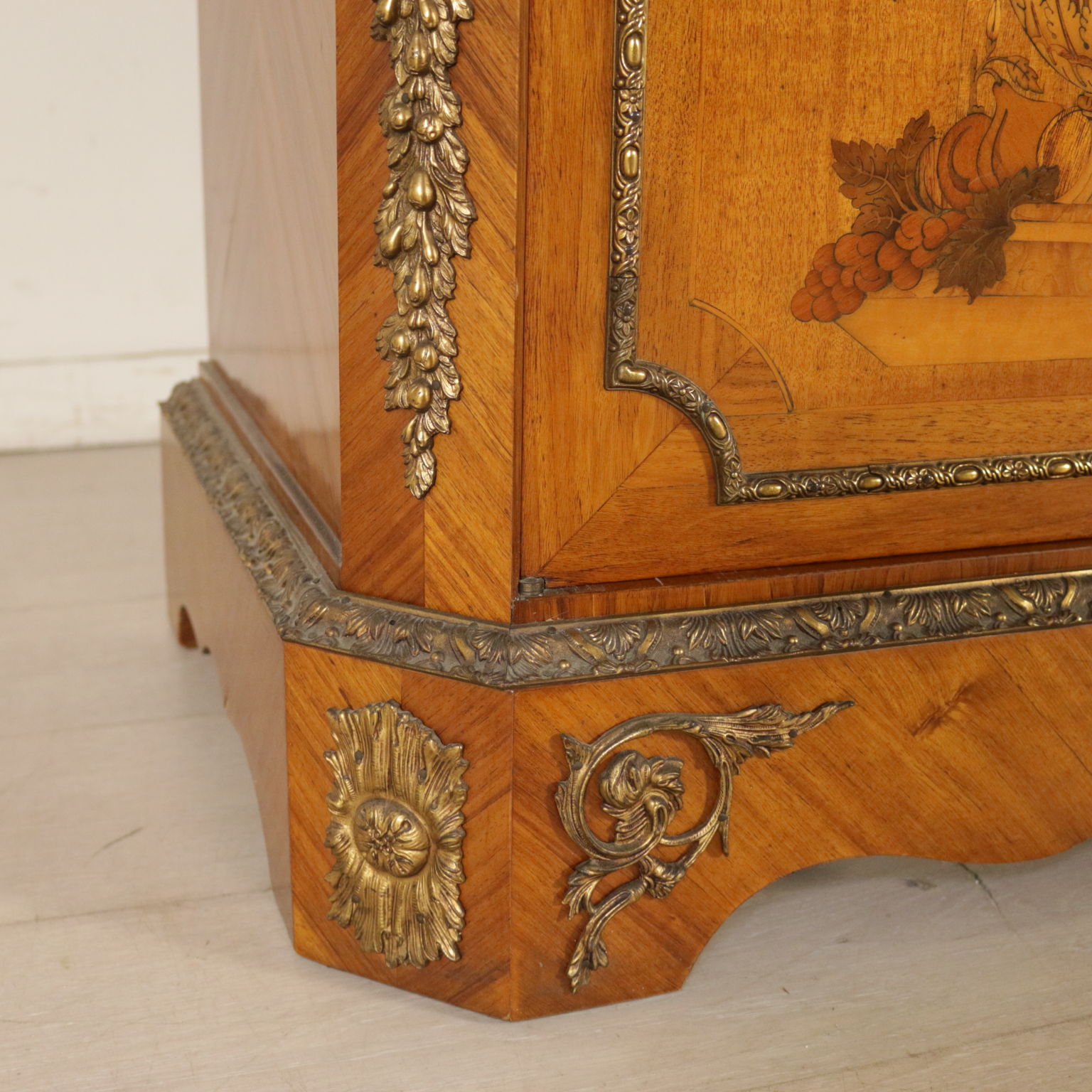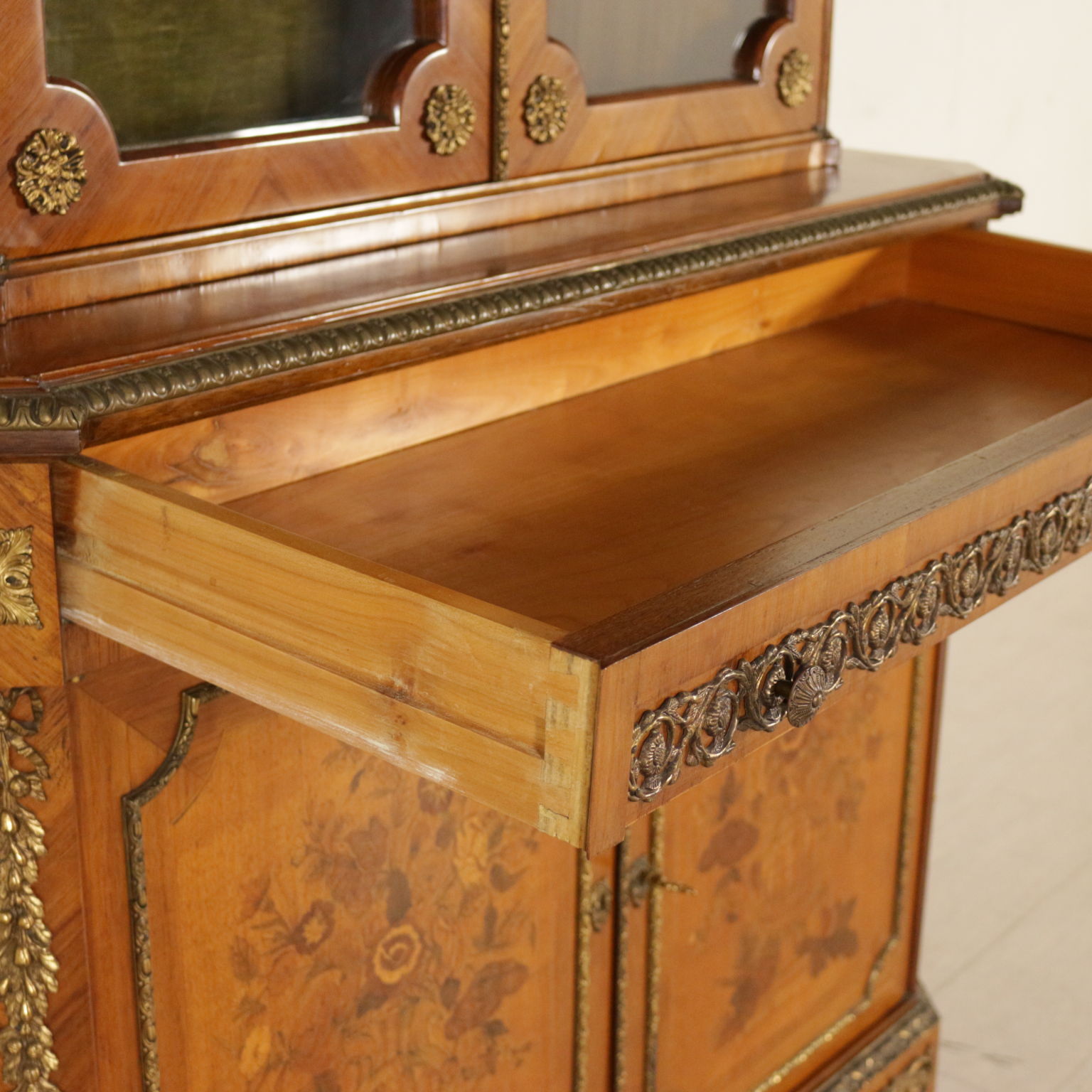 Aparador con dos puertas y un cajón, se ha planteado con dos puertas con vidrio. Los paneles de las puertas ricamente con incrustaciones. Cornisas y frisos de bronce.