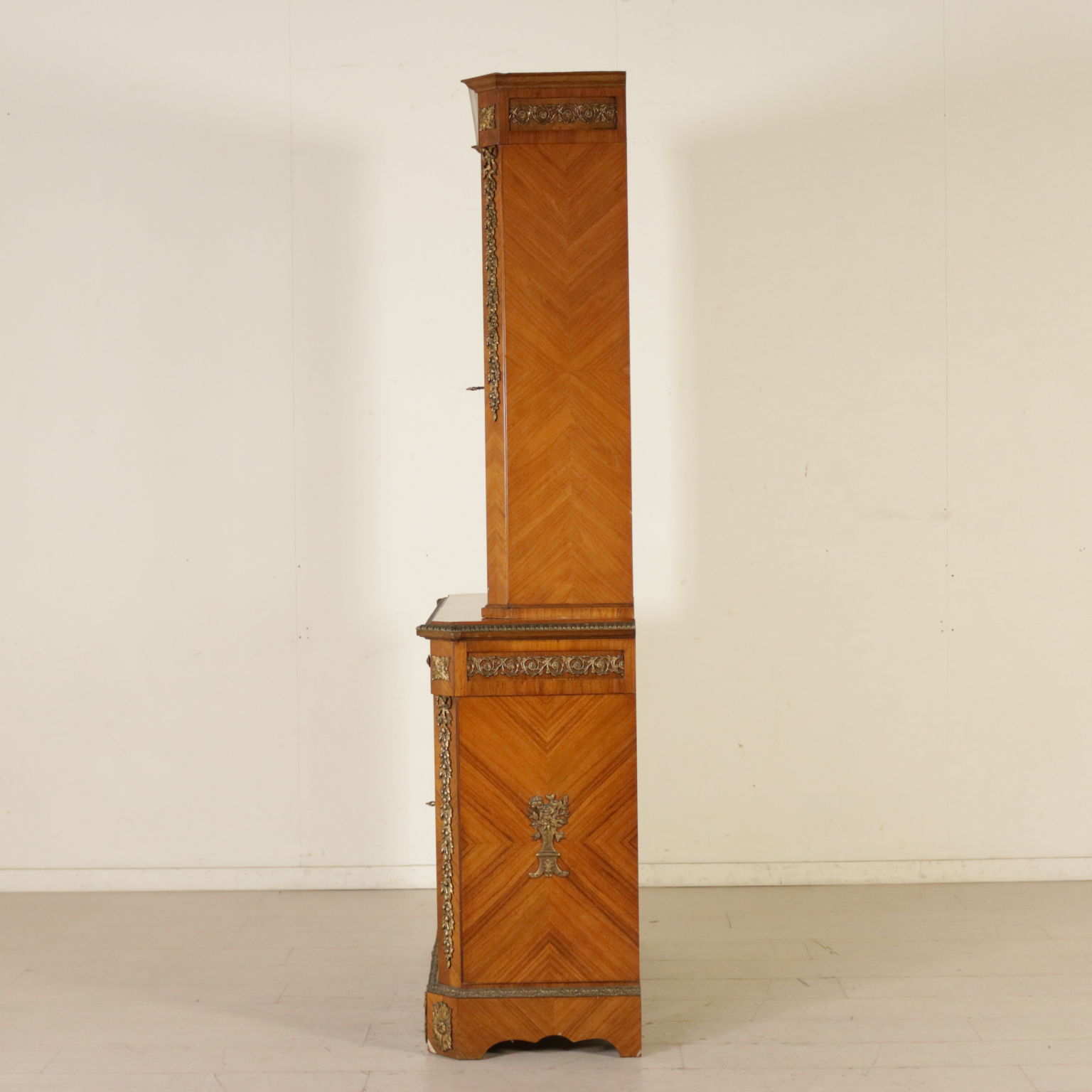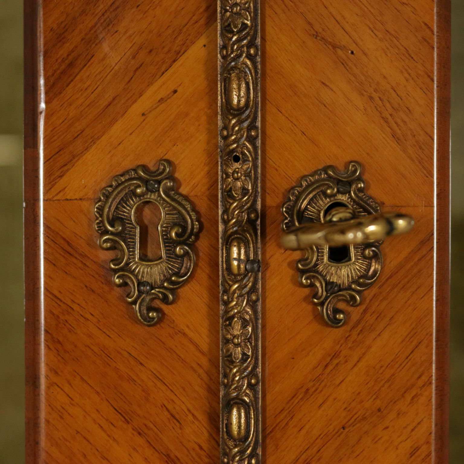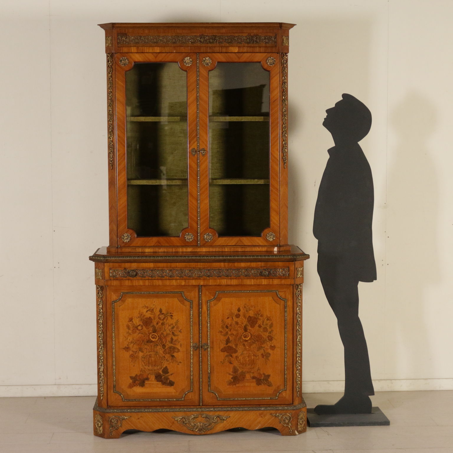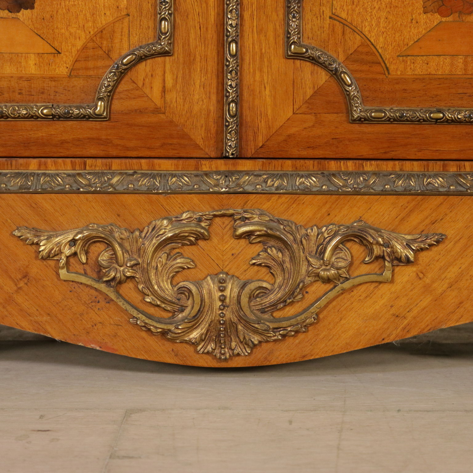 Aparador con dos puertas y un cajón, se ha planteado con dos puertas con vidrio. Los paneles de las puertas ricamente con incrustaciones. Cornisas y frisos de bronce.