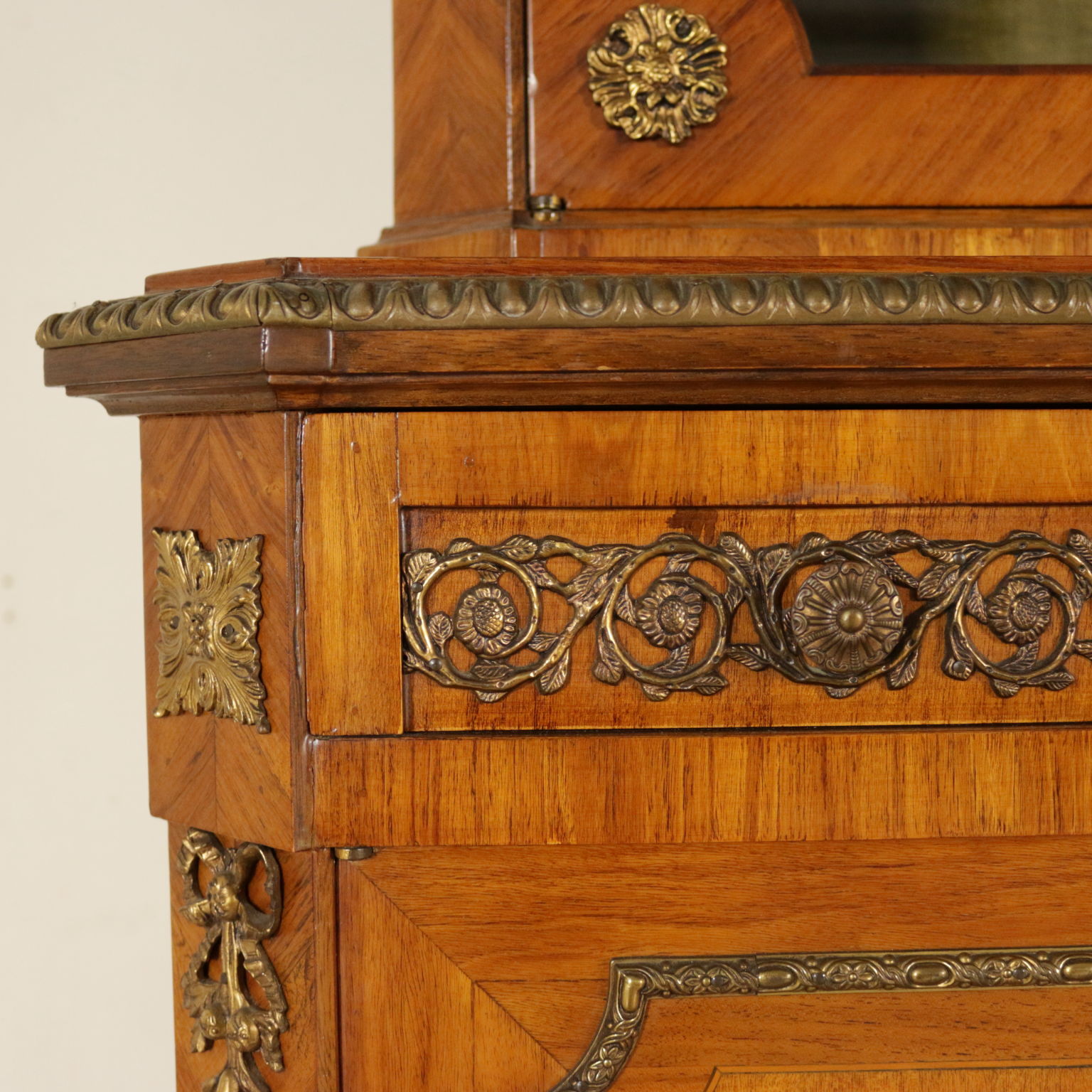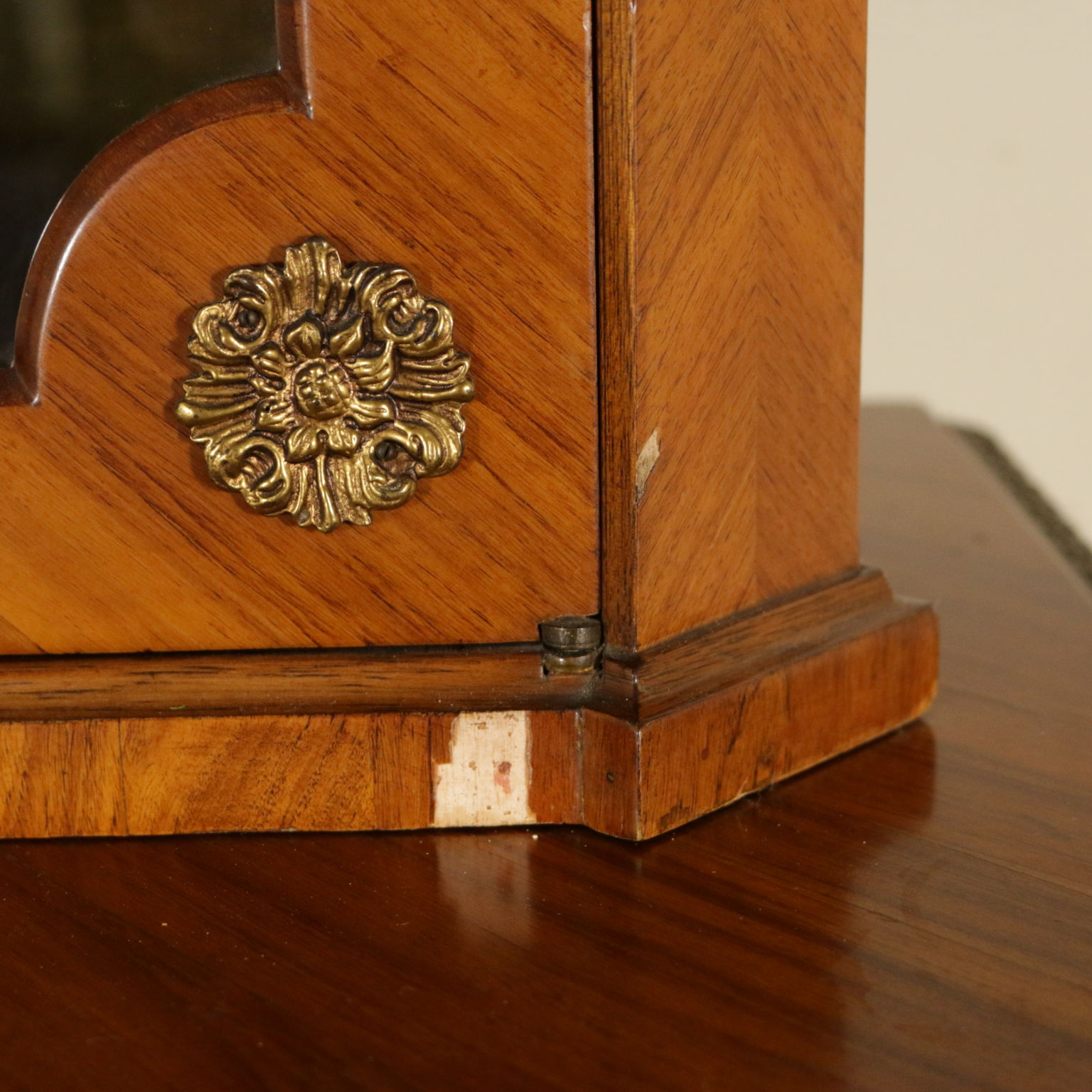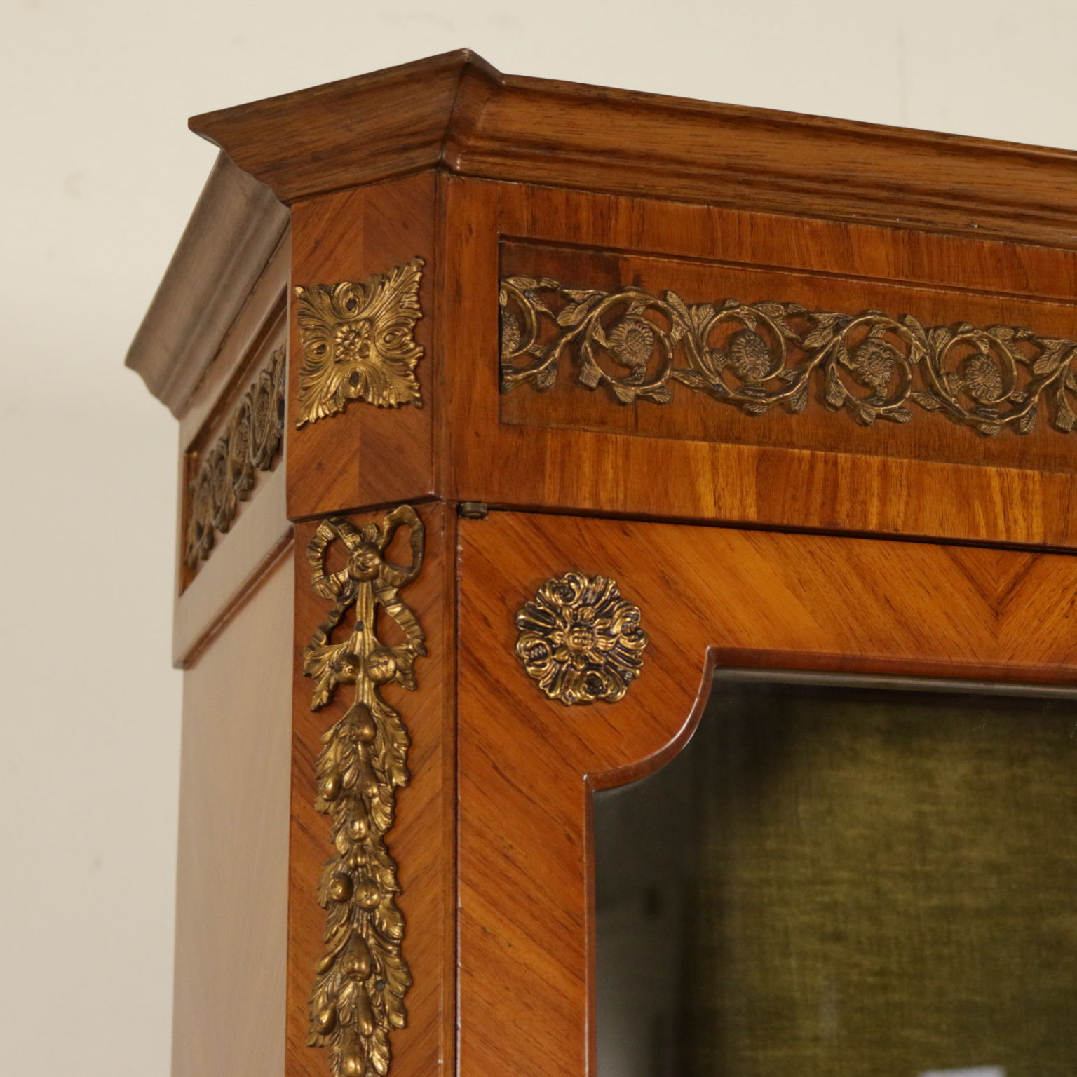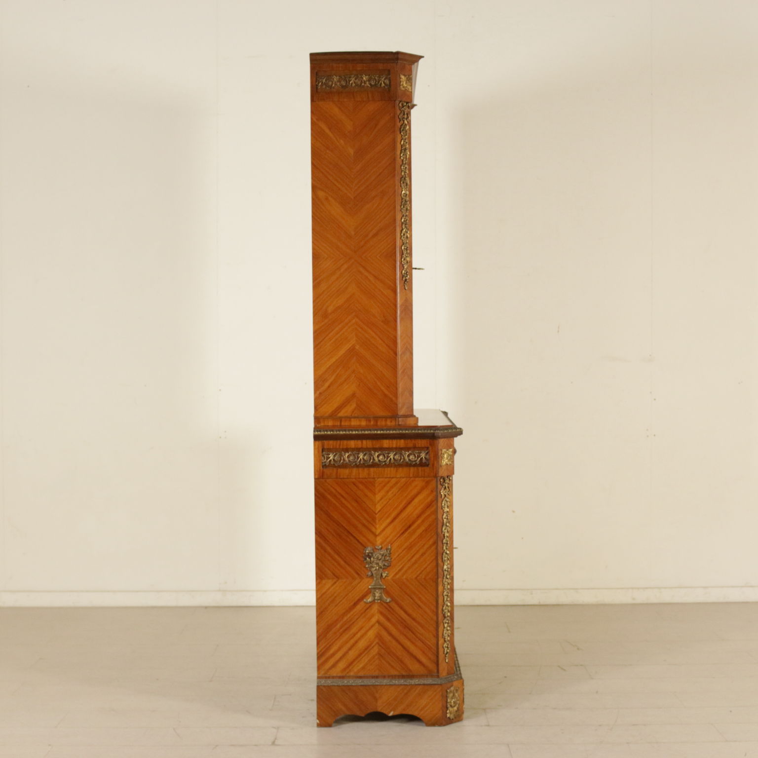 Aparador con dos puertas y un cajón, se ha planteado con dos puertas con vidrio. Los paneles de las puertas ricamente con incrustaciones. Cornisas y frisos de bronce.