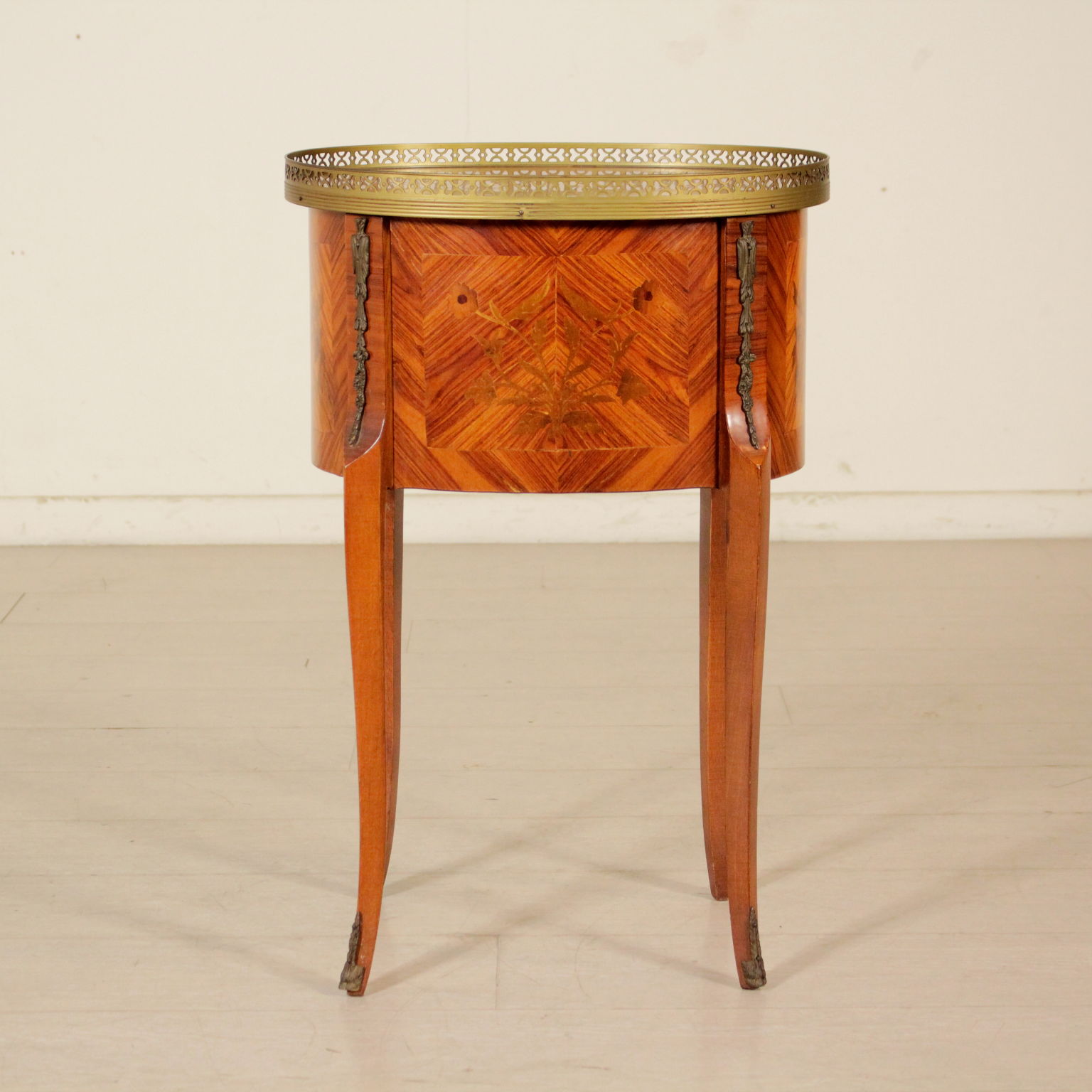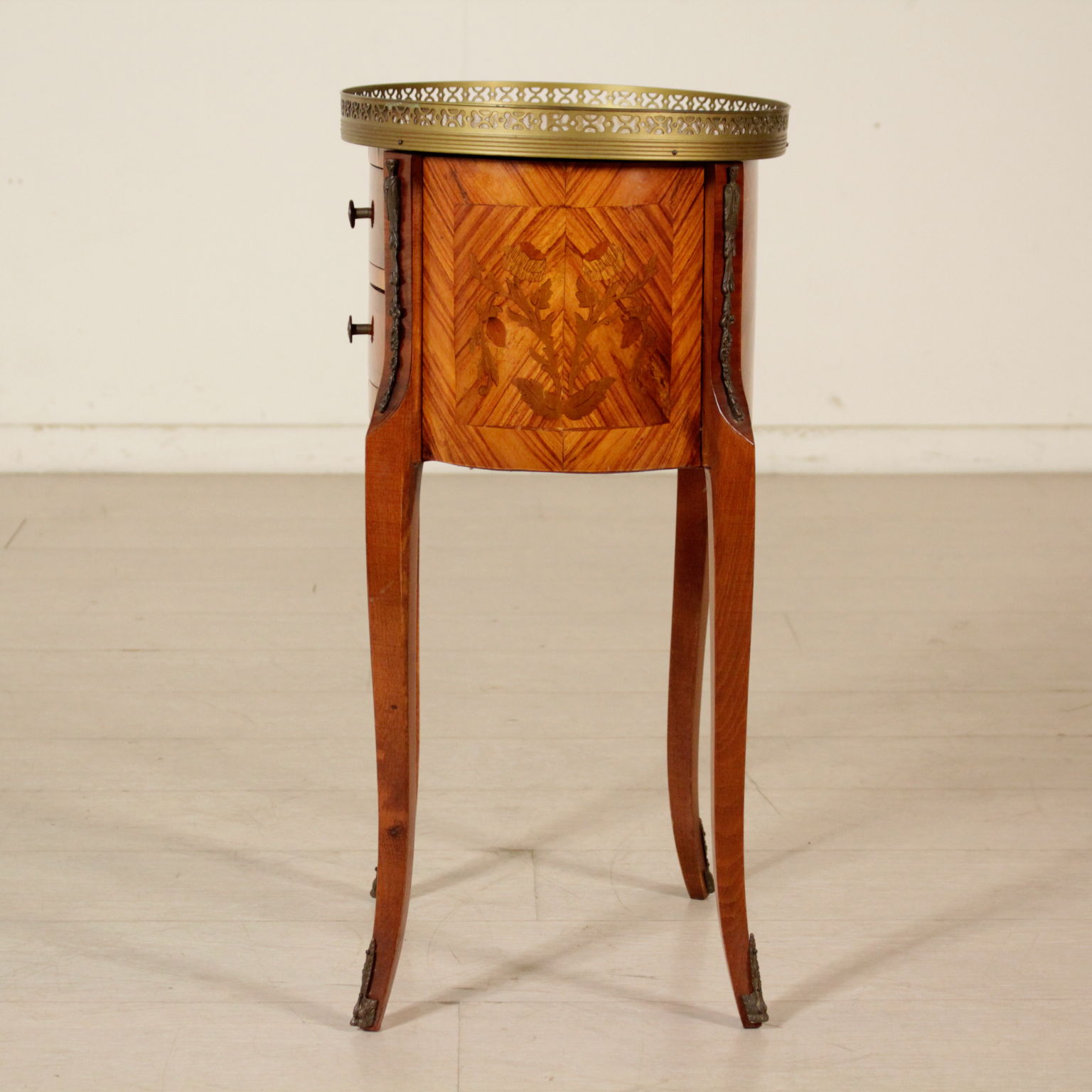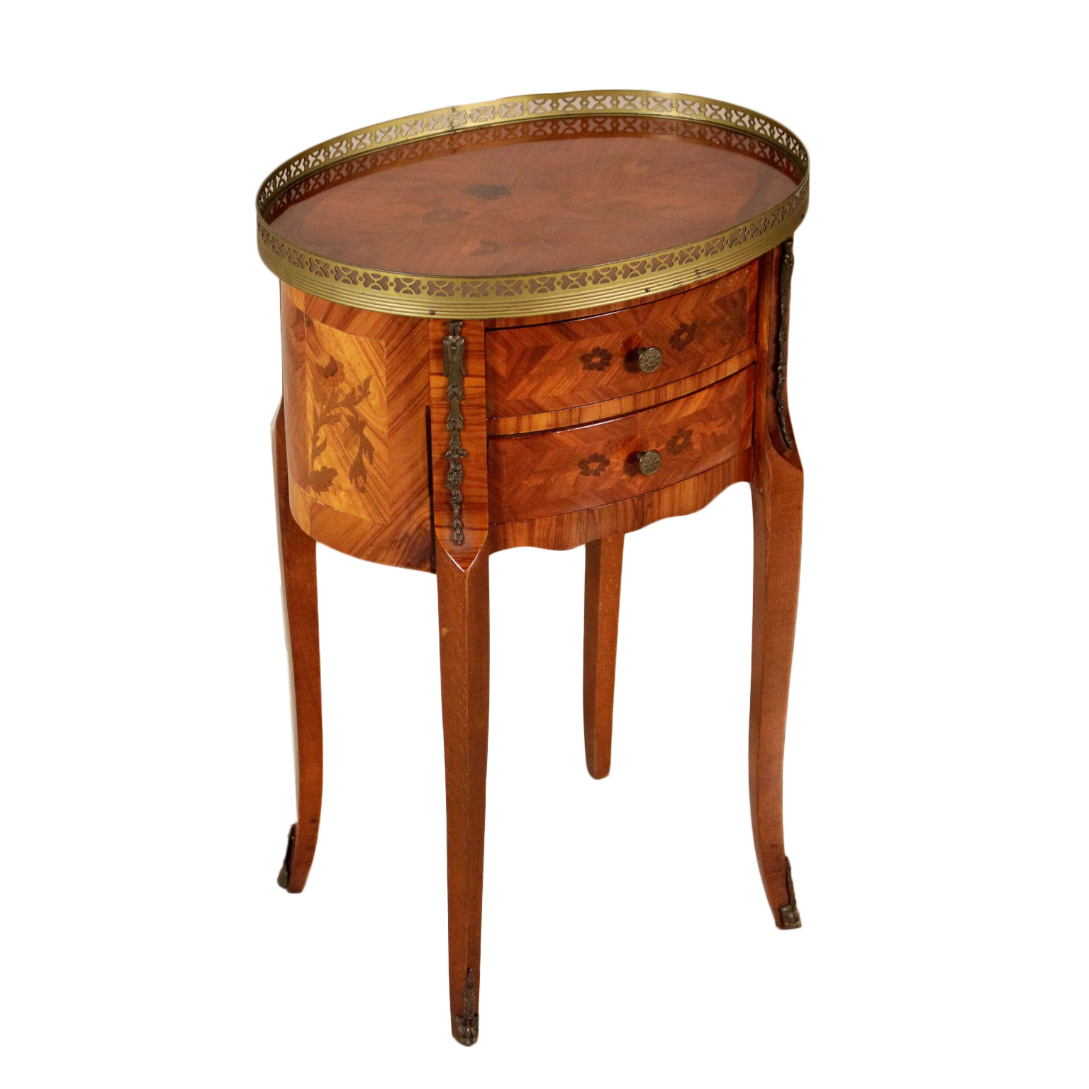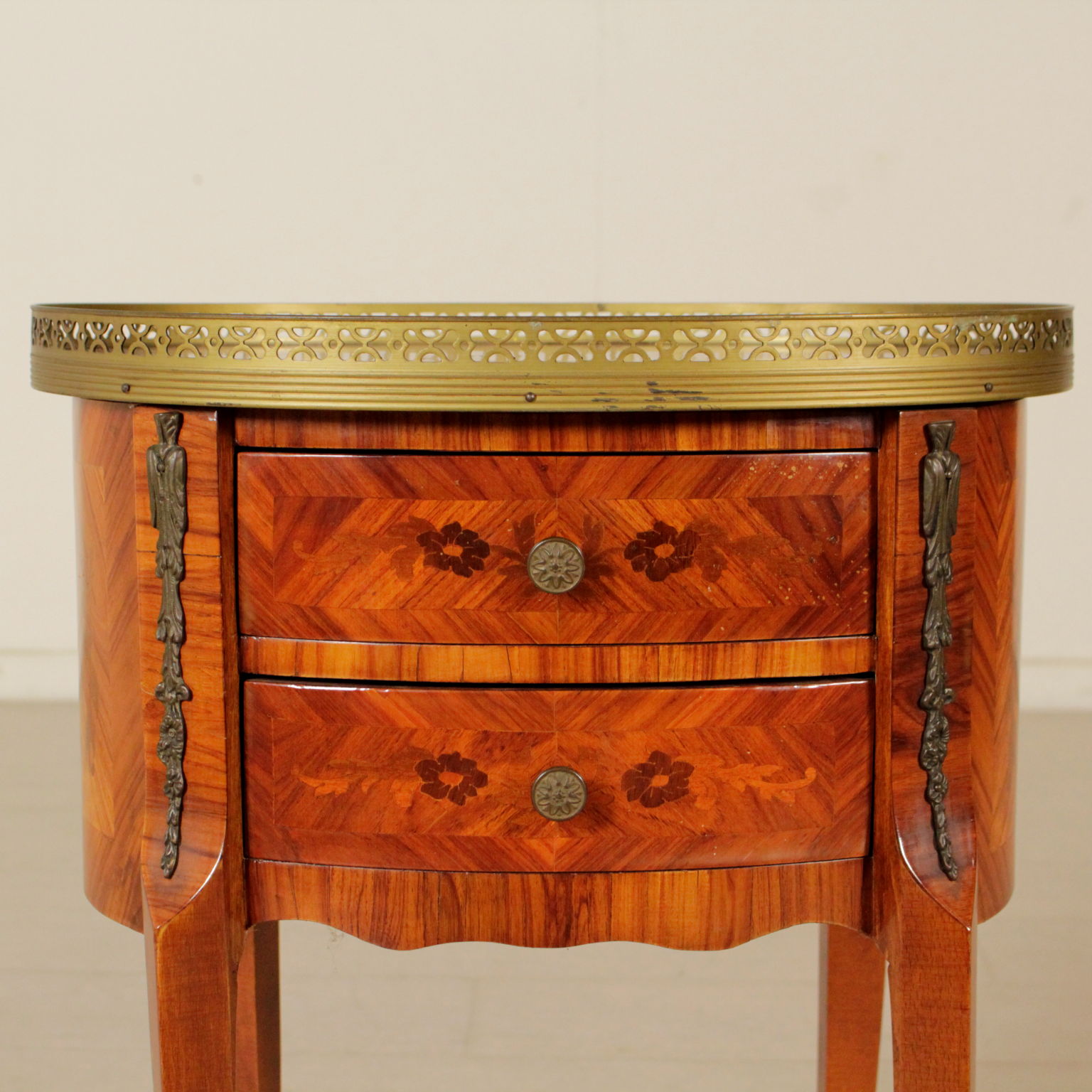 Apoyado por las piernas mueve cuenta con dos cajones. Parte superior ovalada con bordes de bronce. Floral incrustaciones.