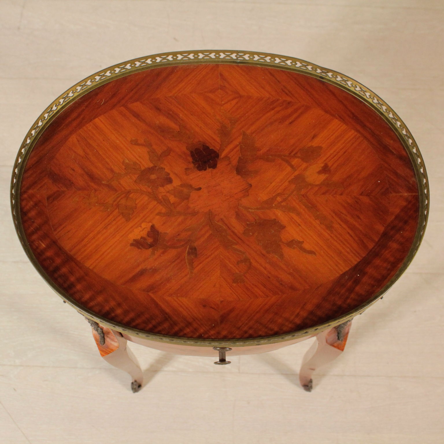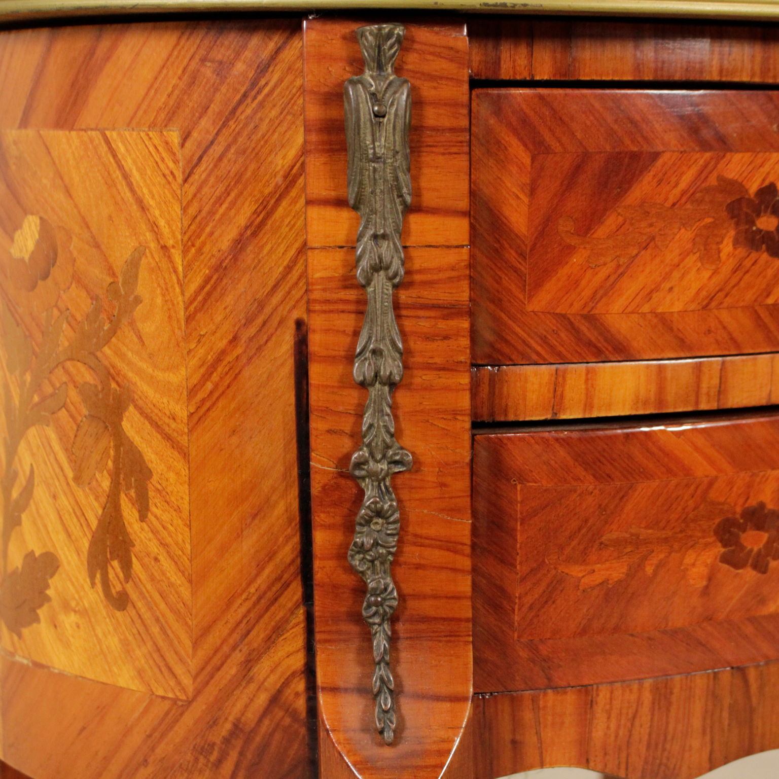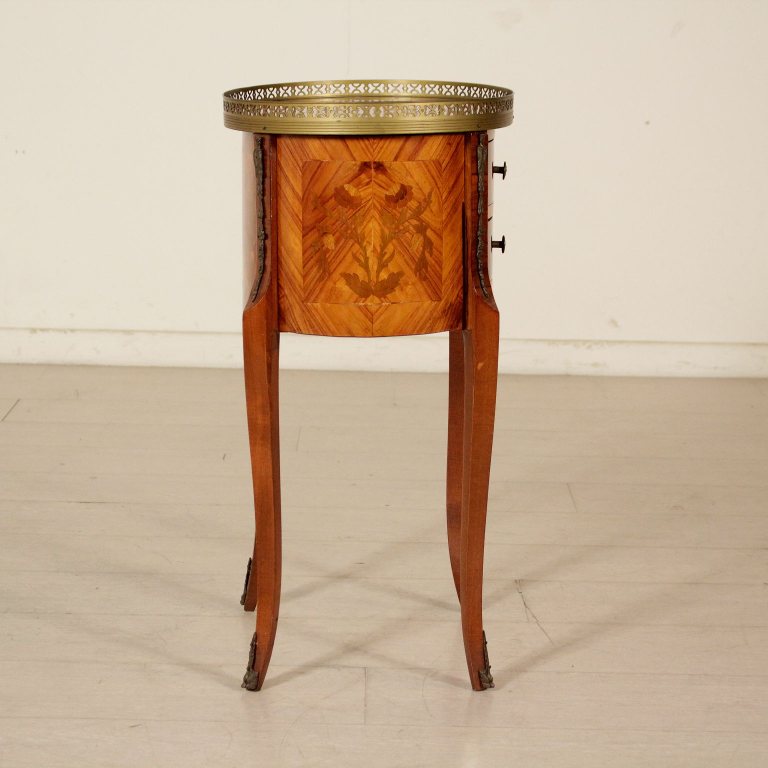 Apoyado por las piernas mueve cuenta con dos cajones. Parte superior ovalada con bordes de bronce. Floral incrustaciones.