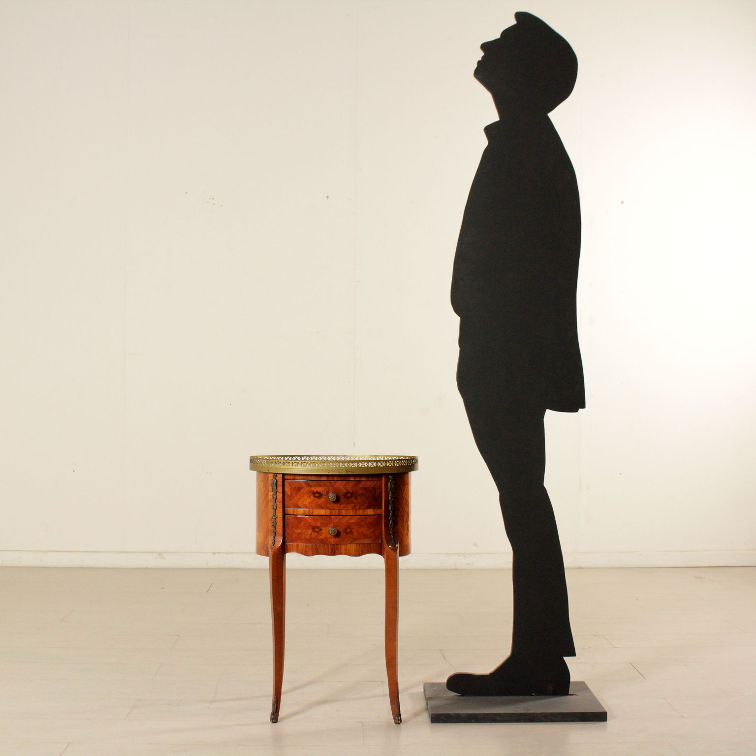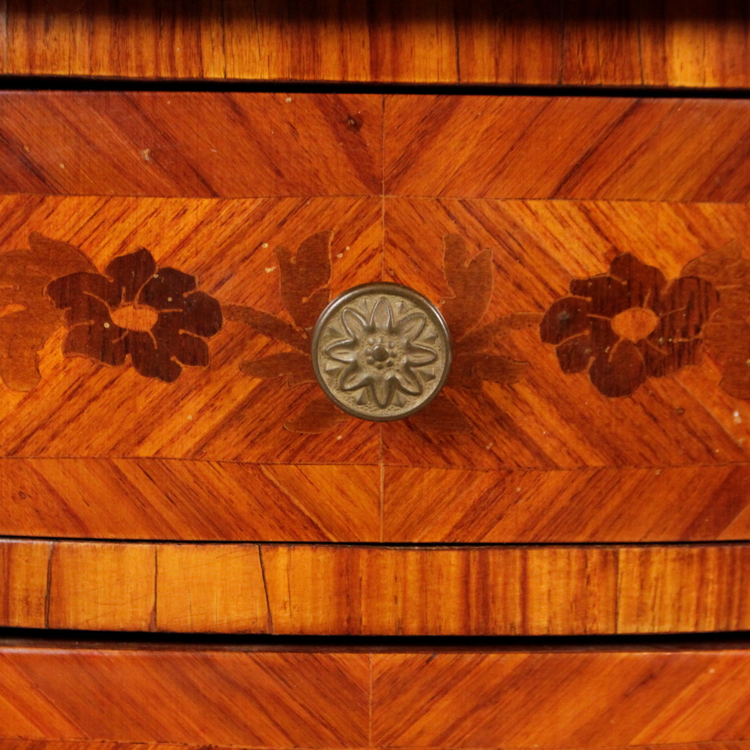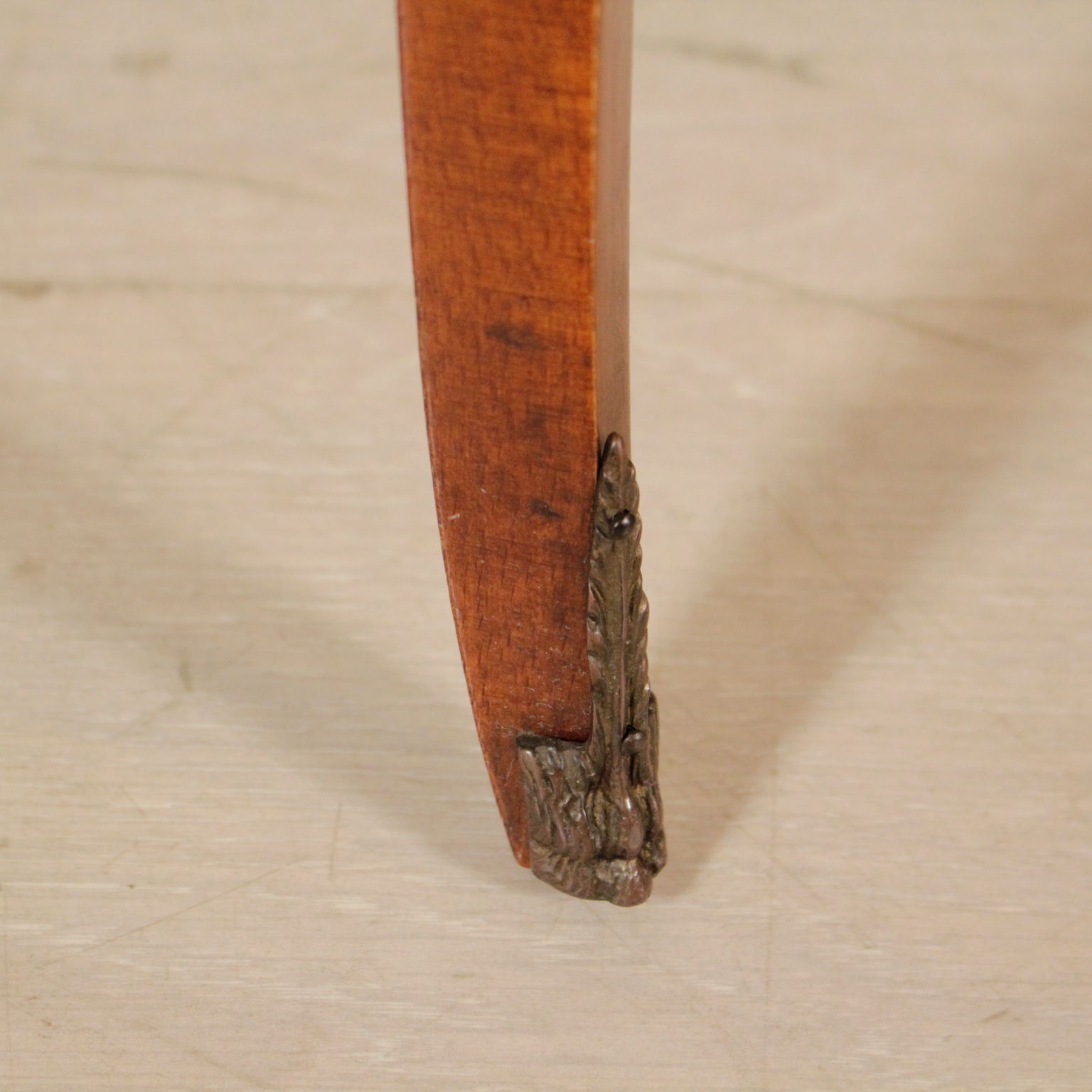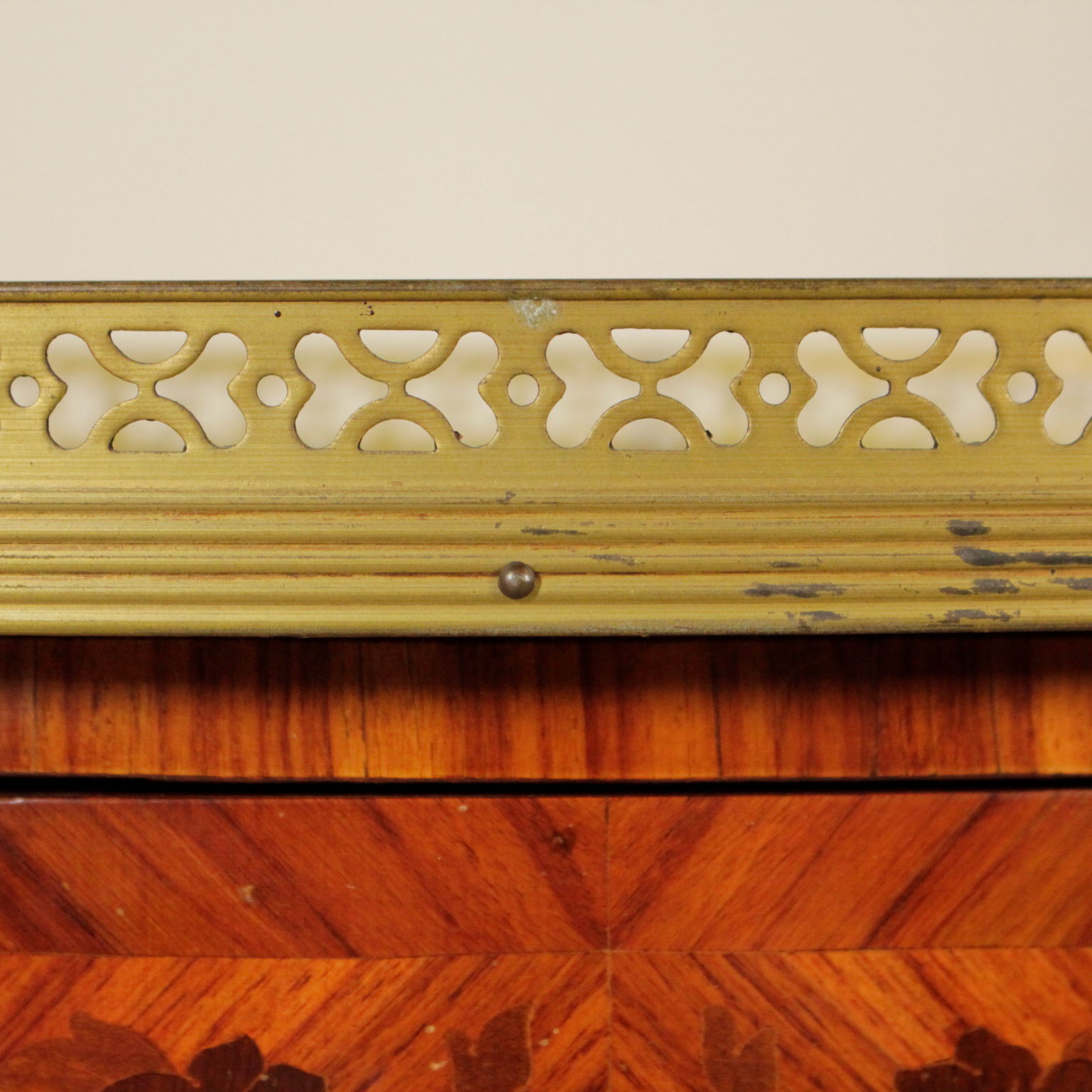 Apoyado por las piernas mueve cuenta con dos cajones. Parte superior ovalada con bordes de bronce. Floral incrustaciones.