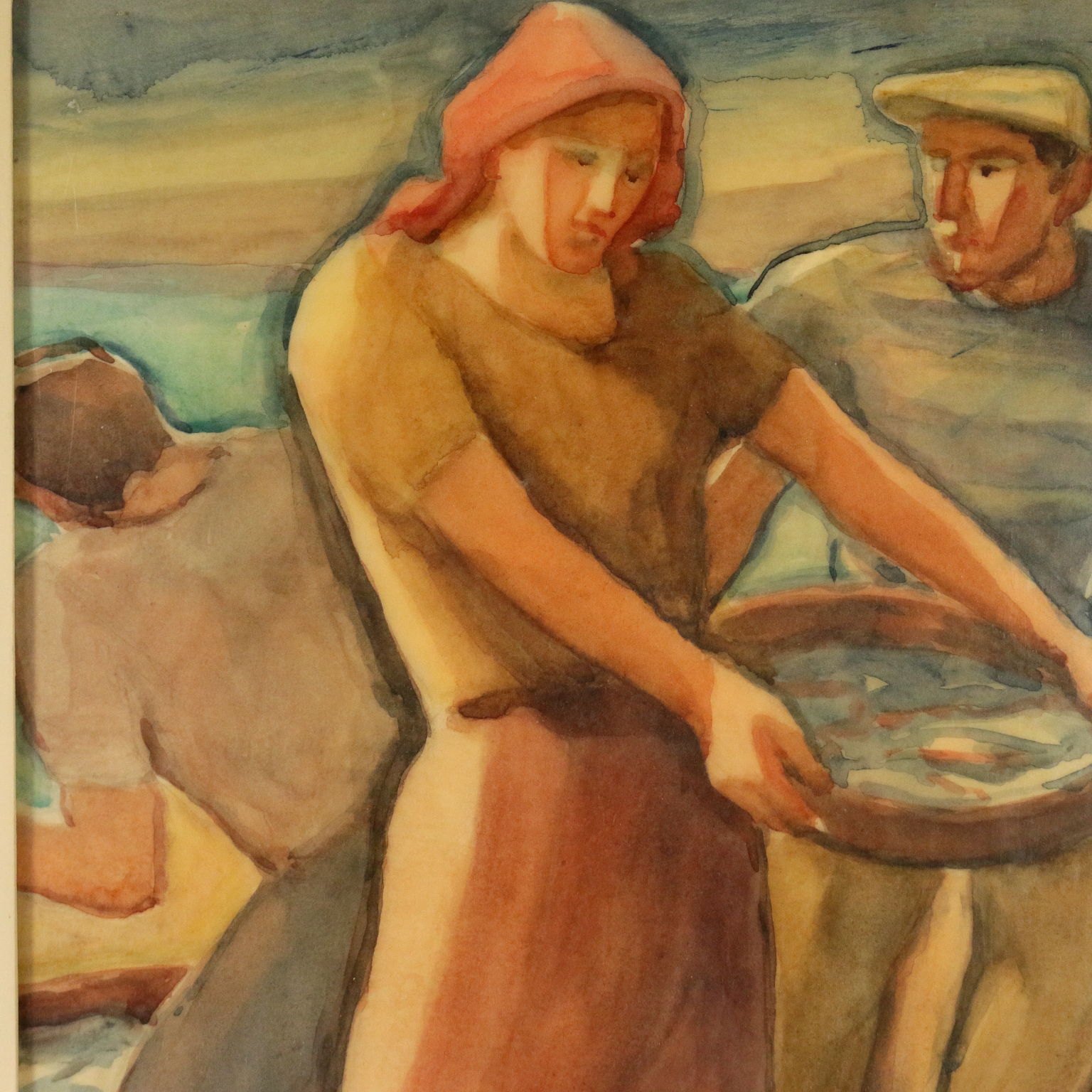 Acuarela de Virius De Savona - El rape y las figuras en la playa,1960