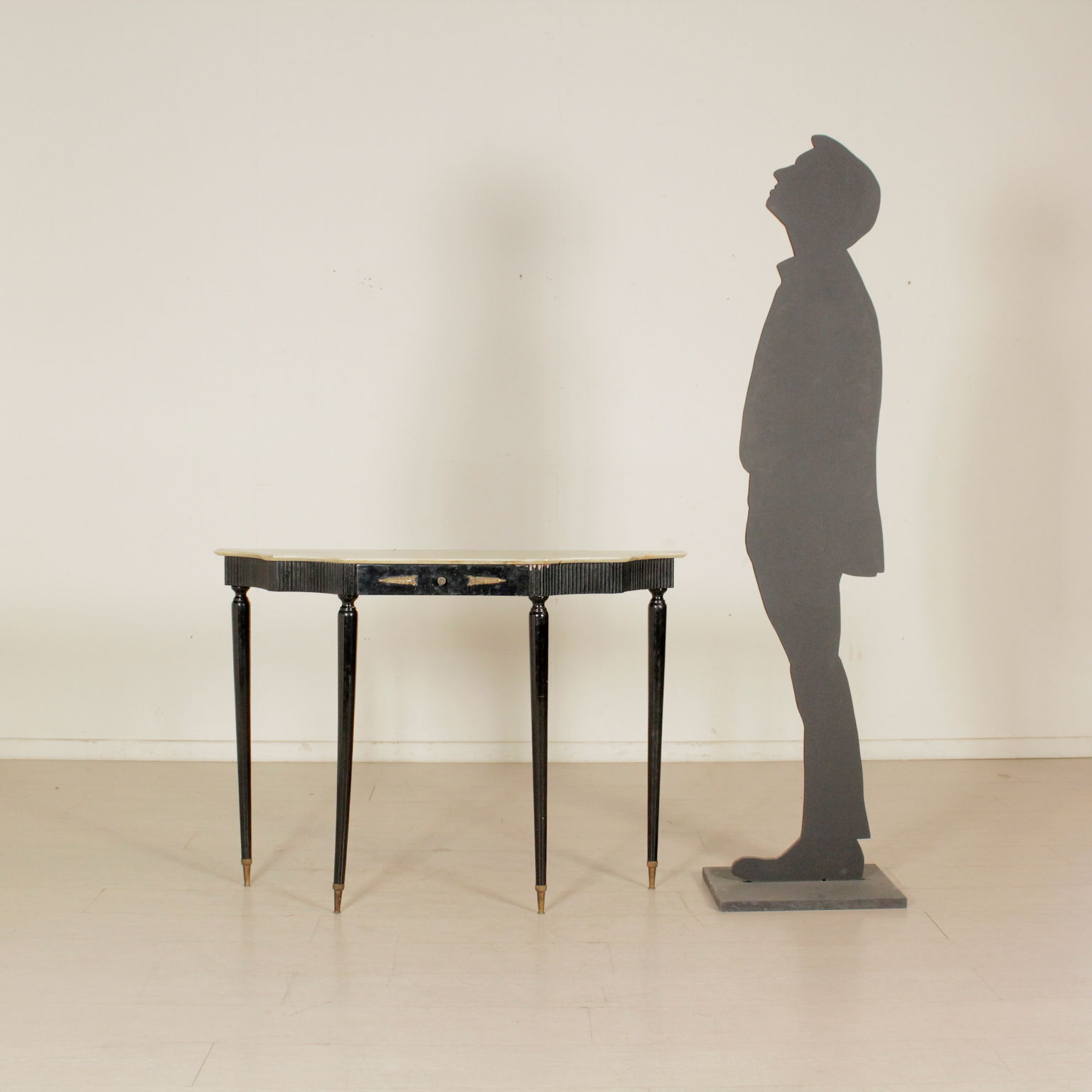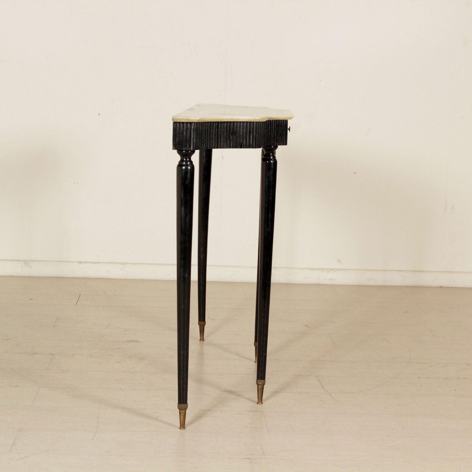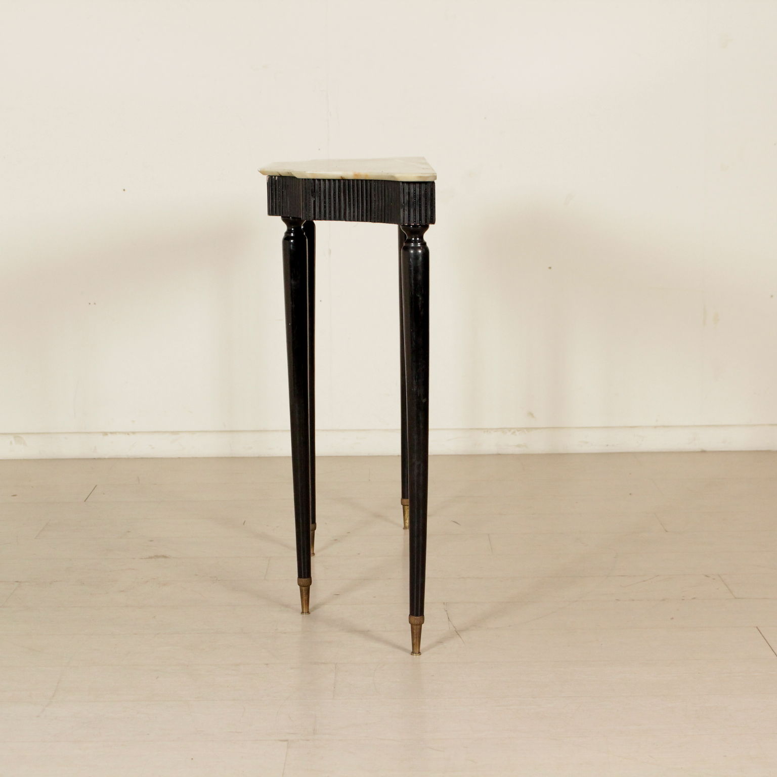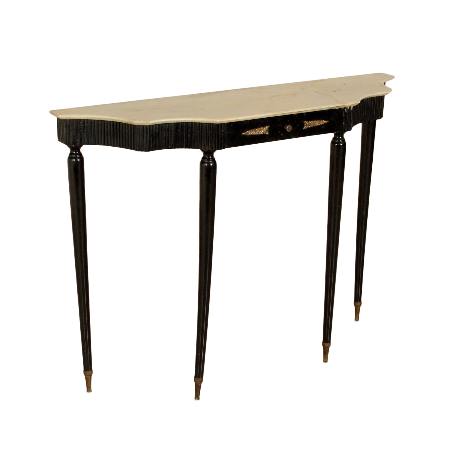 Consolle a muro con cassetto; legno tinto ebano, marmo, ottone.