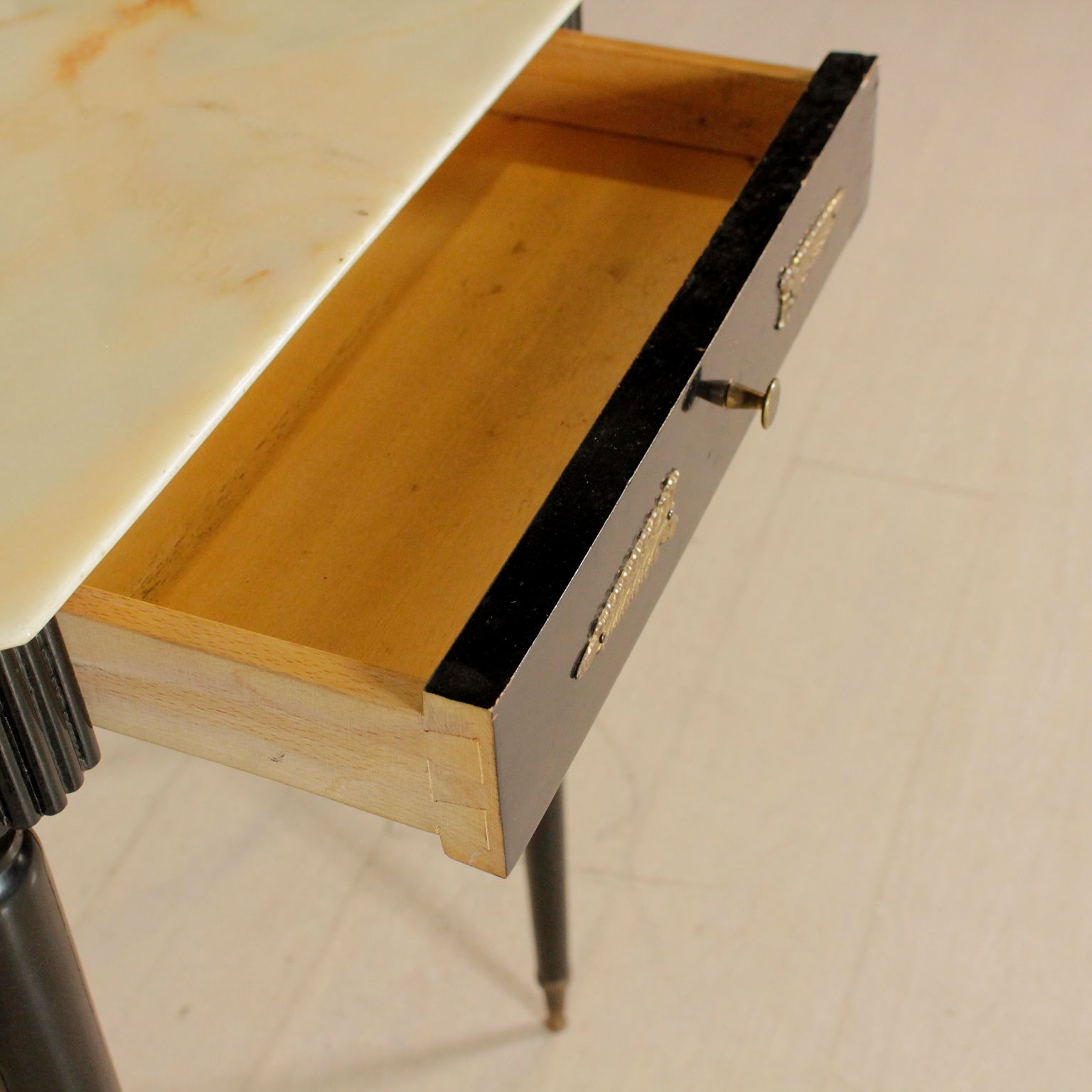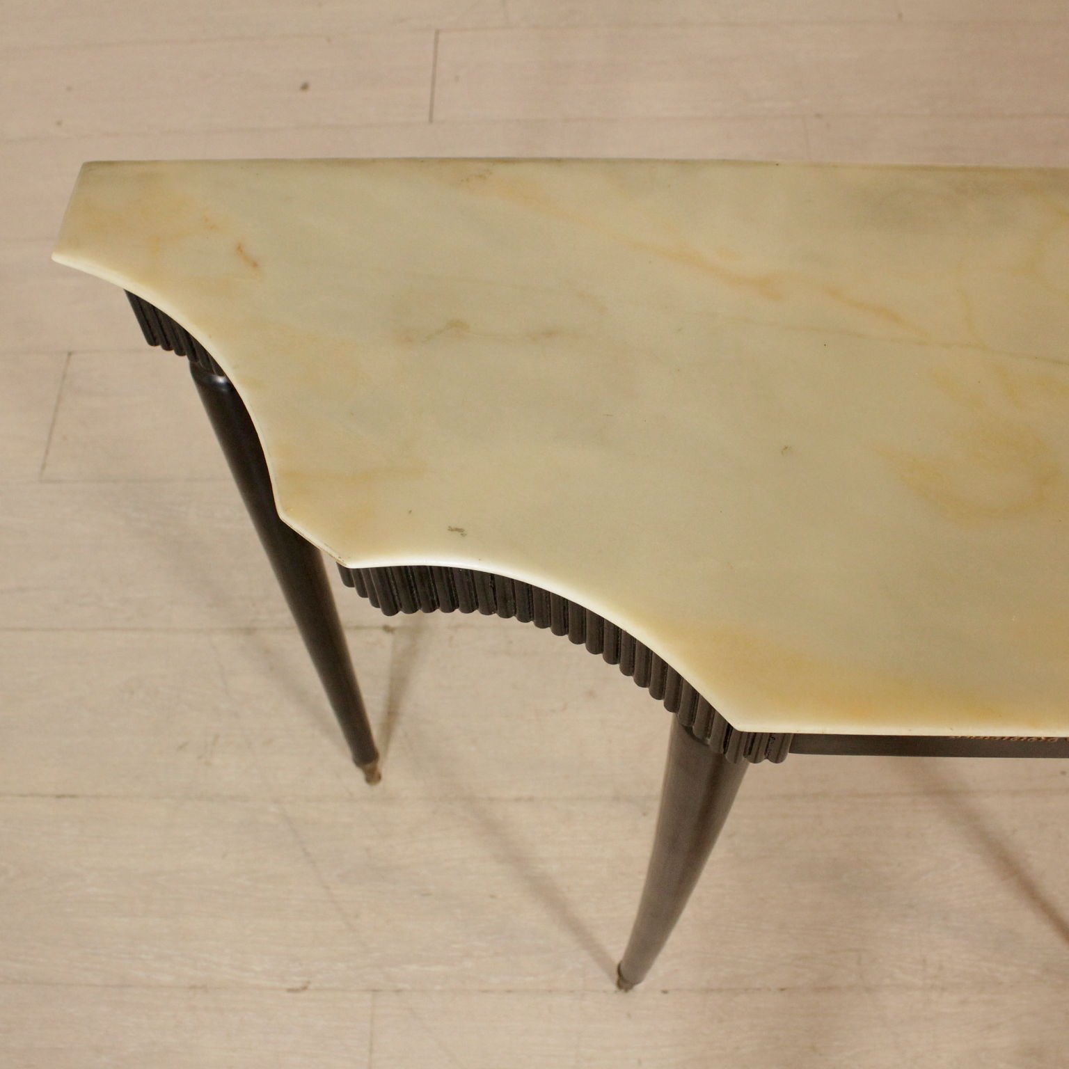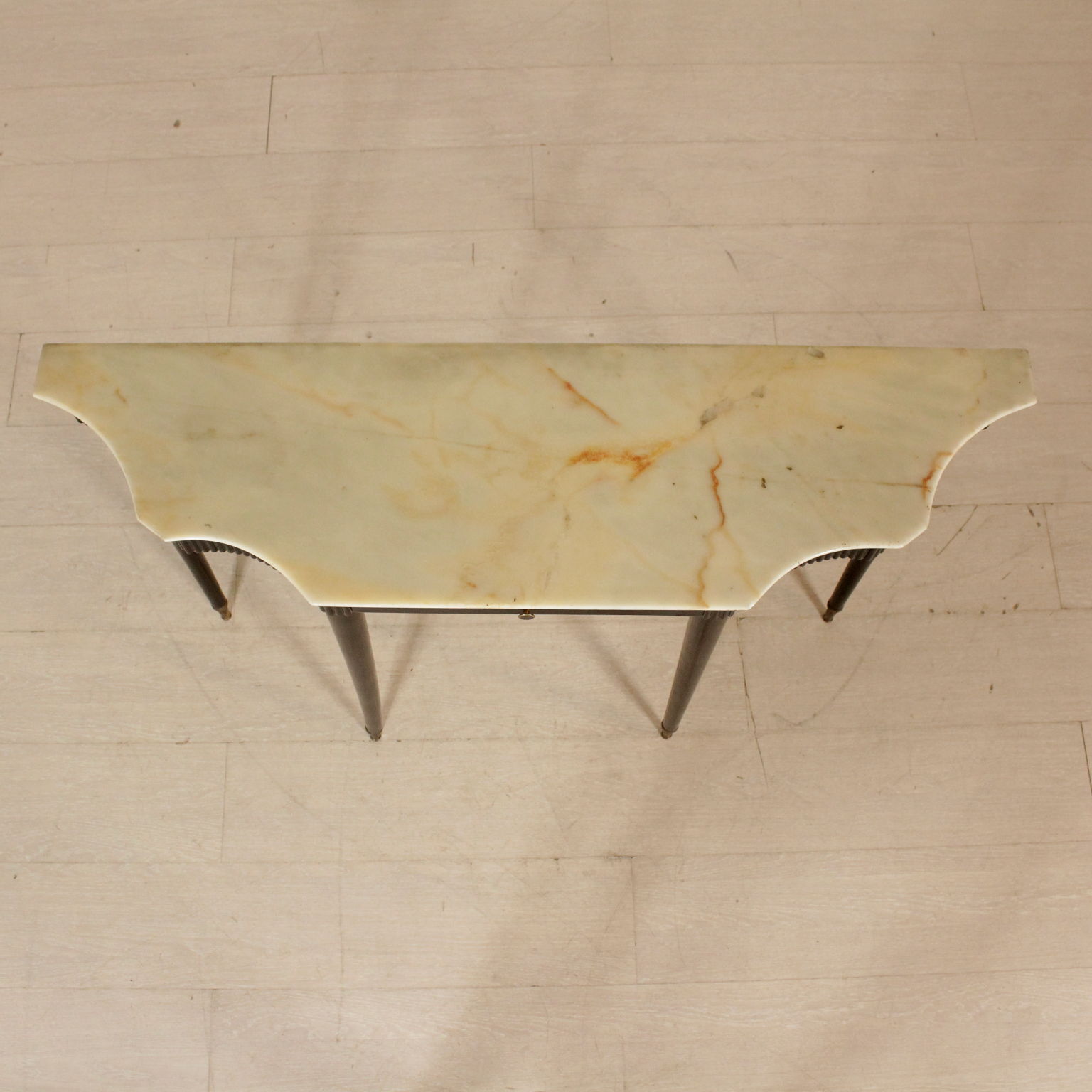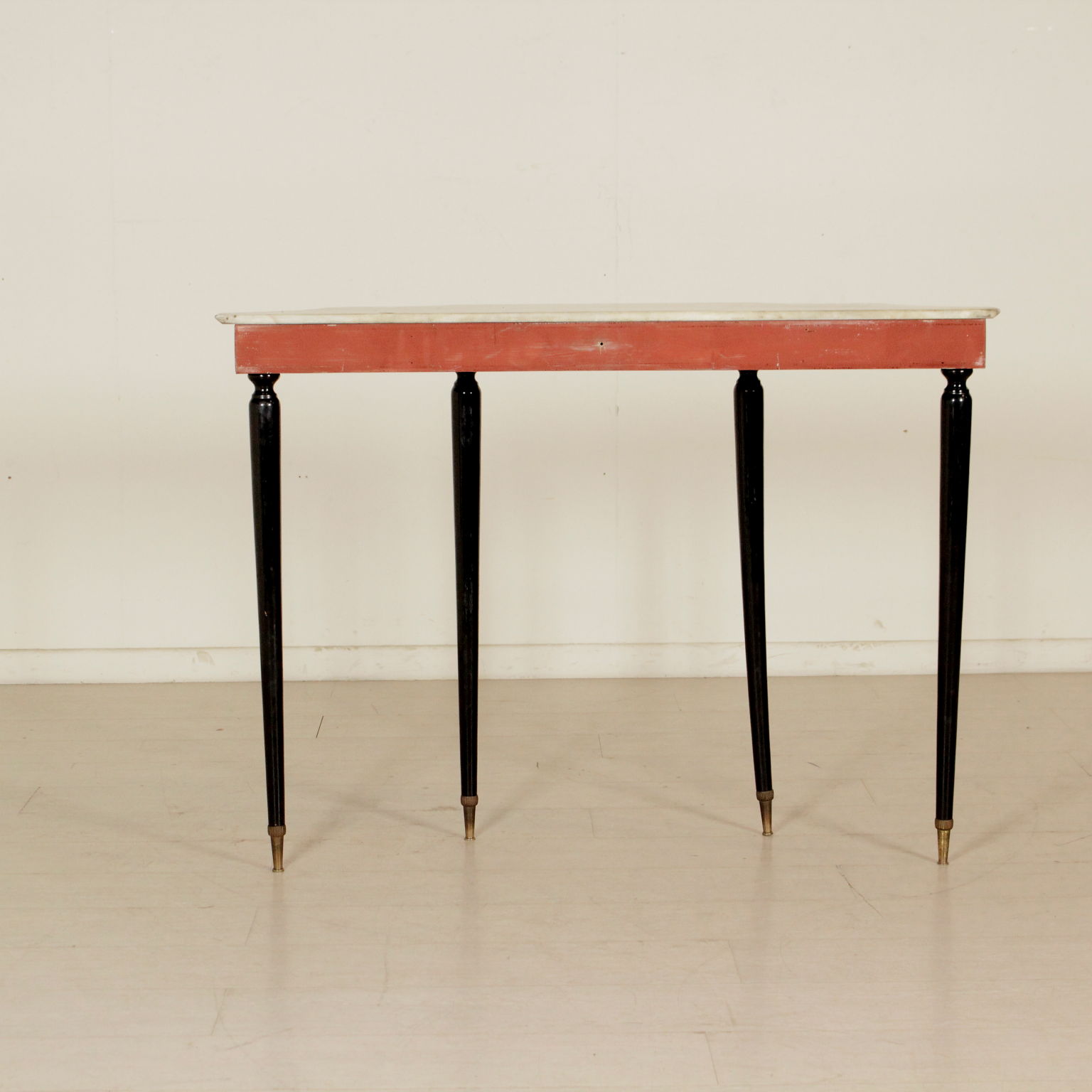 Consolle a muro con cassetto; legno tinto ebano, marmo, ottone.