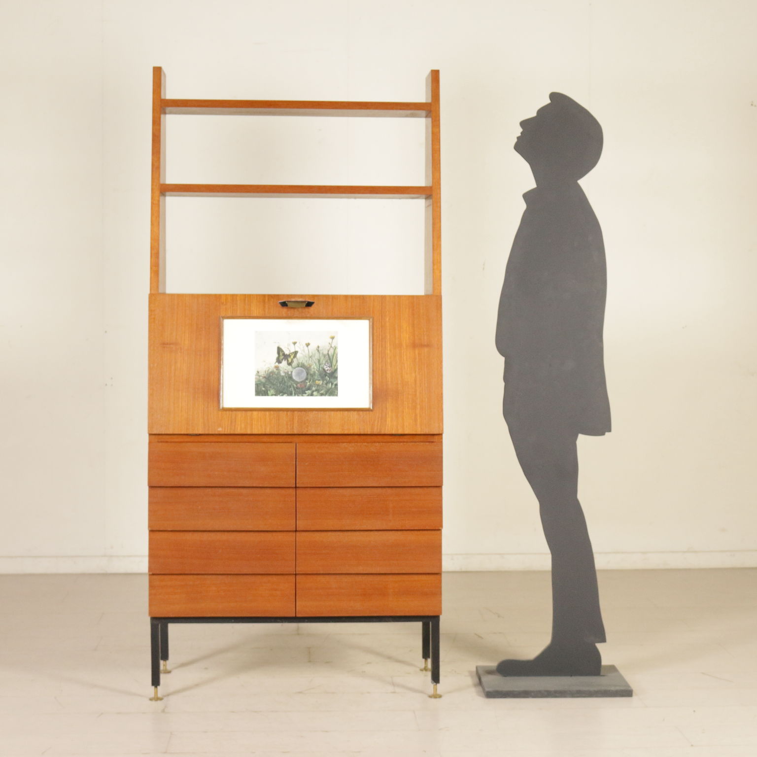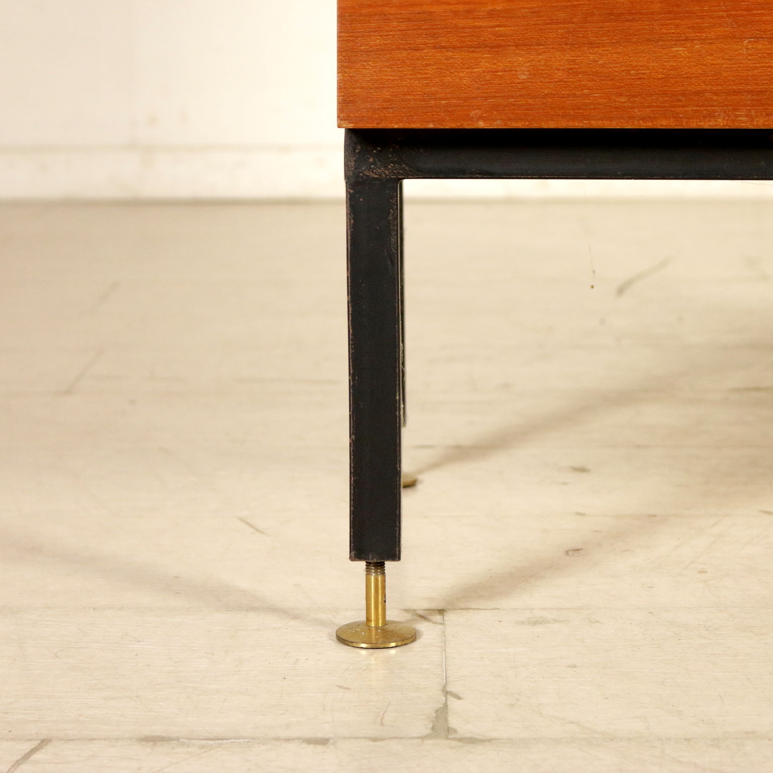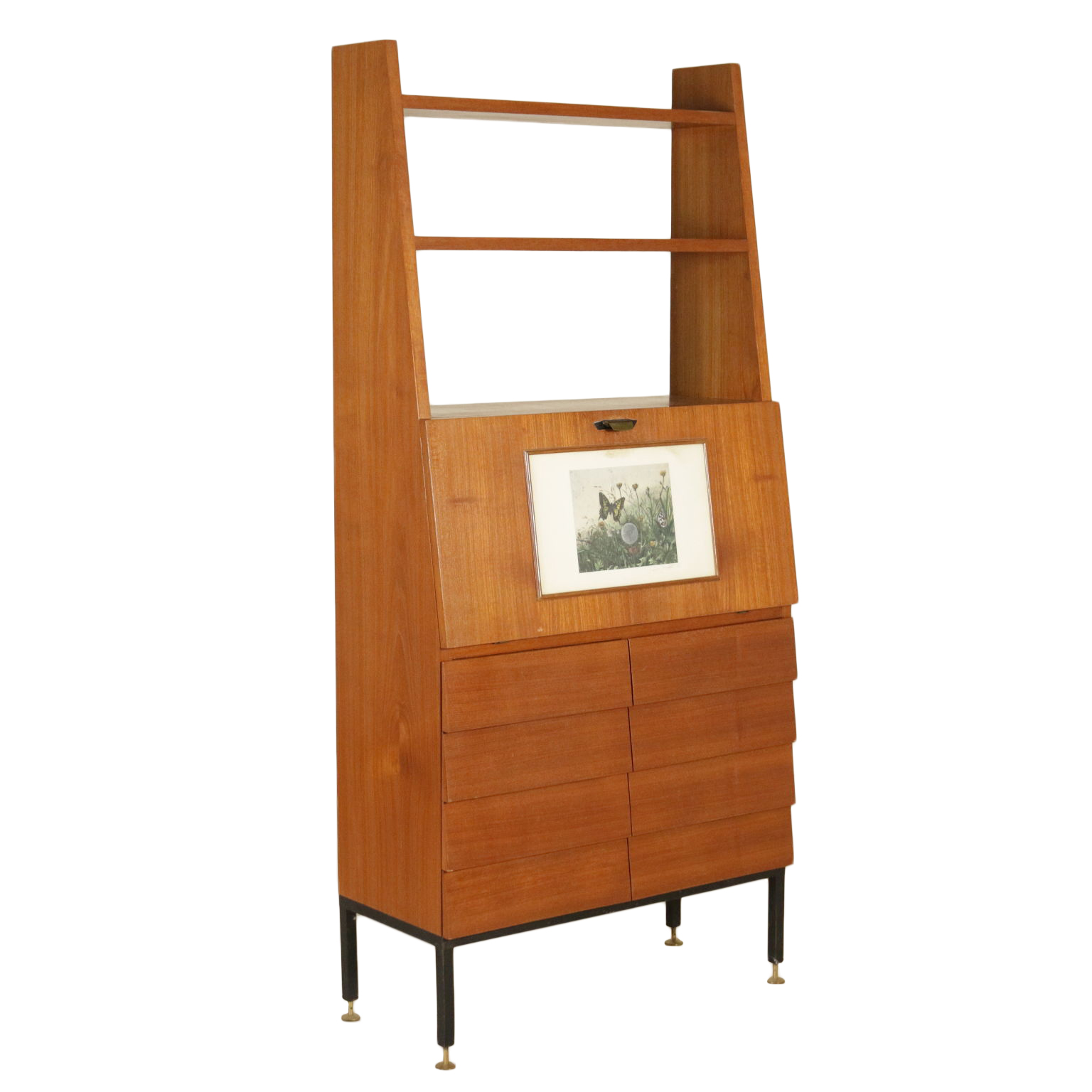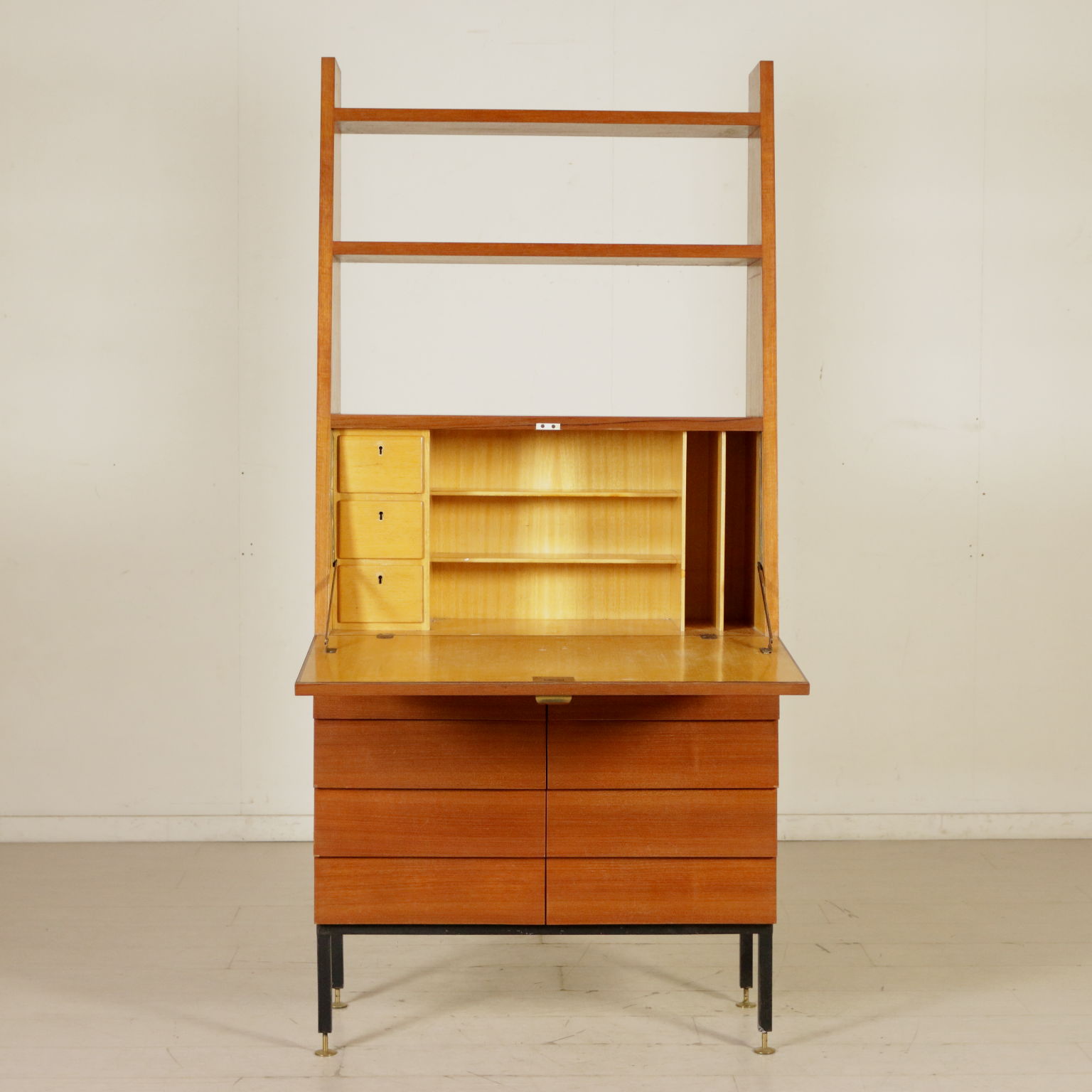 Escritorio móvil a la palestra y cajones; de chapa de madera de teca, las piernas y la manija del metal y latón.