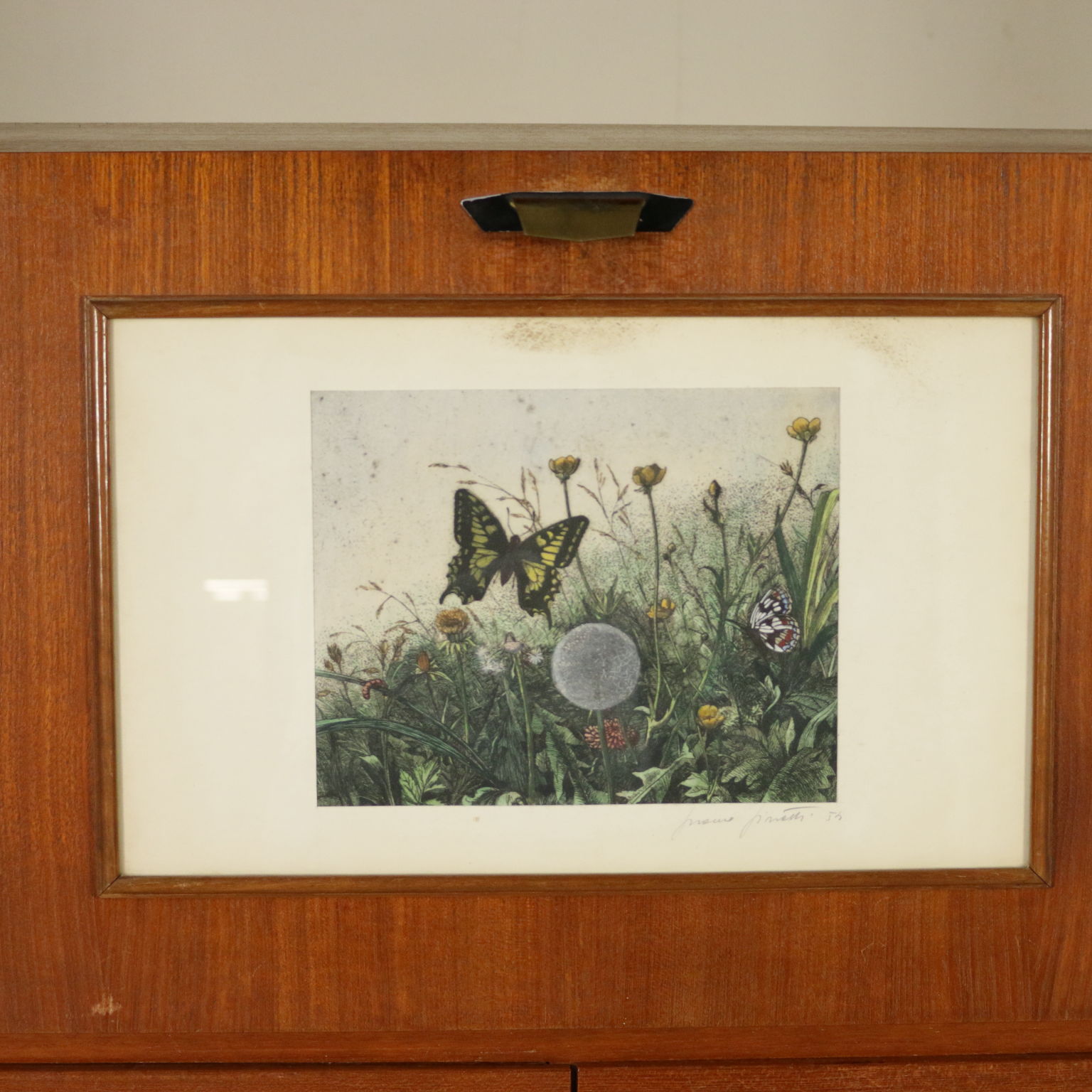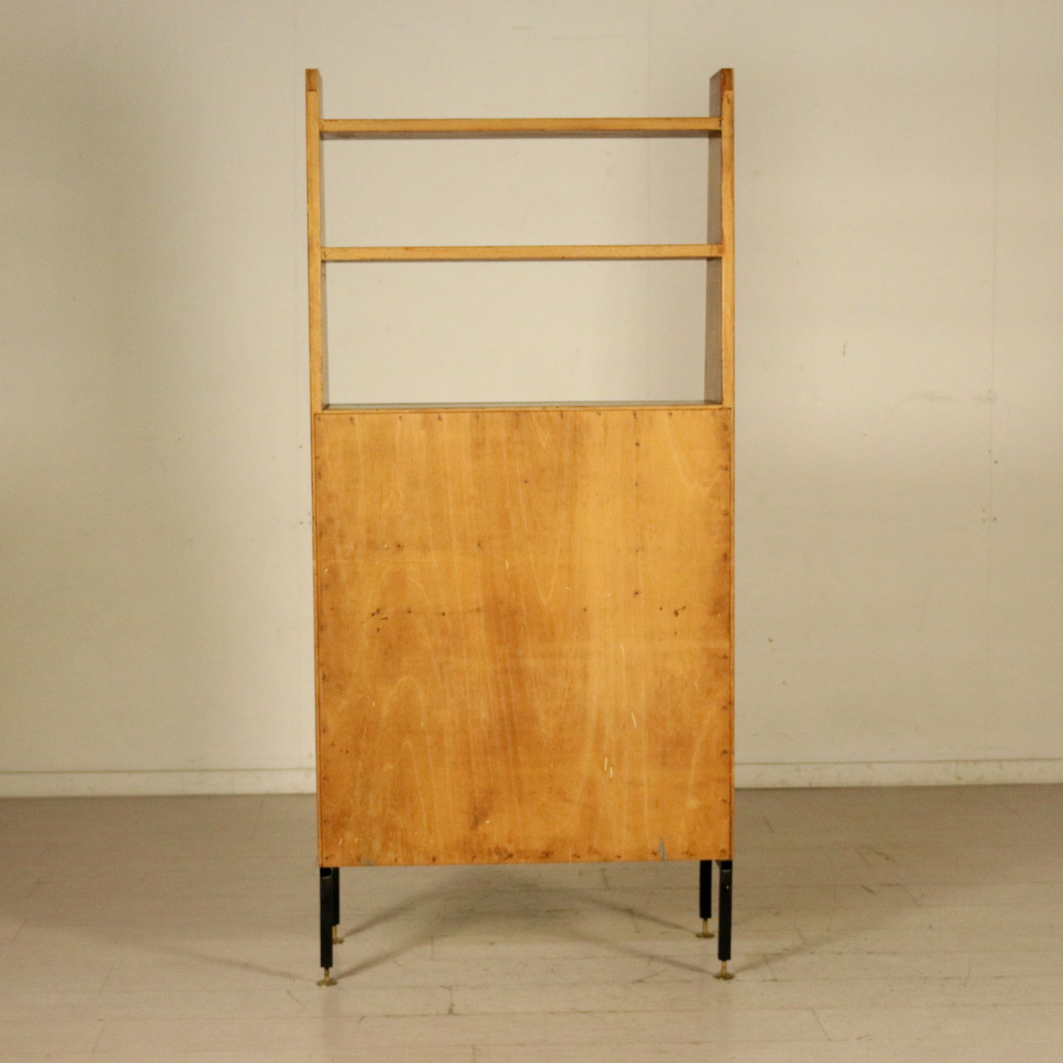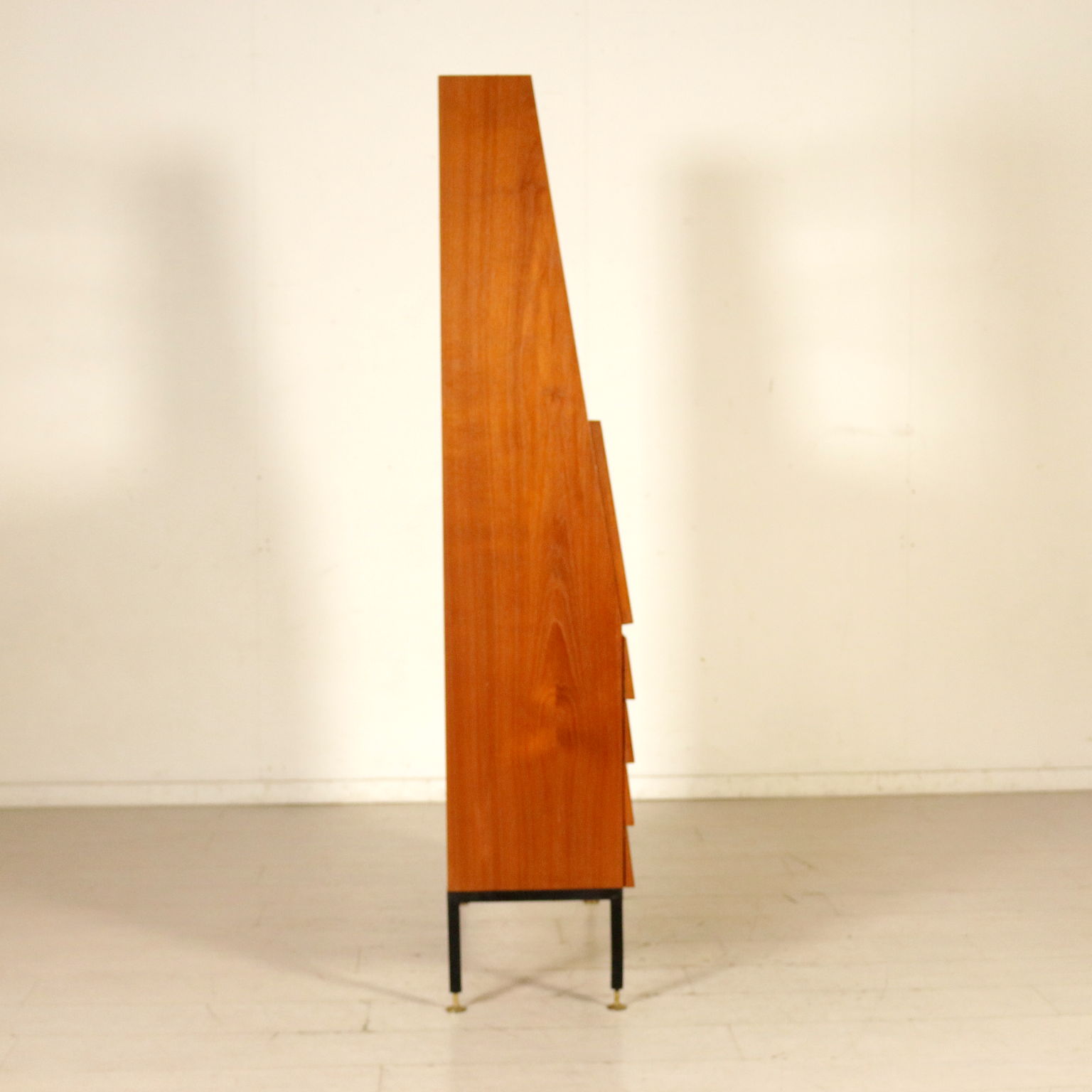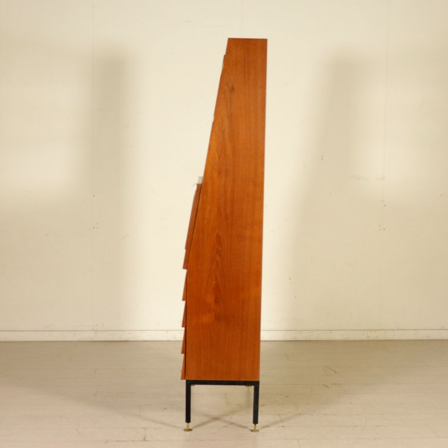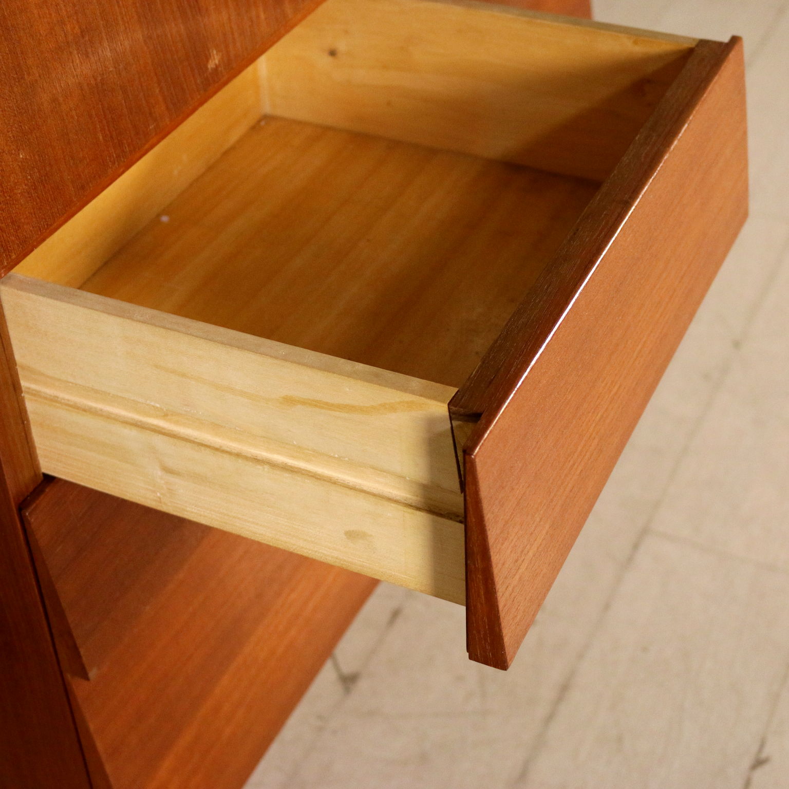Escritorio móvil a la palestra y cajones; de chapa de madera de teca, las piernas y la manija del metal y latón.